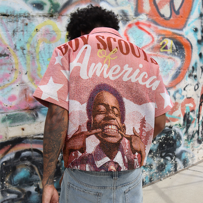Boy Scout Tapestry Print Short Sleeve Button Lapel Jacket