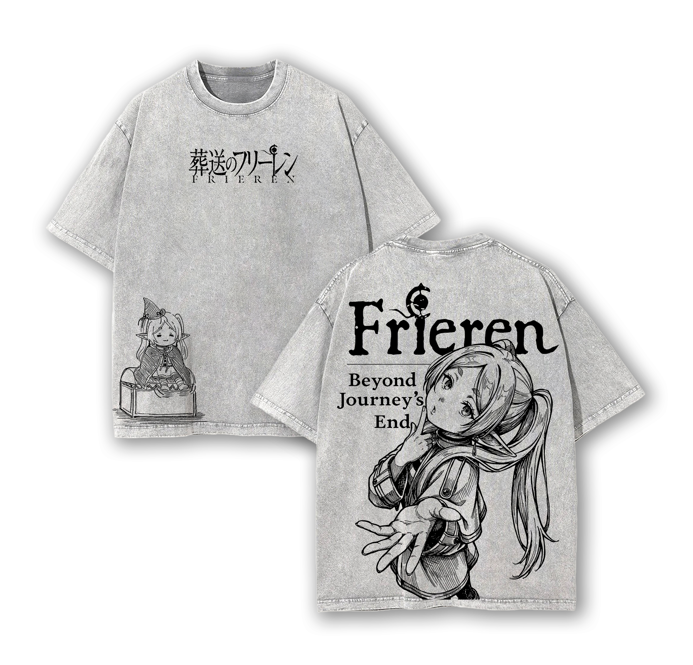 Frieren Beyond Journey’s End Hoodie & Tee Washed, Vintage Washed Heavy Cotton Oversized Anime Manga Hoodie T-Shirt Set, Retro Unisex Streetwear Graphic Top, Fantasy Healing Journey Edition, Japanese Anime Merch