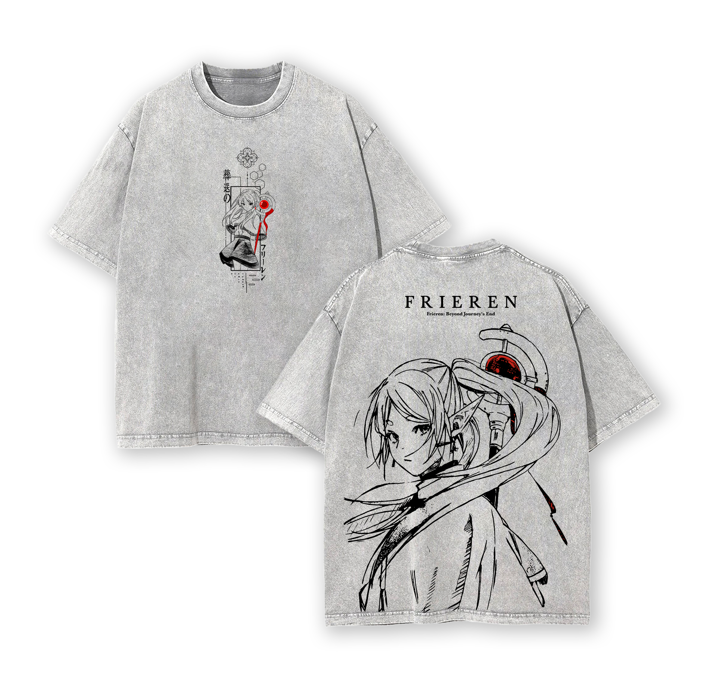 Frieren and Fern 'Beyond Journey's End' Anime Double Printed Acid Wash Tee Unisex Oversize Heavyweight Cotton T-shirt for Anime Fans and Lovers