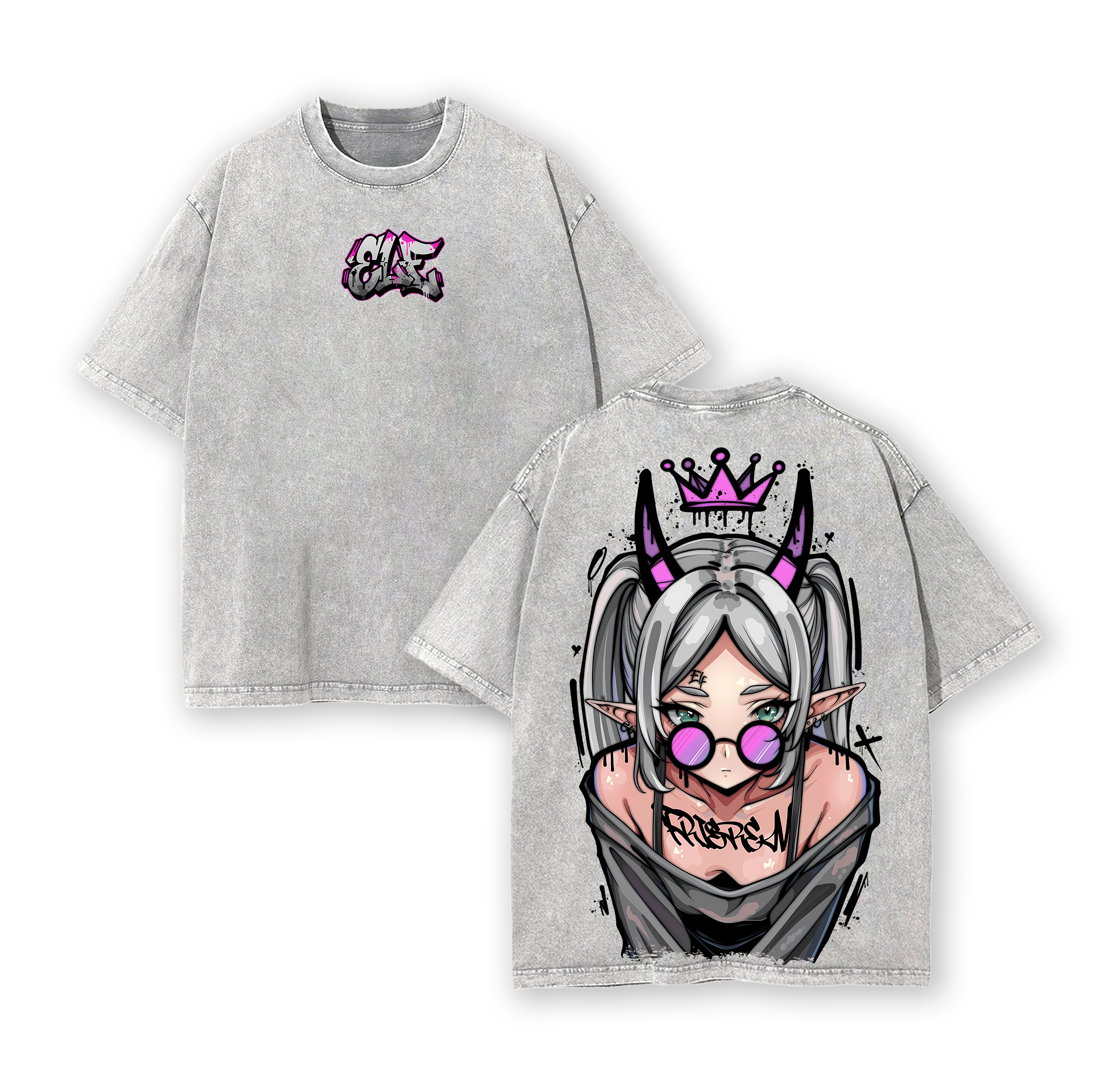 Frieren Streetwear Vintage Washed Anime T-Shirt | Demon Elf Girl Purple Crown Graphic Tee