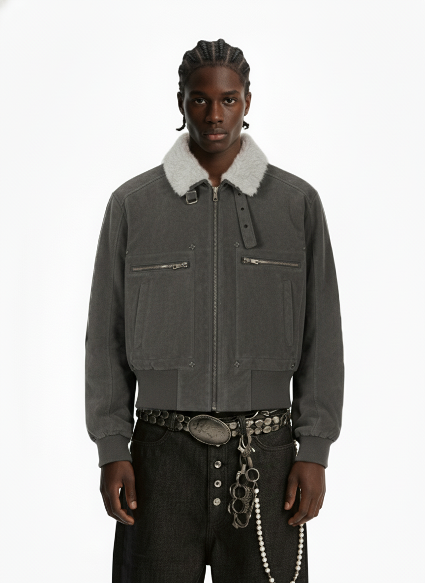 Retro Suede Texture Shearling Collar Fleece Bomber Jacket