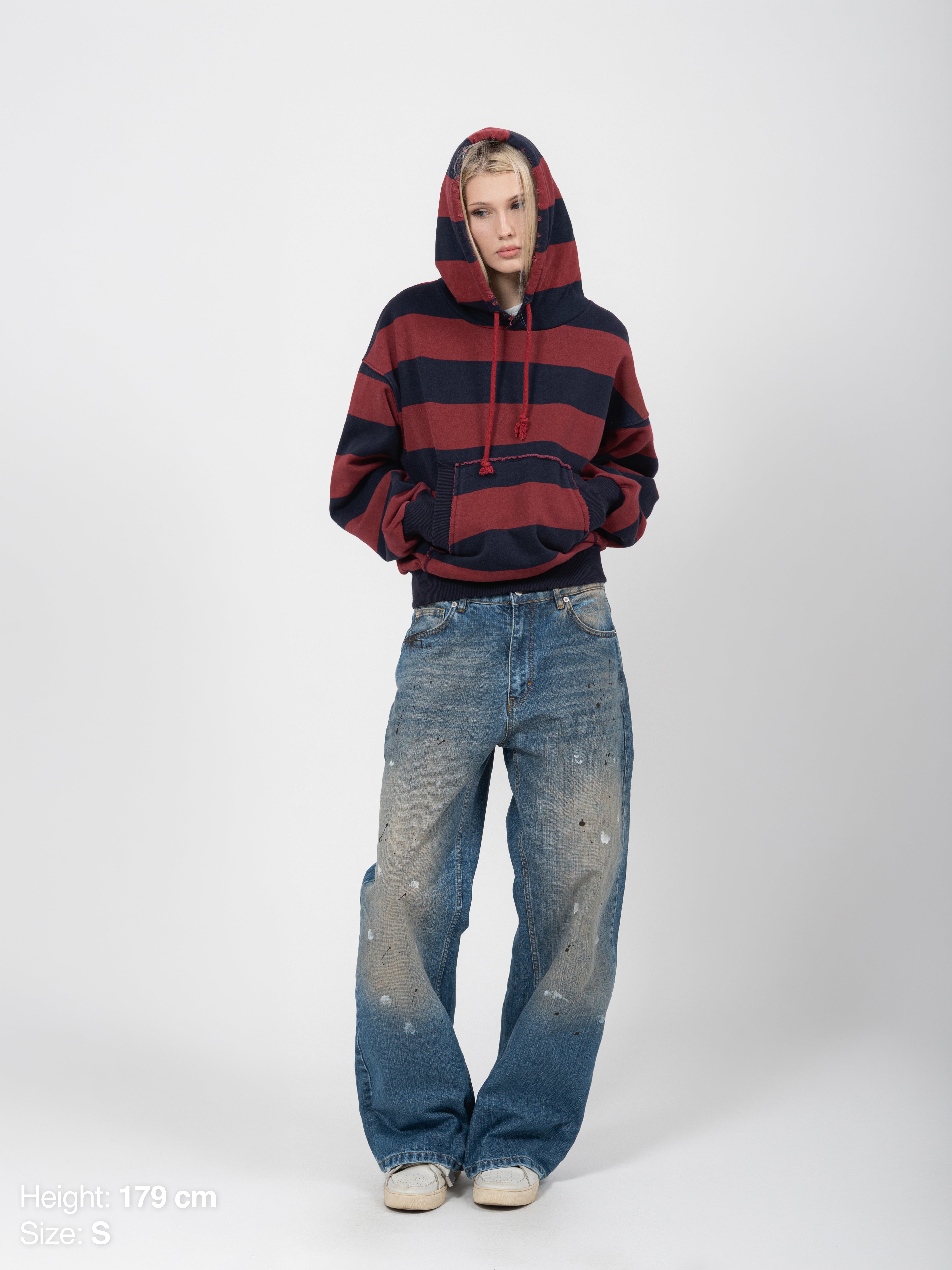 A part of the Spring 26 collection. A hoodie featuring our custom navy and red all-over stripe pattern. Inspired by 2010s-era sweatshirts cuts, trims and effects. Finished with a large hood and chunky drawstrings. Washed and distressed for an authentic worn-in look and feel.