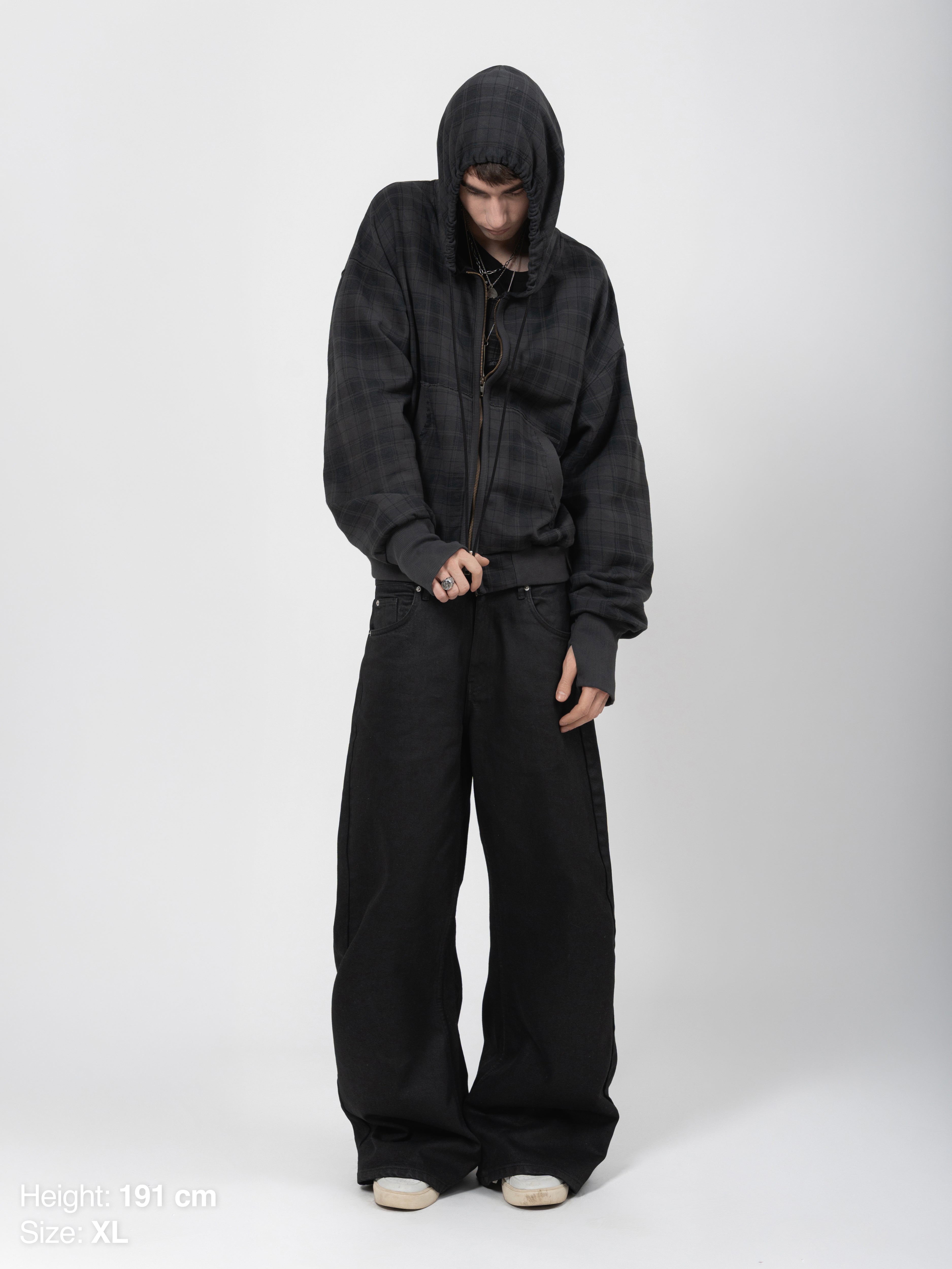A part of the Spring 26 collection. A full zip hoodie featuring our custom black tonal check all-over pattern. Inspired by 2010s-era sweatshirts cuts, trims and effects. Finished with a large hood and chunky drawstrings. Washed and distressed for an authentic worn-in look and feel. Equipped with our custom metal 2-way zipper.