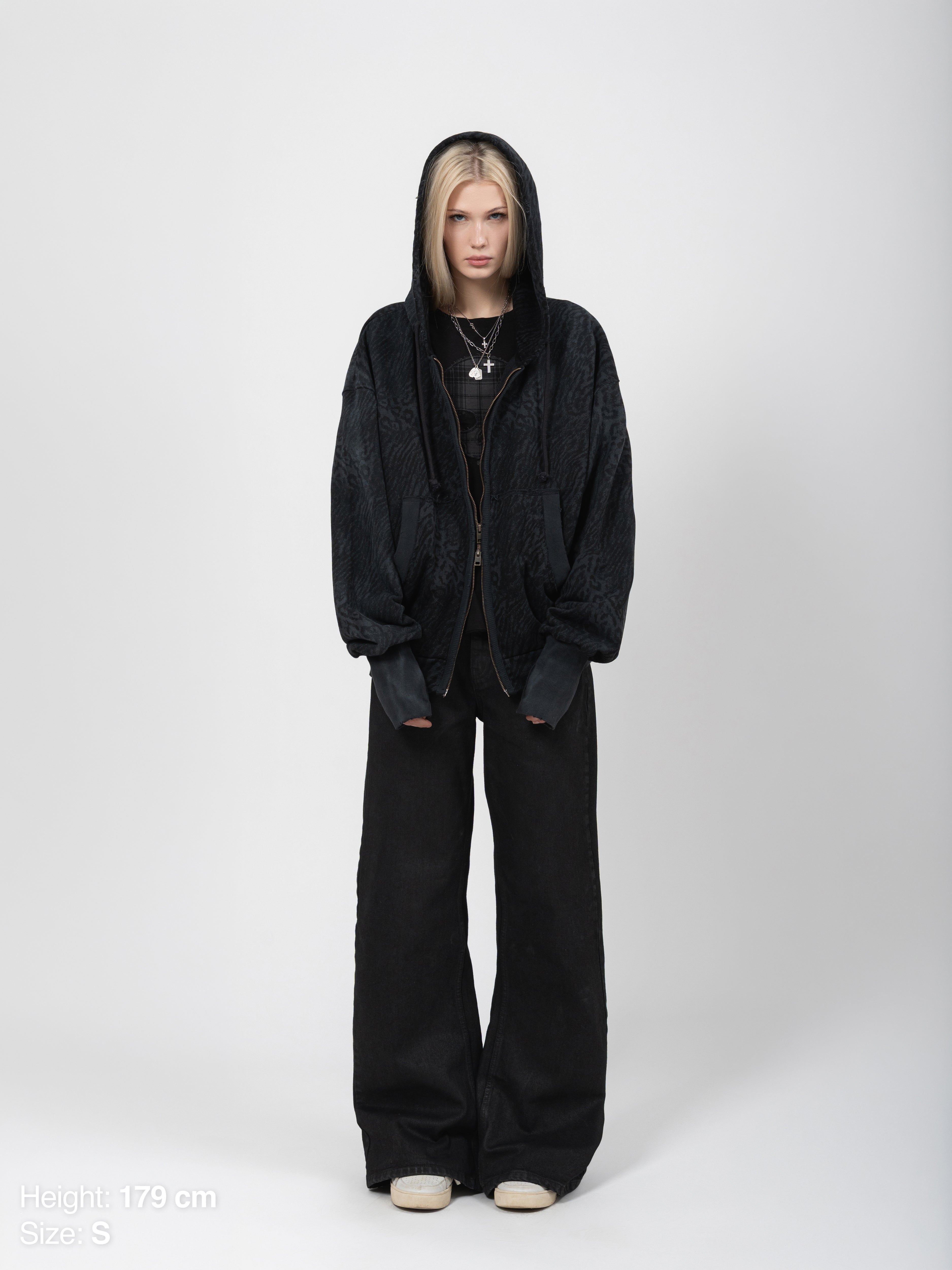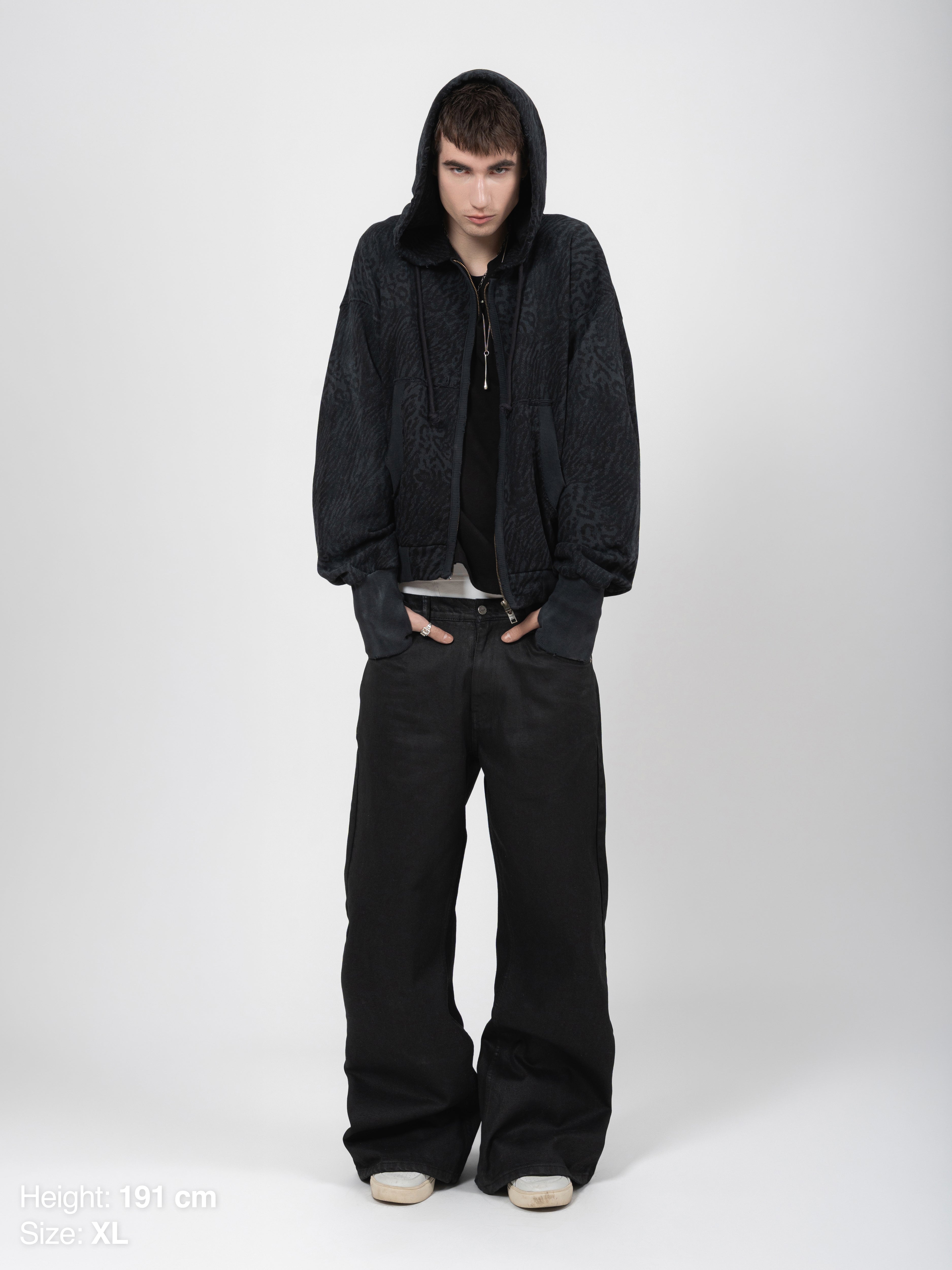 A part of the Spring 26 collection. A full zip hoodie featuring our custom zebra-leopard blended all-over pattern. Inspired by 2010s-era sweatshirts cuts, trims and effects. Finished with a large hood and chunky drawstrings. Washed and distressed for an authentic worn-in look and feel. Equipped with our custom metal 2-way zipper.