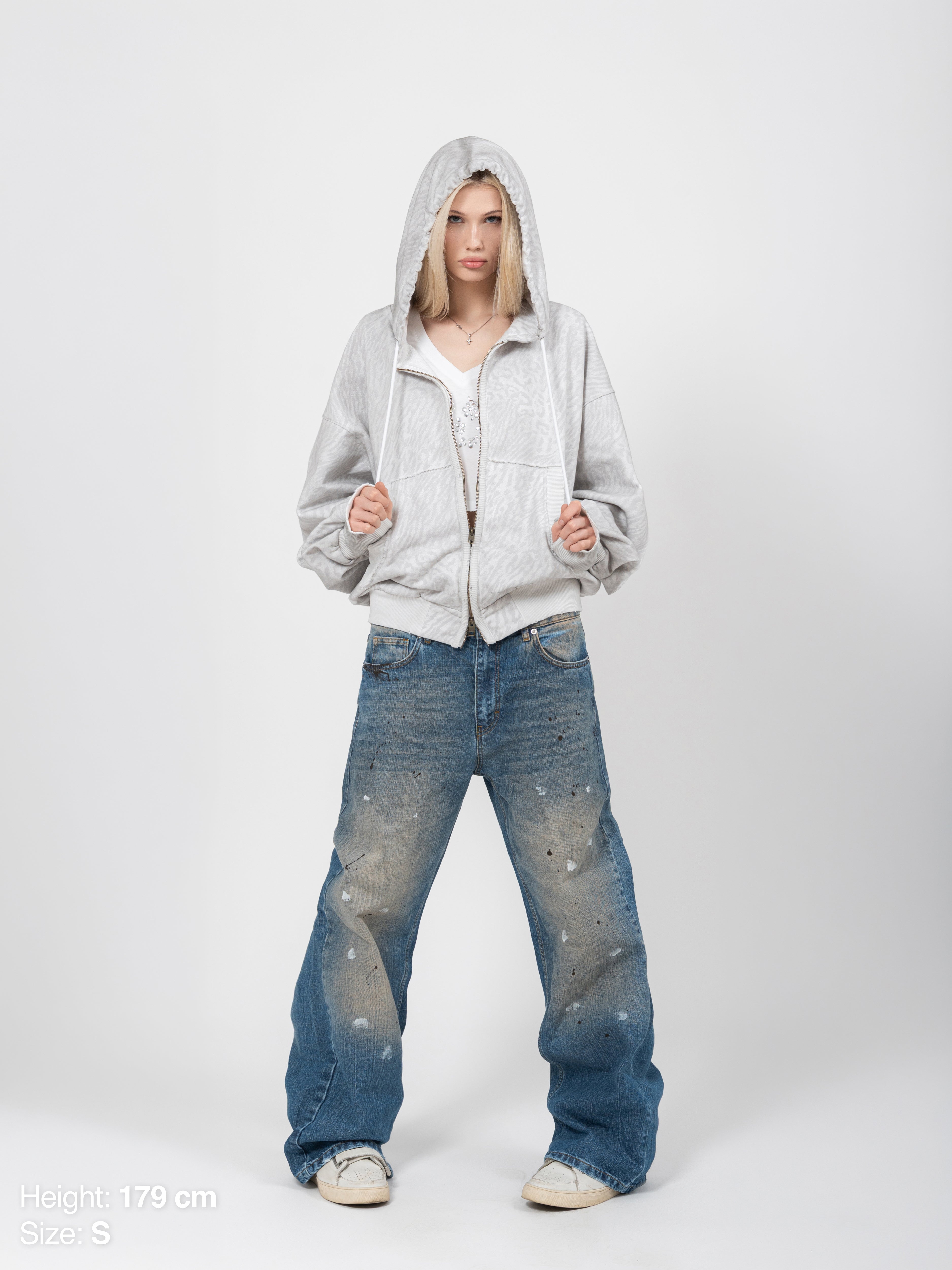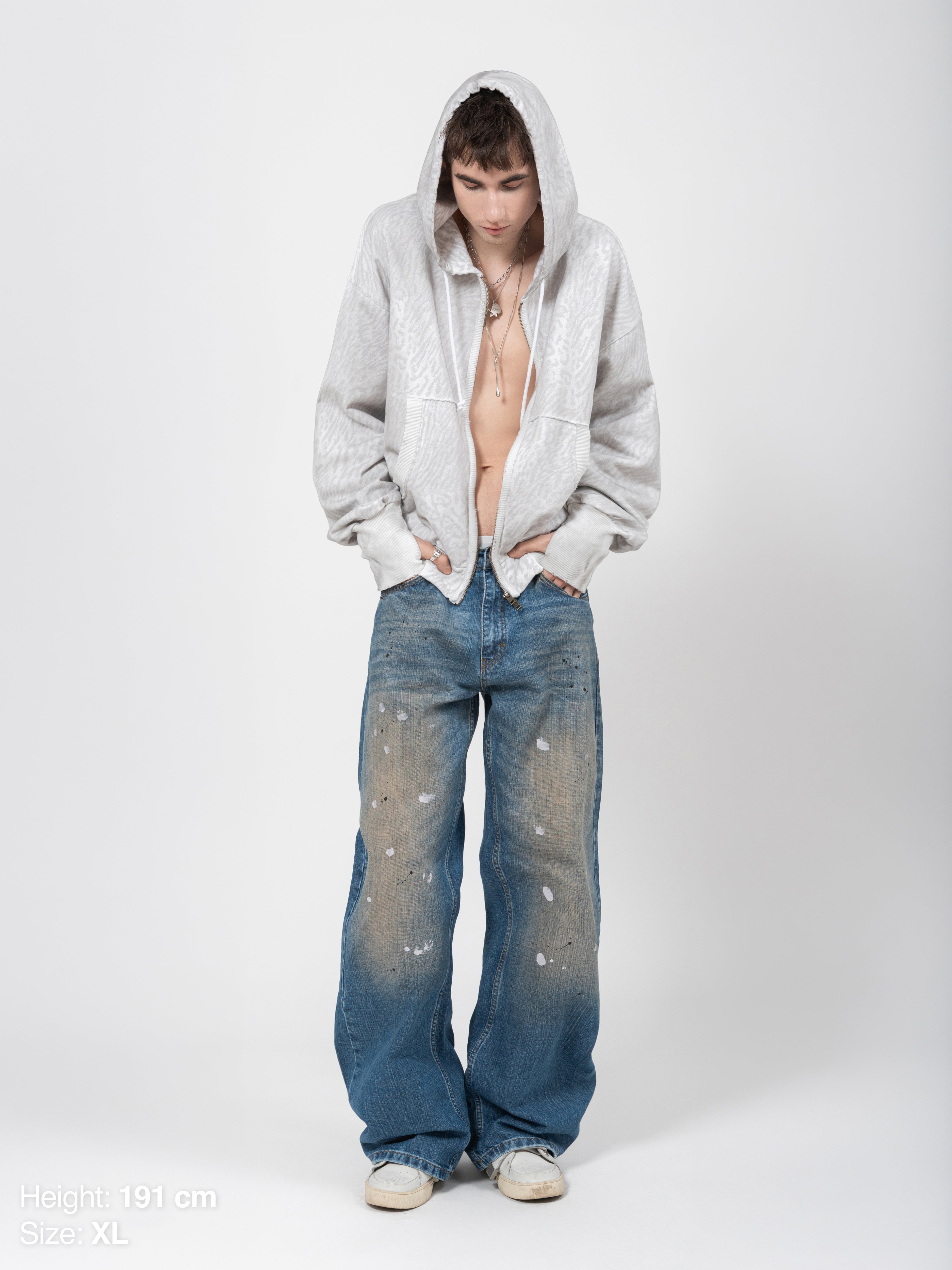 A part of the Spring 26 collection. A full zip hoodie featuring our custom zebra-leopard blended all-over pattern. Inspired by 2010s-era sweatshirts cuts, trims and effects. Finished with a large hood and chunky drawstrings. Washed and distressed for an authentic worn-in look and feel. Equipped with our custom metal 2-way zipper.