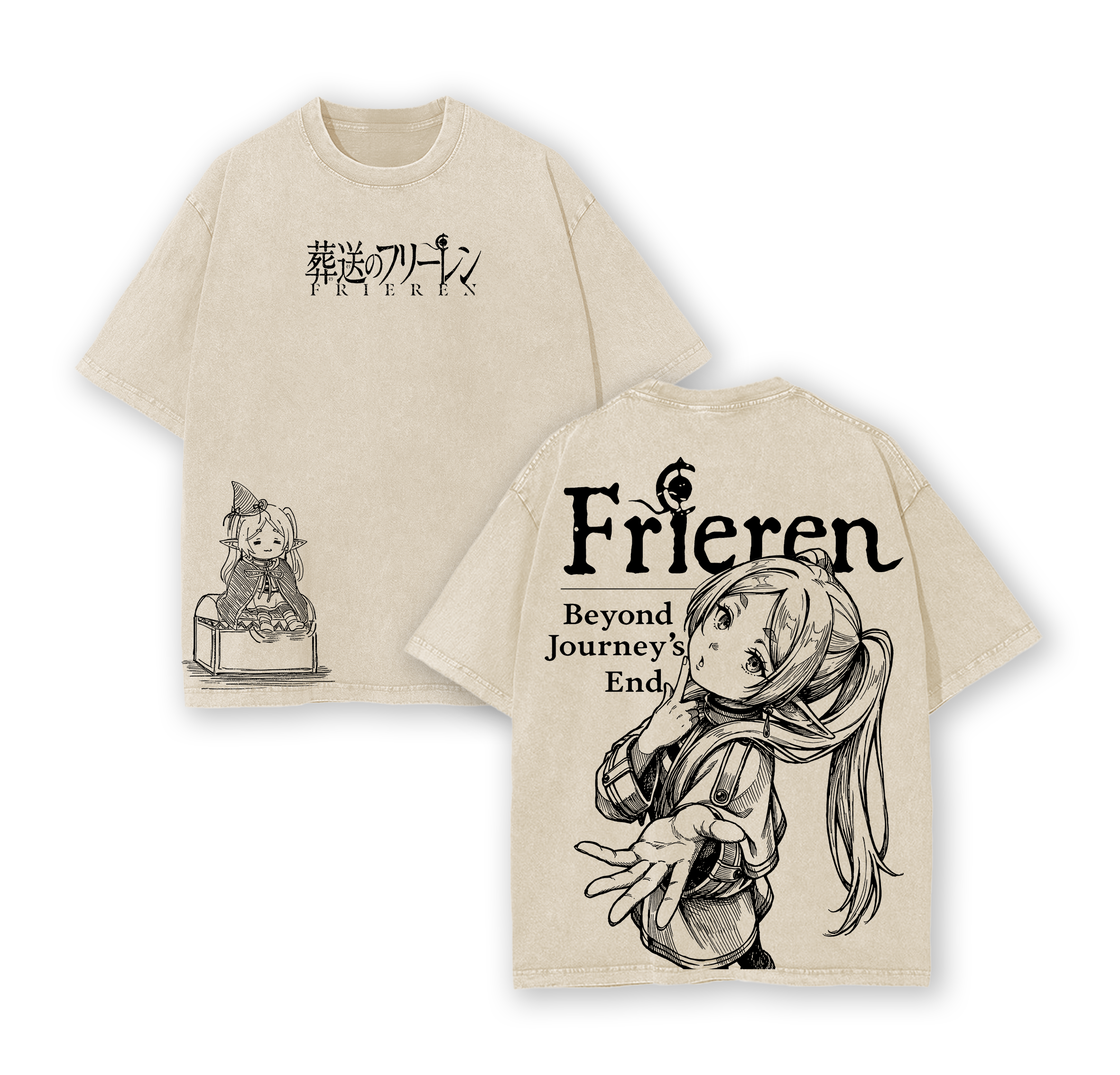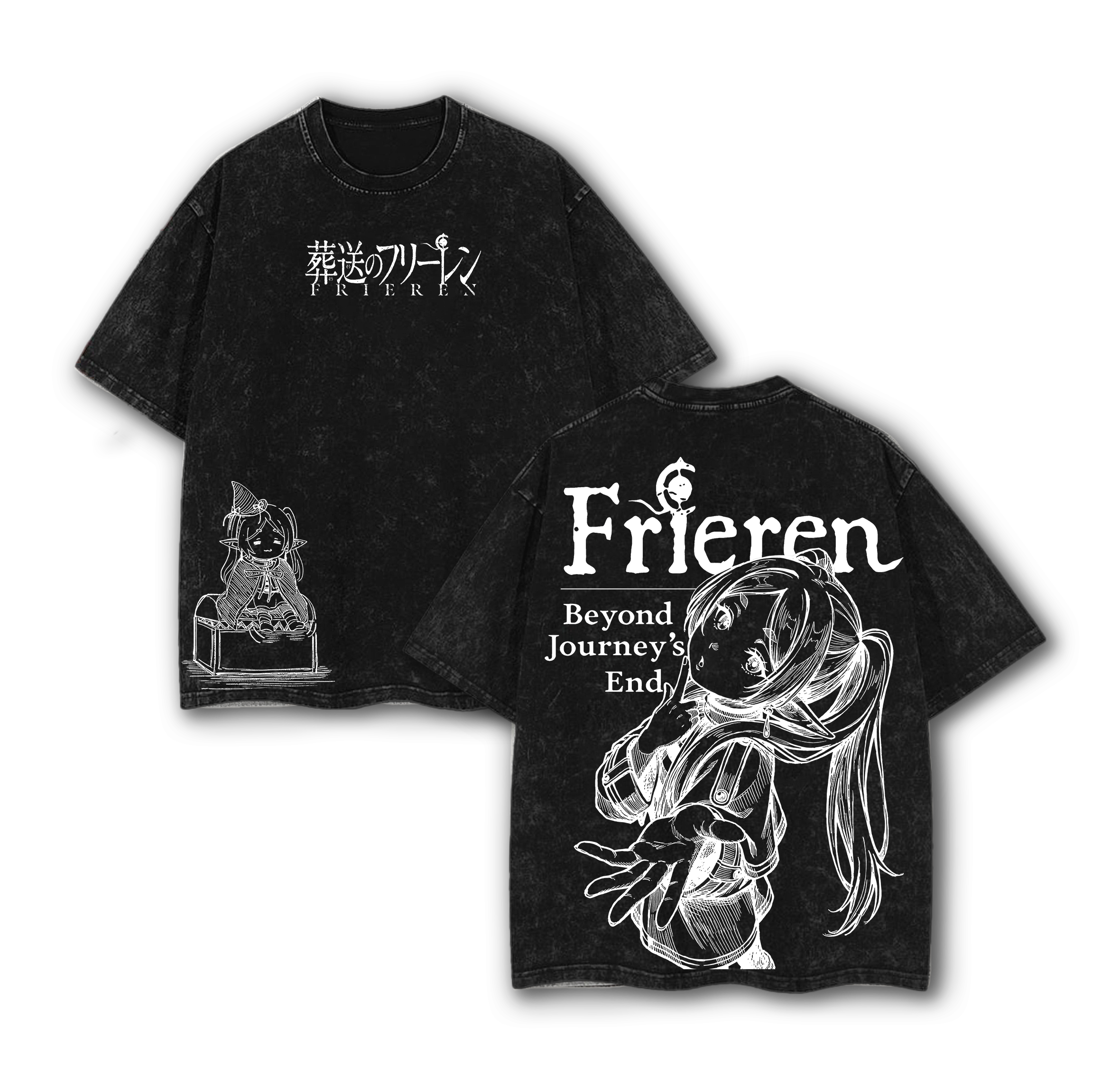 Frieren Beyond Journey’s End Hoodie & Tee Washed, Vintage Washed Heavy Cotton Oversized Anime Manga Hoodie T-Shirt Set, Retro Unisex Streetwear Graphic Top, Fantasy Healing Journey Edition, Japanese Anime Merch