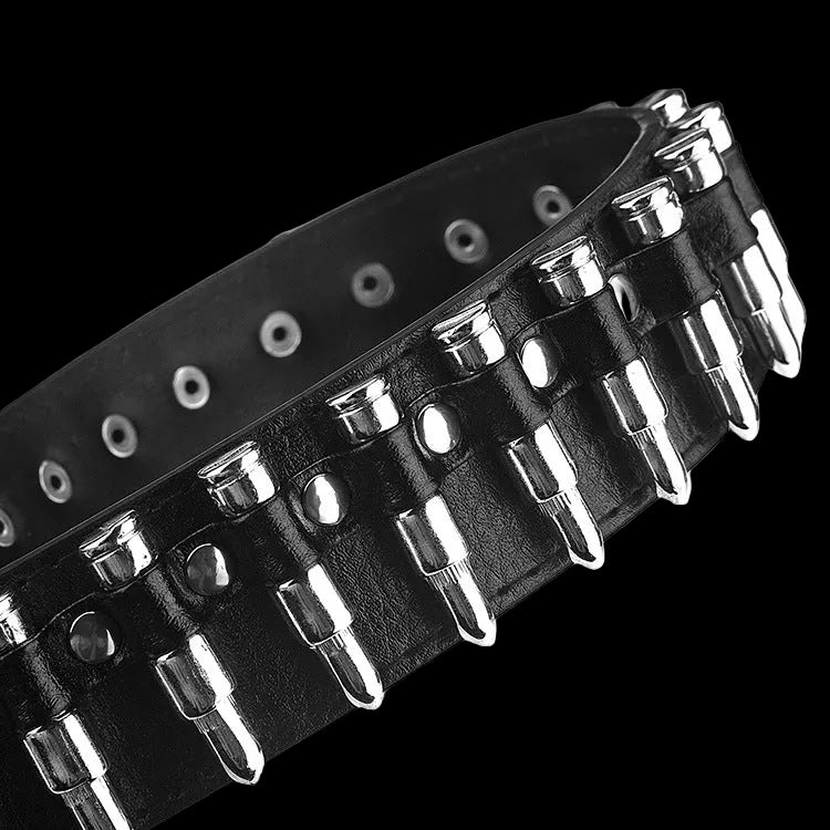 Decorative belt featuring metal bullet-shaped studs arranged along the strap. The design combines a textured strap with polished metallic details for a bold, structured look. A classic metal buckle provides a secure and adjustable fit. Reinforced stitching increases durability for everyday use. The stud pattern adds a strong visual statement without sacrificing comfort. A distinctive accessory that adds edge and personality to any outfit.