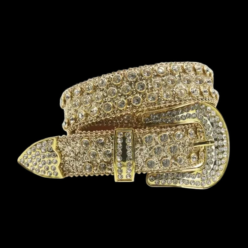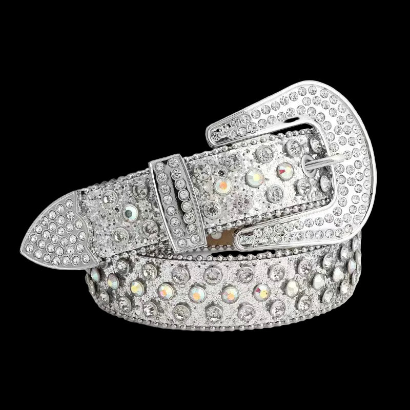 This pink glitter belt features a Western-style alloy buckle, tip, and keeper, all heavily encrusted with clear and pink rhinestones. The strap is made of pink PU leather with a textured, glittery finish and is decorated with three rows of alternating pink and white studded stones. This neutral/unisex accessory has a standard width of 2-4cm.