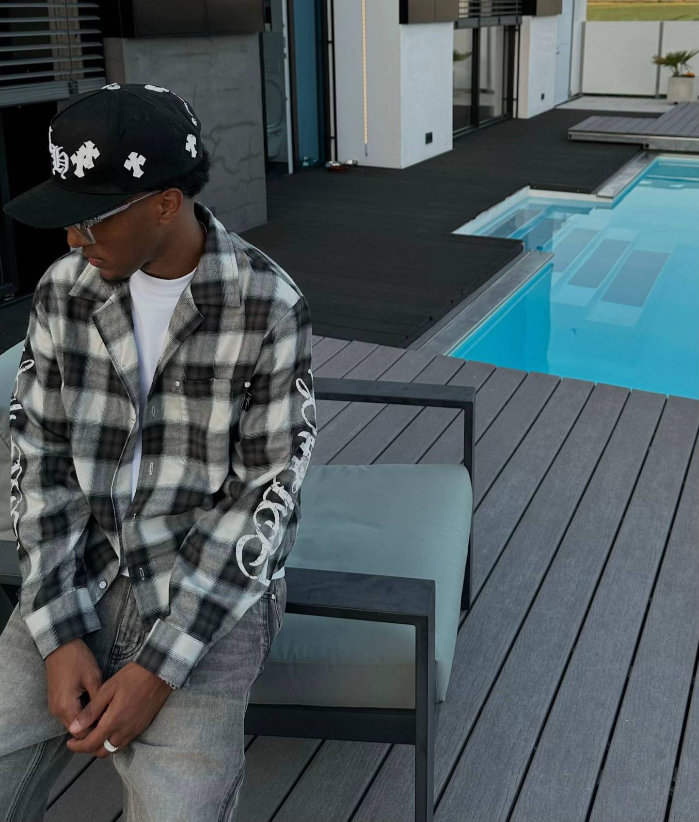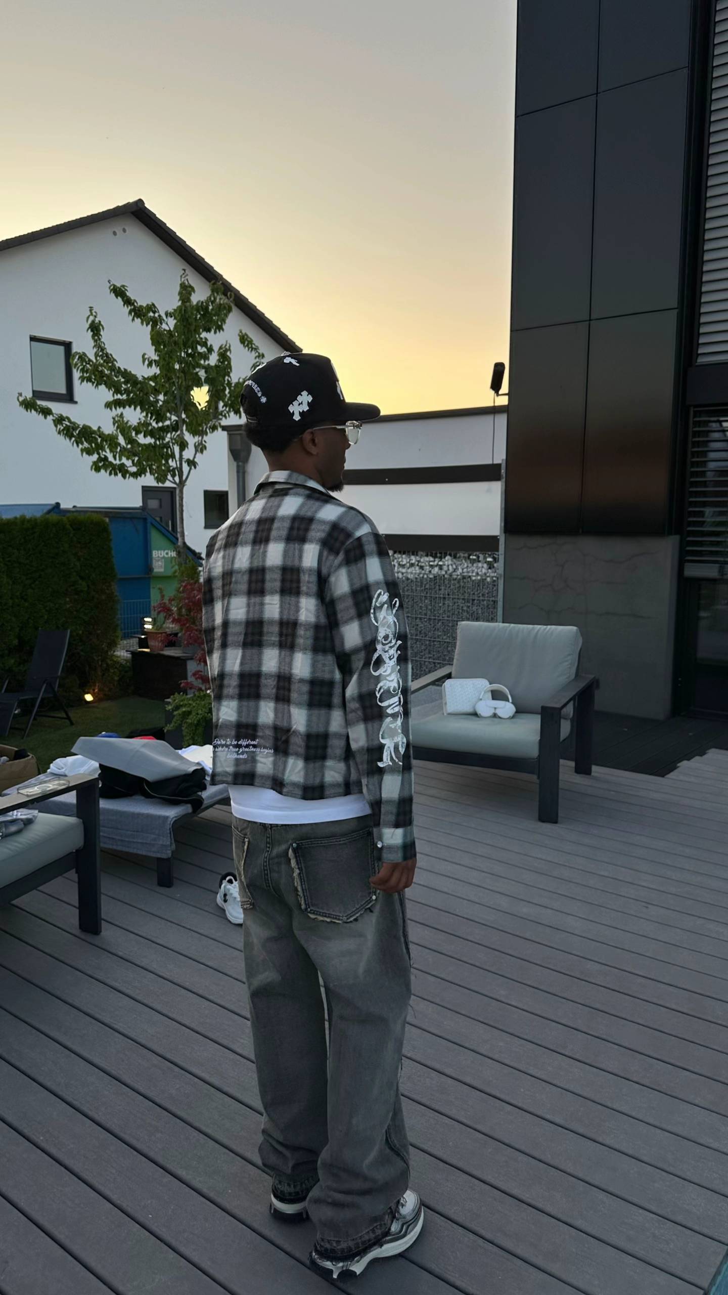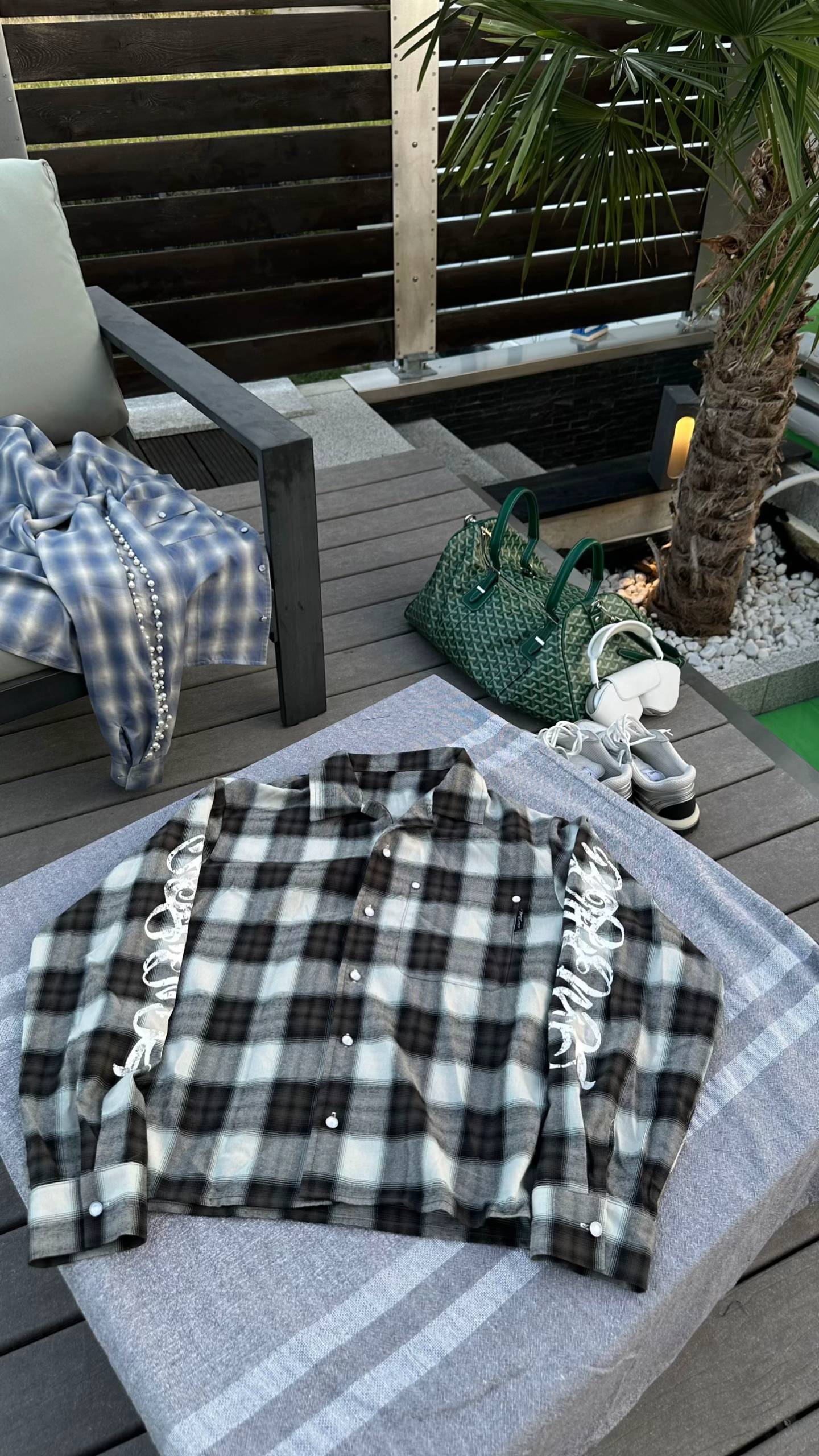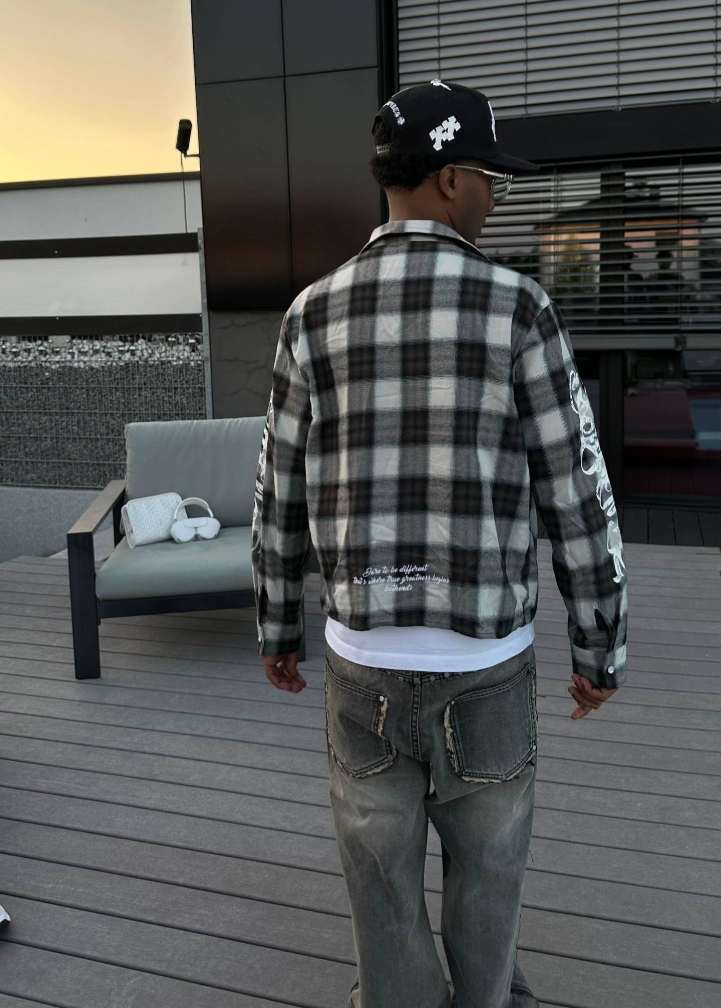 This statement piece reimagines the classic plaid shirt with avant-garde detailing. Crafted from a soft, lightweight fabric in a gradient gray-and-white checkered pattern, it features a relaxed, oversized fit
