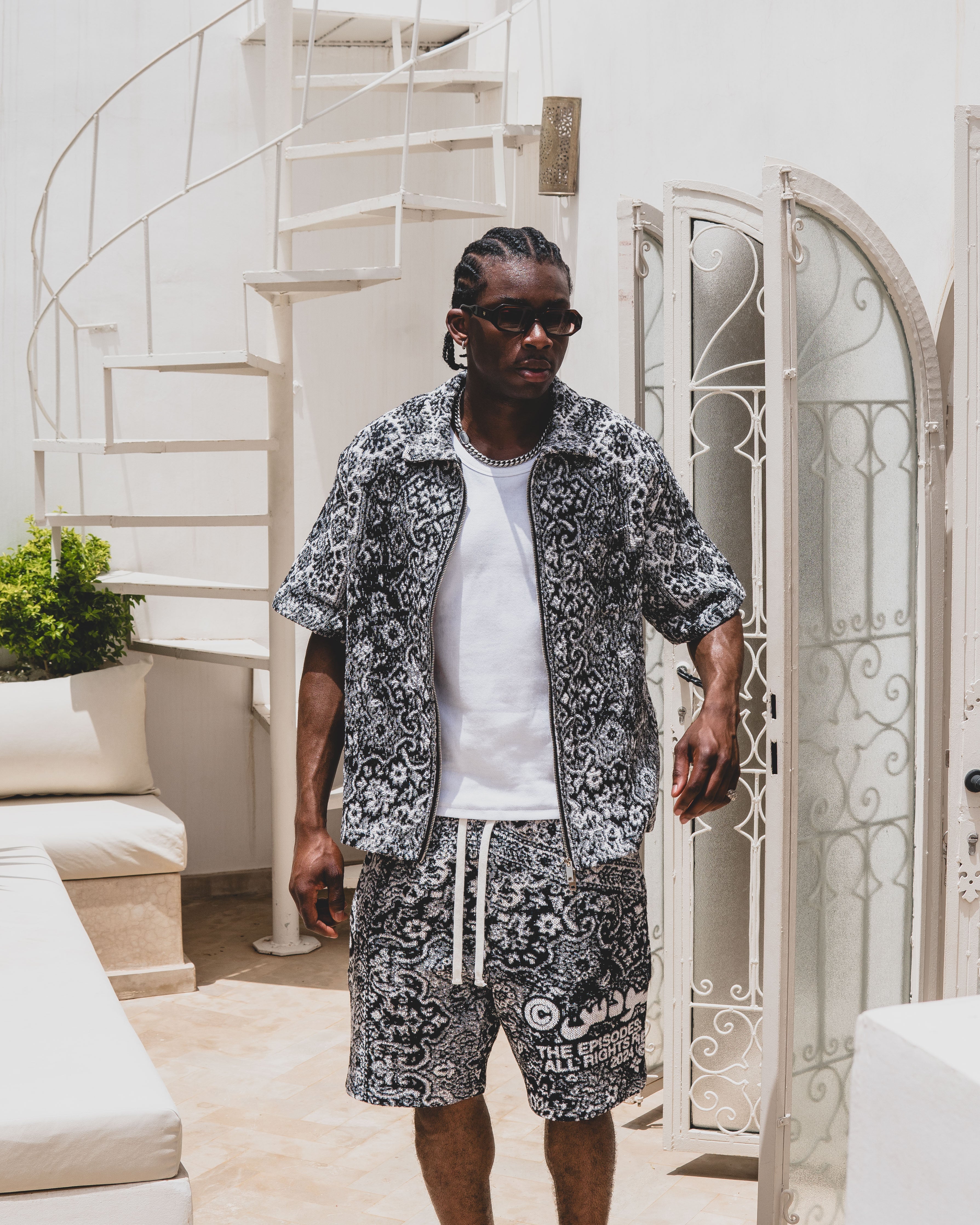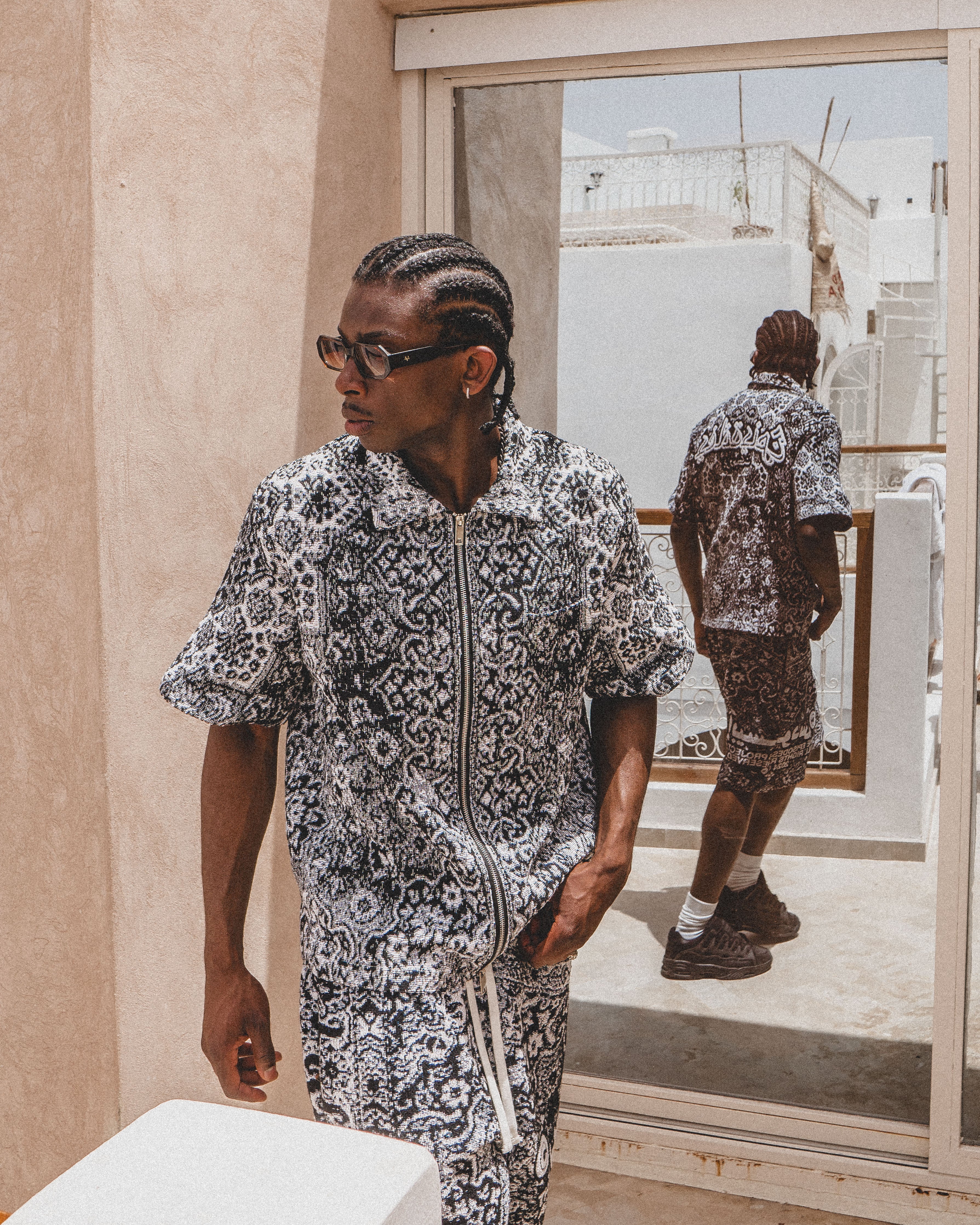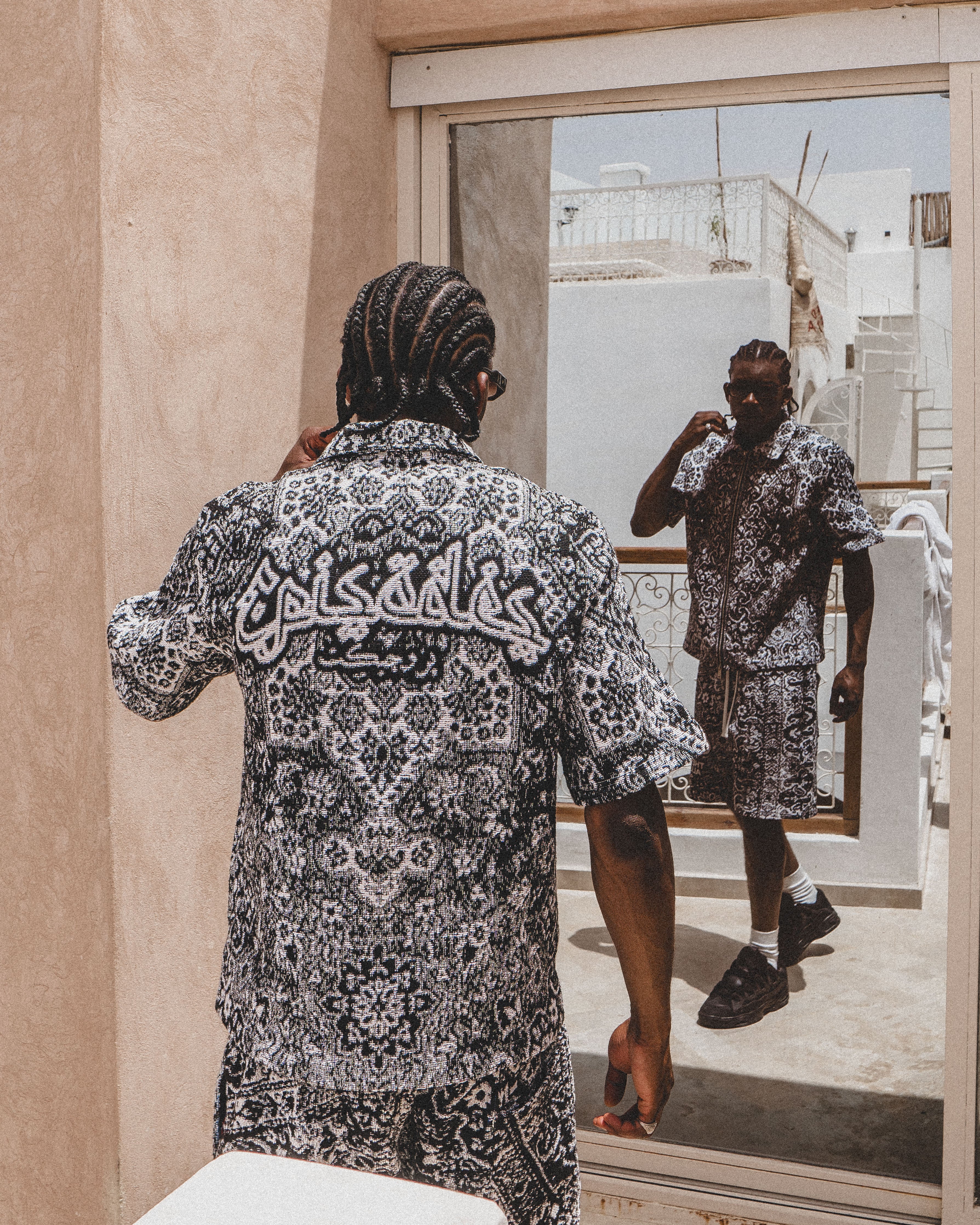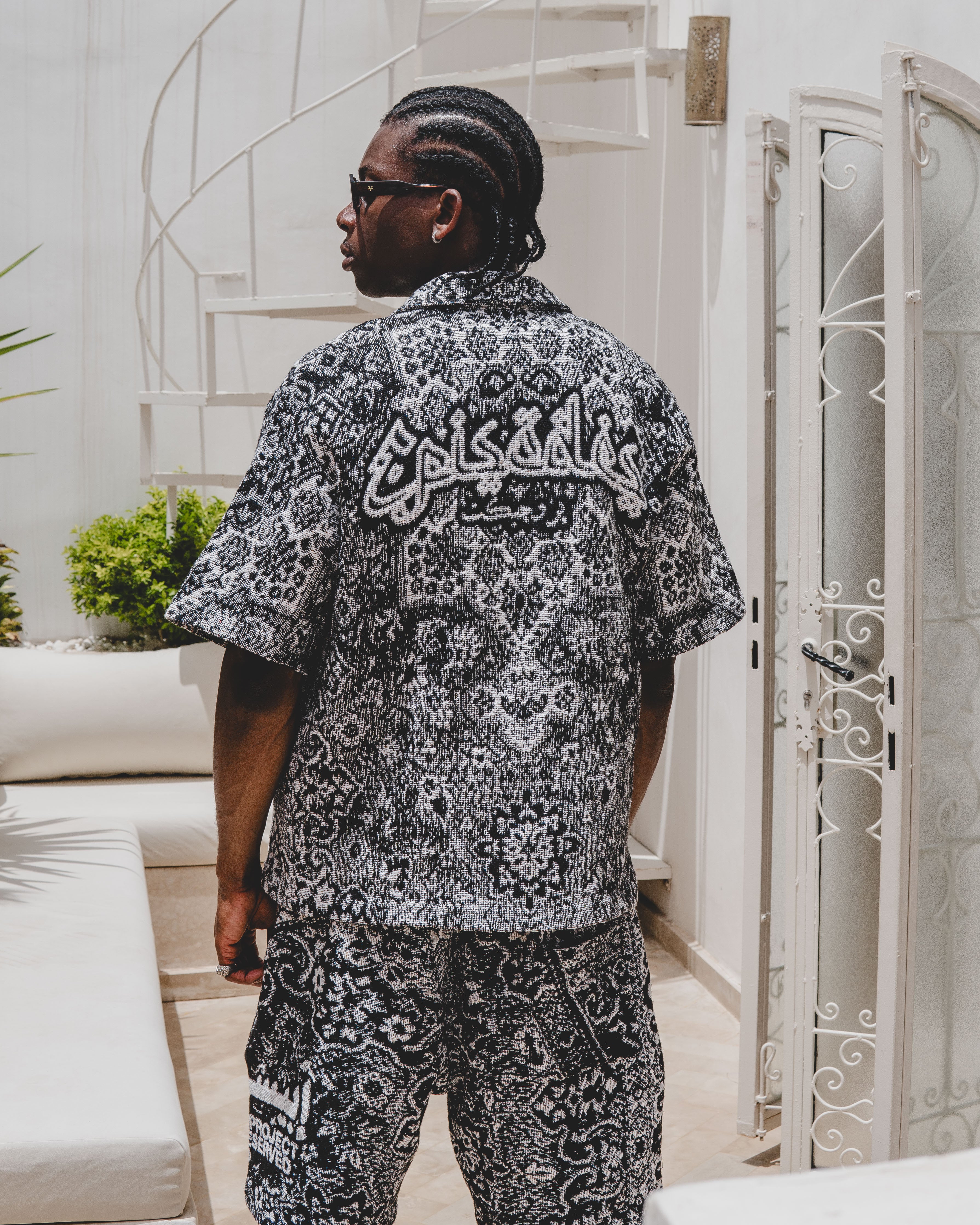 The BLAZE Tapestry Shirt part of Episode 5.Designed in collaboration with Egyptian artist Mohamdy Eisa @mohamdy.psd"Blaze": The intense heat of summer. The rapid spread of fire. Inspired by the rich history and intricate designs of Arabic rugs; catching fire and turning into a global icon. History woven into every thread.
