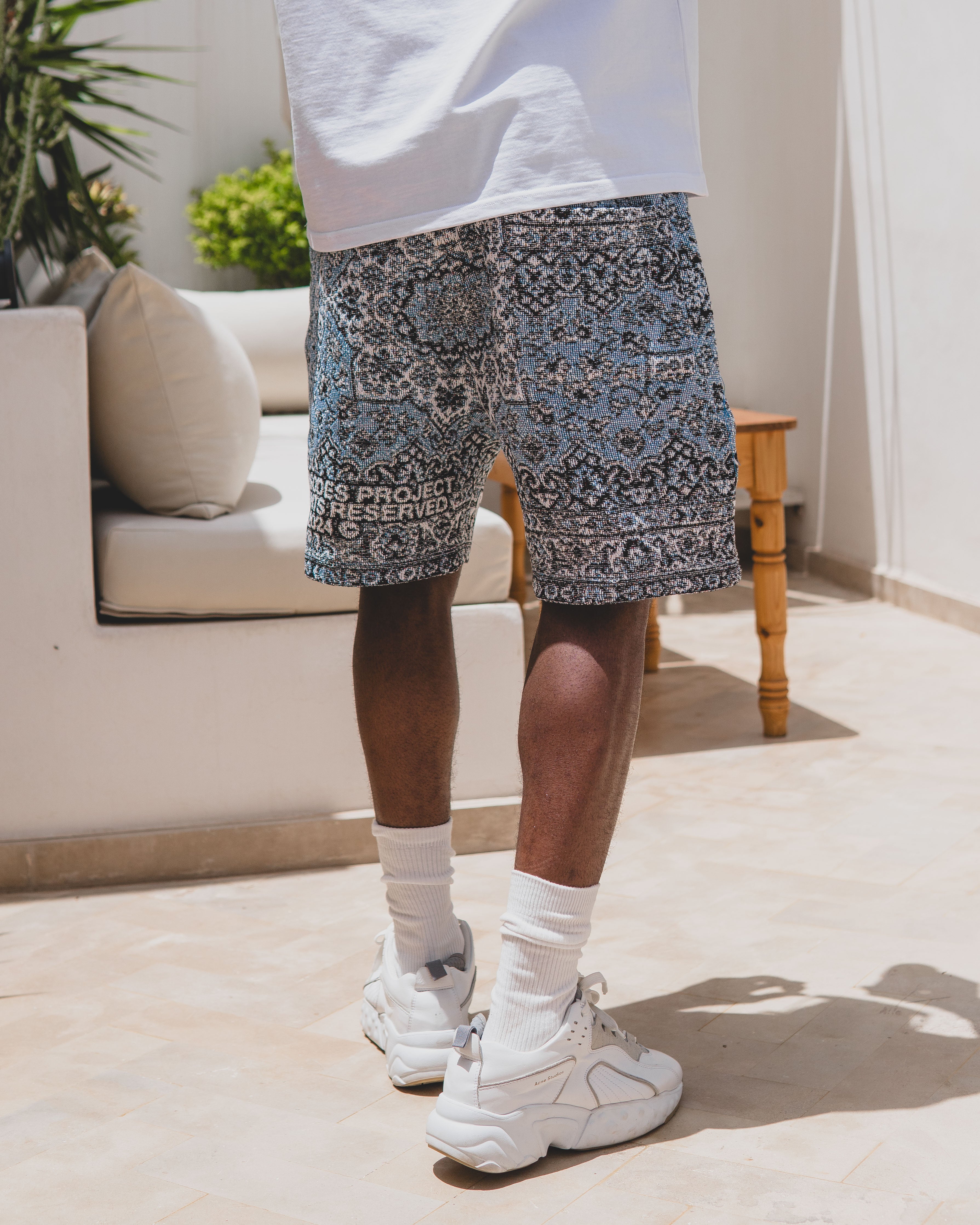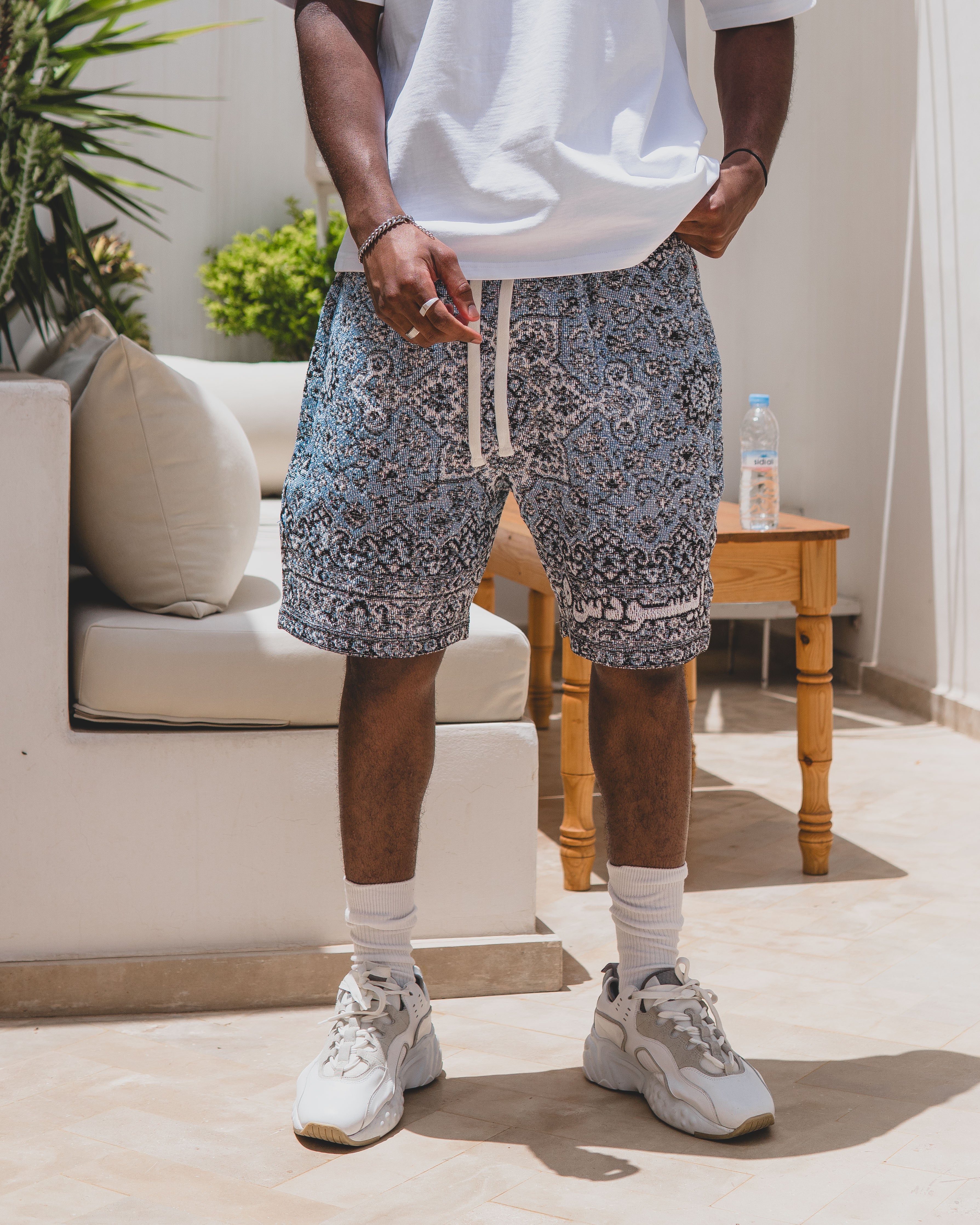 The BLAZE Tapestry Shorts part of Episode 5.Designed in collaboration with Egyptian artist Mohamdy Eisa @mohamdy.psd"Blaze": The intense heat of summer. The rapid spread of fire. Inspired by the rich history and intricate designs of Arabic rugs; catching fire and turning into a global icon. History woven into every thread.