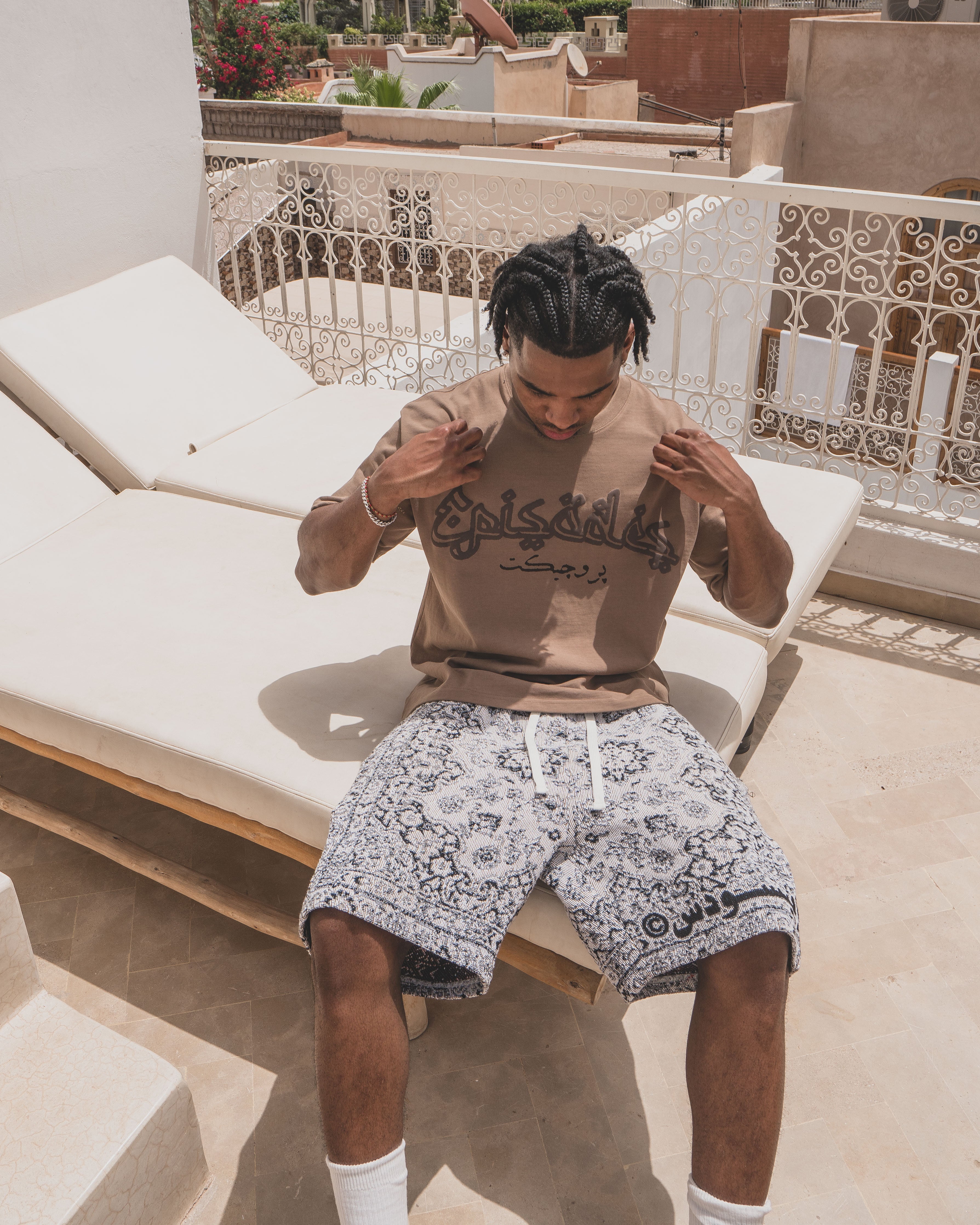 The BLAZE Tapestry Shorts part of Episode 5.Designed in collaboration with Egyptian artist Mohamdy Eisa @mohamdy.psd"Blaze": The intense heat of summer. The rapid spread of fire. Inspired by the rich history and intricate designs of Arabic rugs; catching fire and turning into a global icon. History woven into every thread.