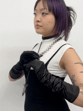 This necklace is made of 100% stainless steel and a thick cord. It features a custom chainsaw-style chain and a set of playful, movable elements you can adjust and arrange however you like.