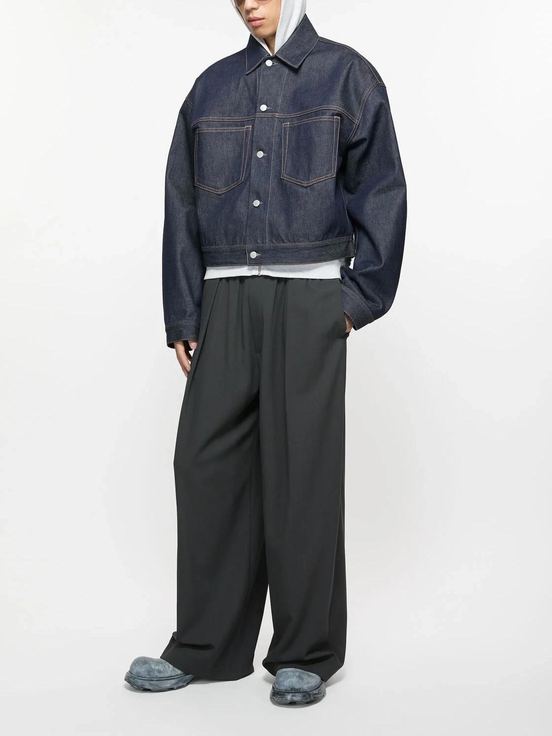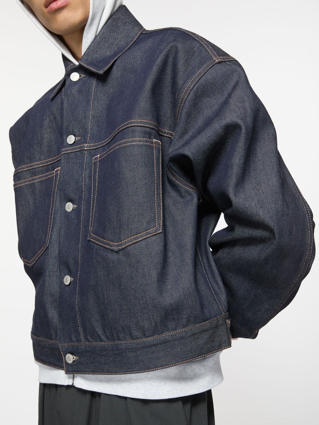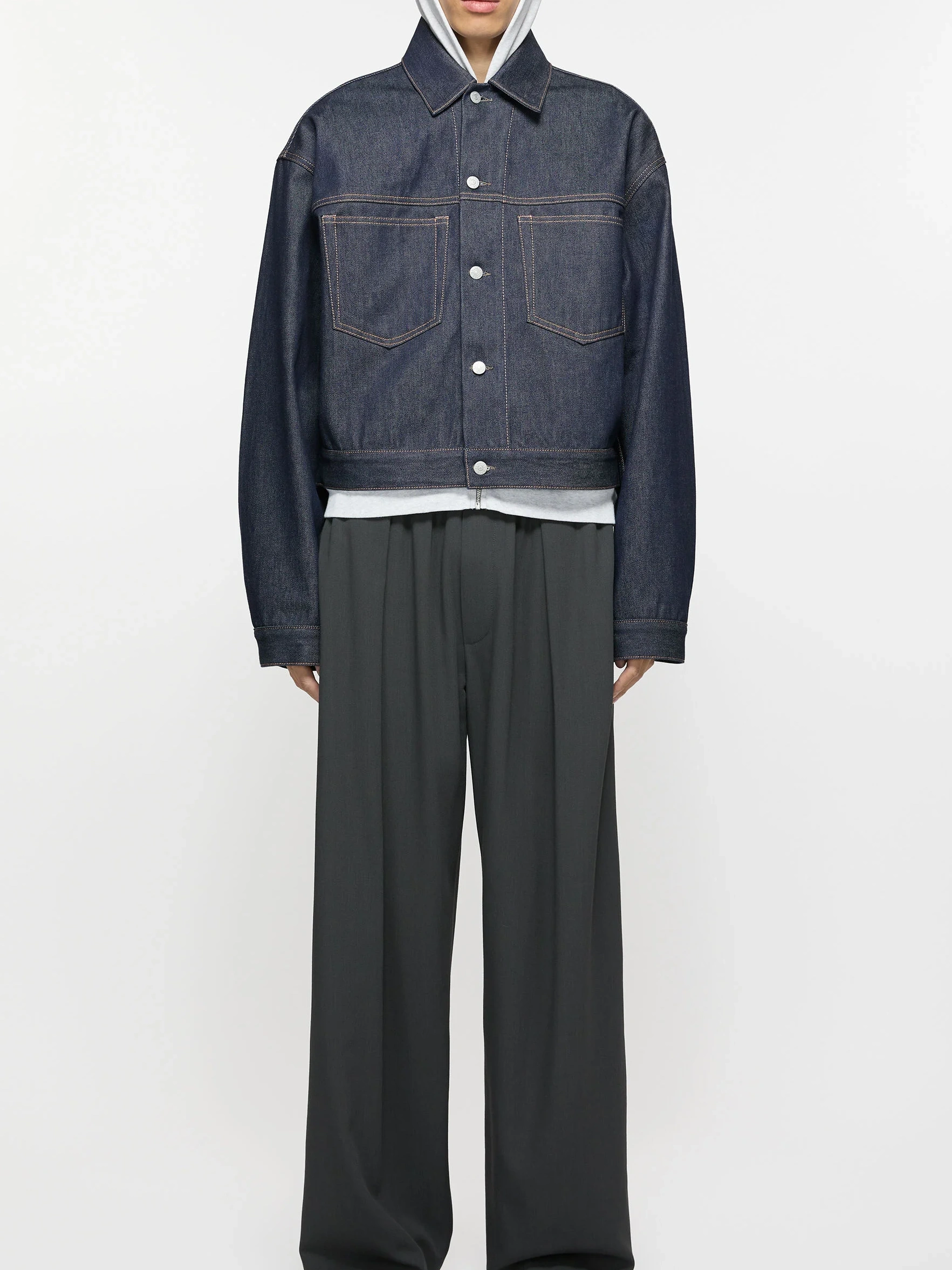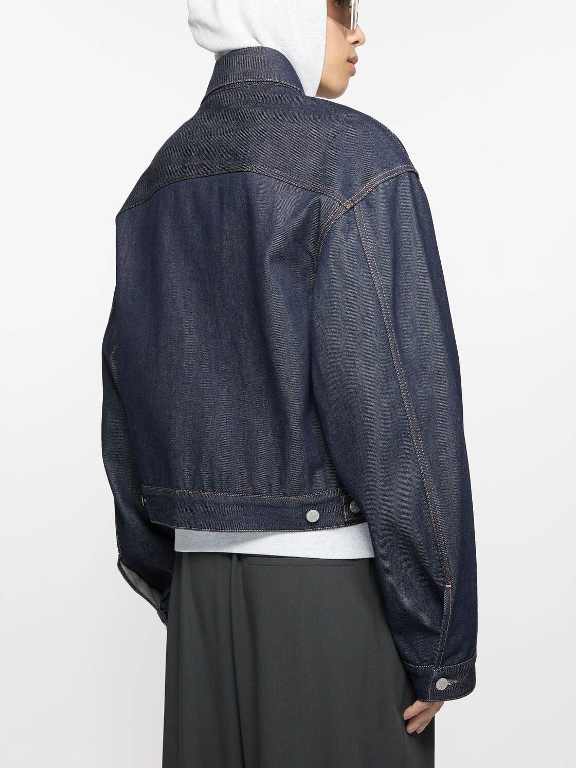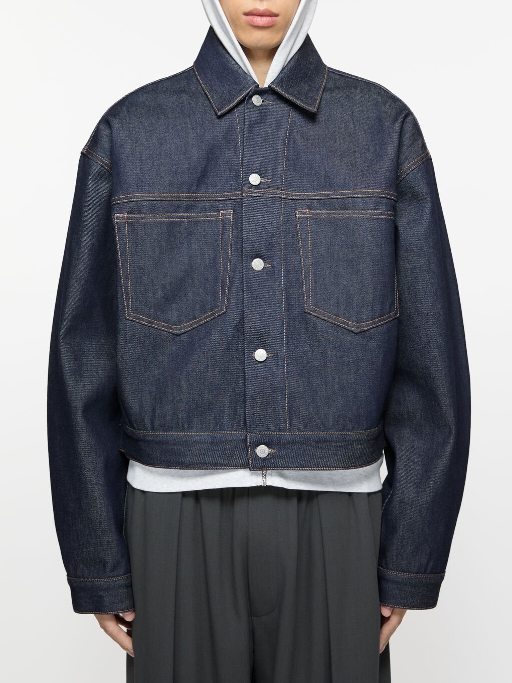 Denim jacket is cut to a boxy fit with dropped shoulders and waist length. Crafted from non-stretch denim in an indigo blue wash.