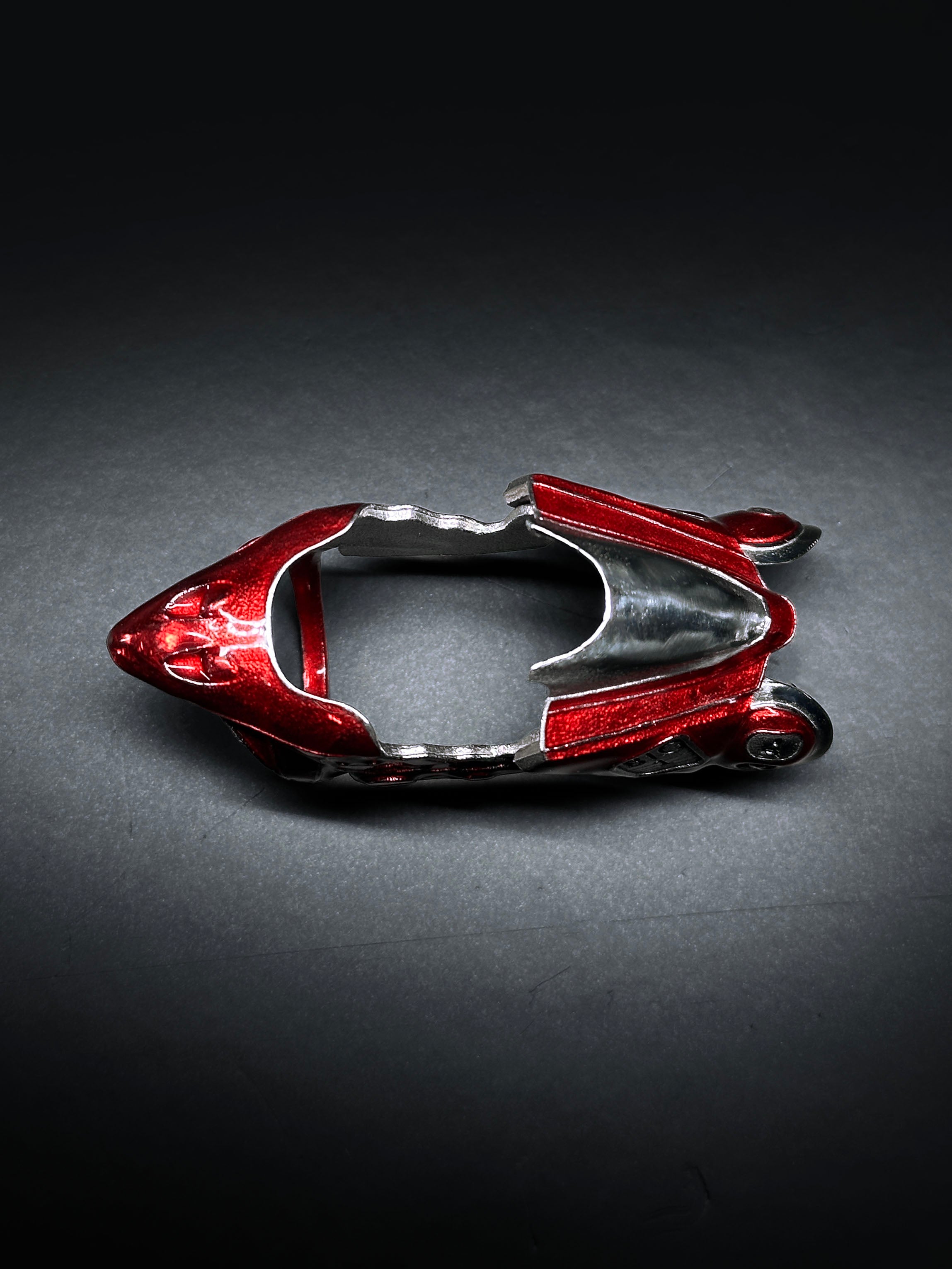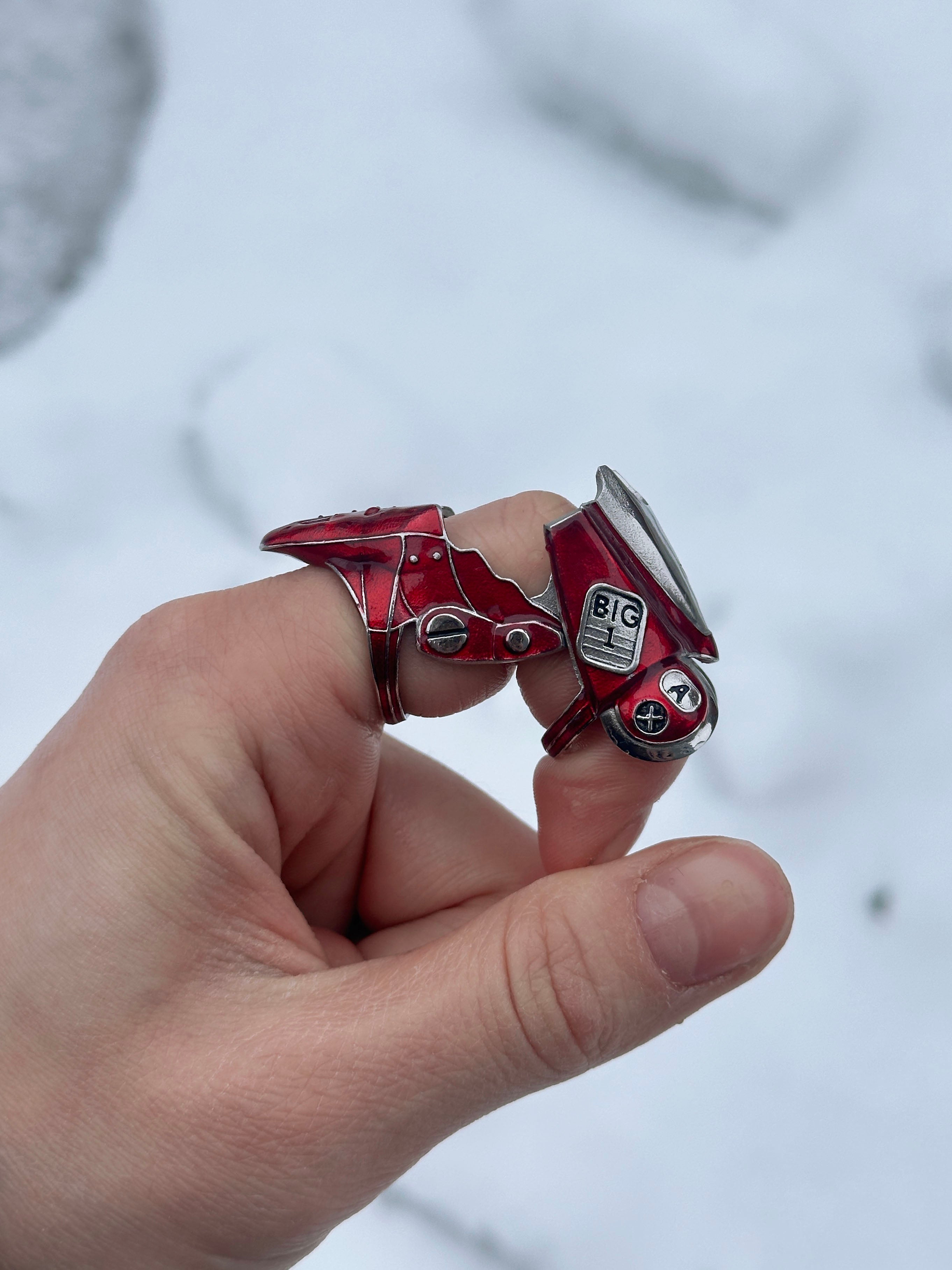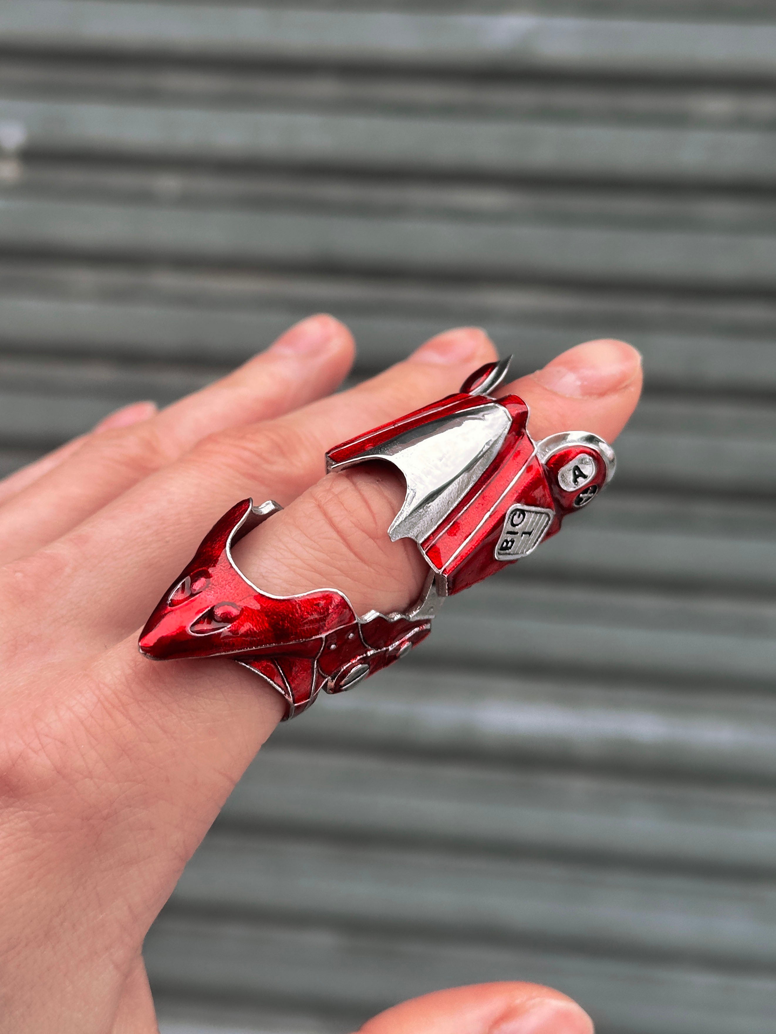 Made from solid 316L stainless steel, this ring features bold, hand-painted red enamel inspired by the iconic bike. Built with a smooth articulating hinge, the ring bends and flexes with your every move.