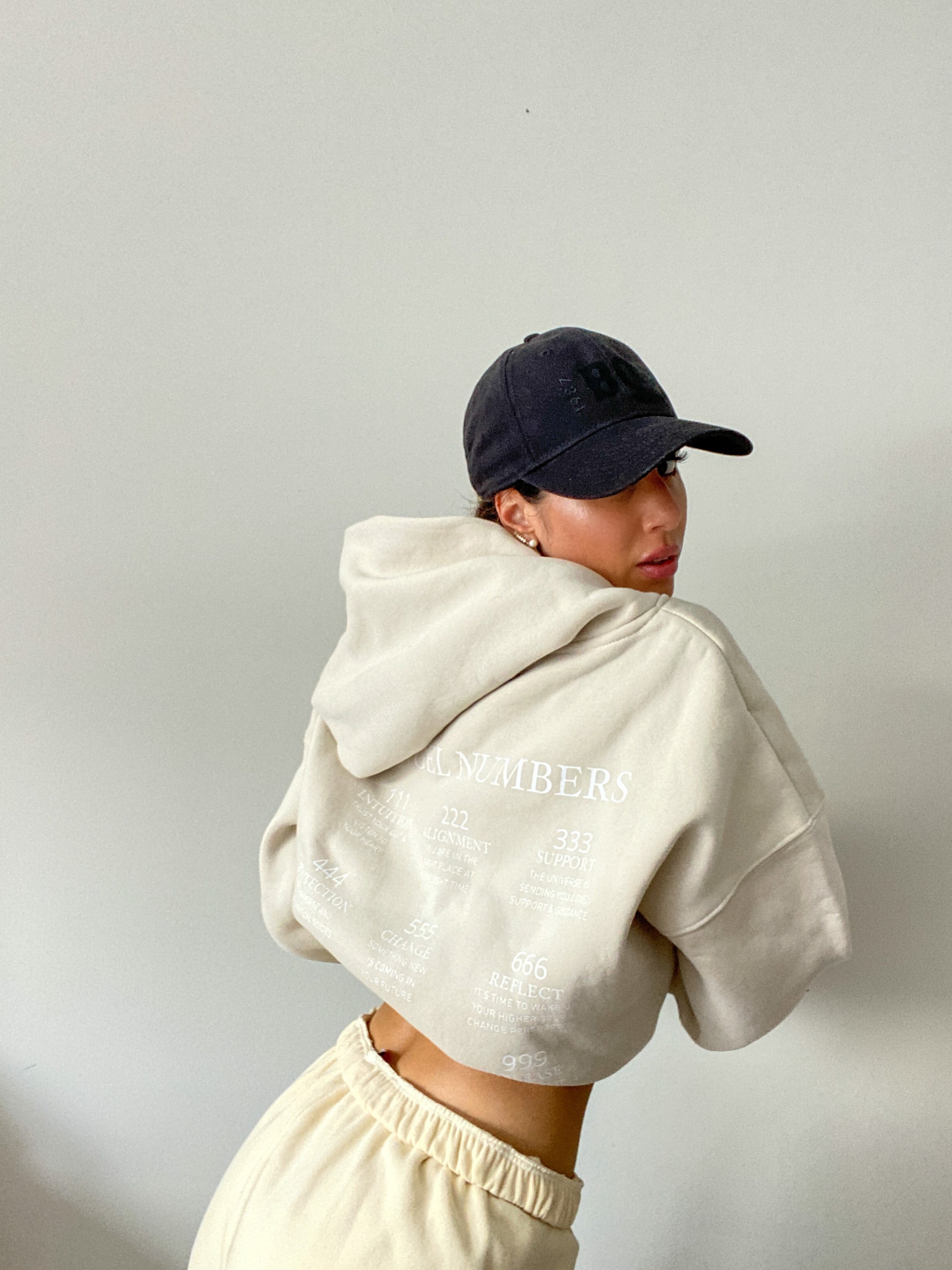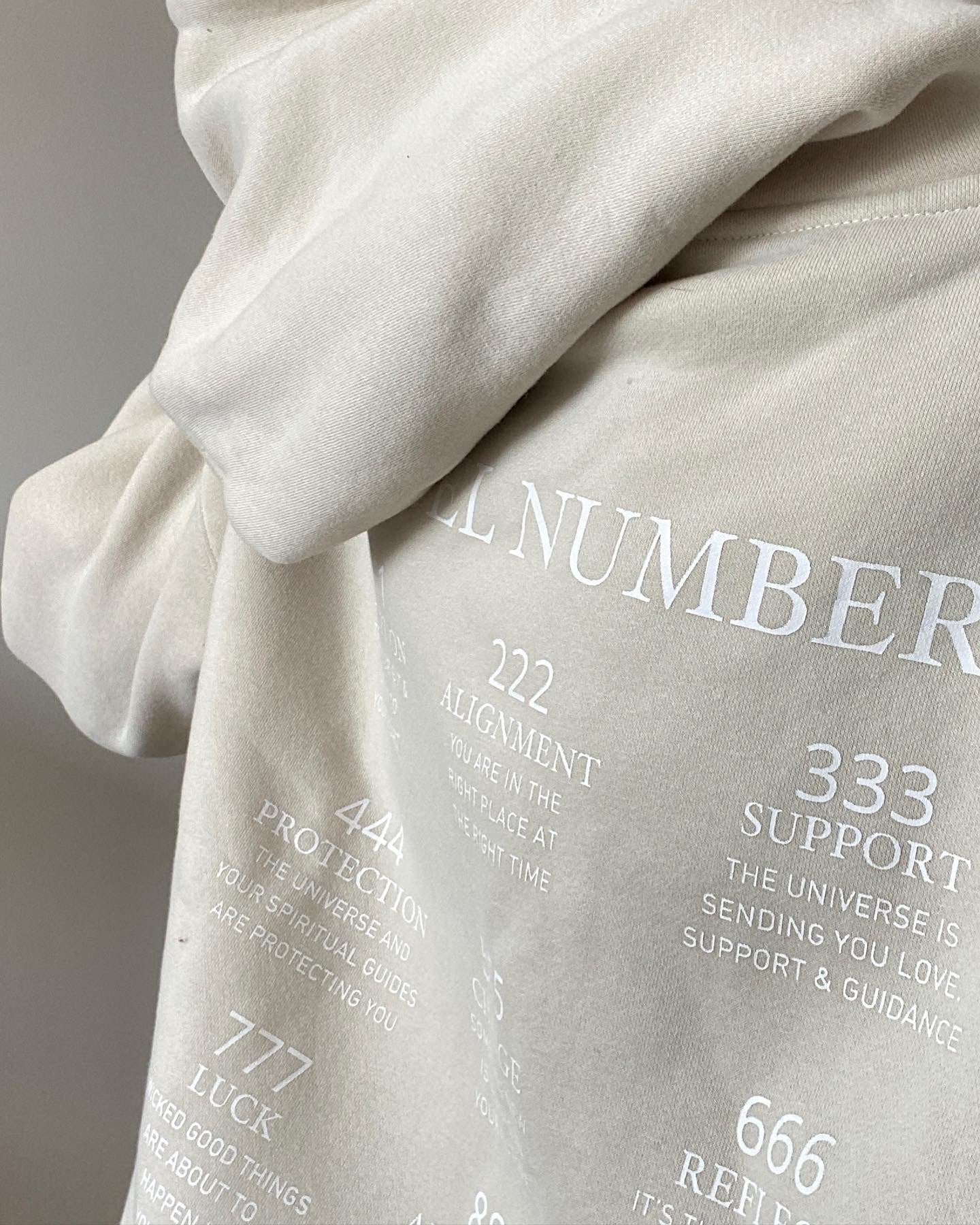 Meet, The Angel Number hoodie inspired by our founder's (@jendeangelis) last name, which means "of the angels" in Italian. This hoodie is part of our "Of the Angels" collection featuring a full angel number chart on the back of the hoodie with demure 1987 branding on the neckline of the hoodie. If you follow angel numbers you'll know that the universe speaks to you in number sequences. Each sequence takes on a special meaning such as 888 equating to abundance, ya we think you'll have some good vibes wearing this fit.