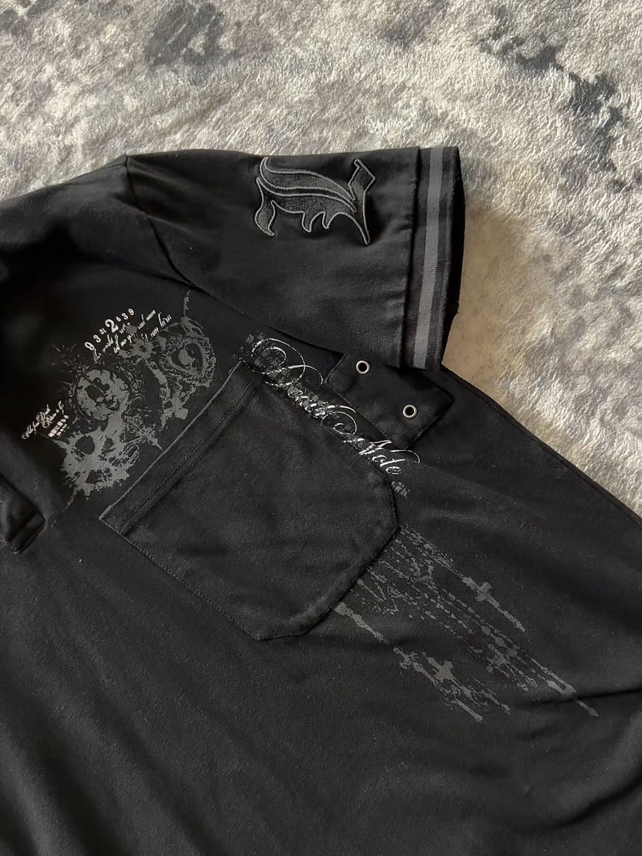 Metal eyelets on sleeve, patch pocket on chest
