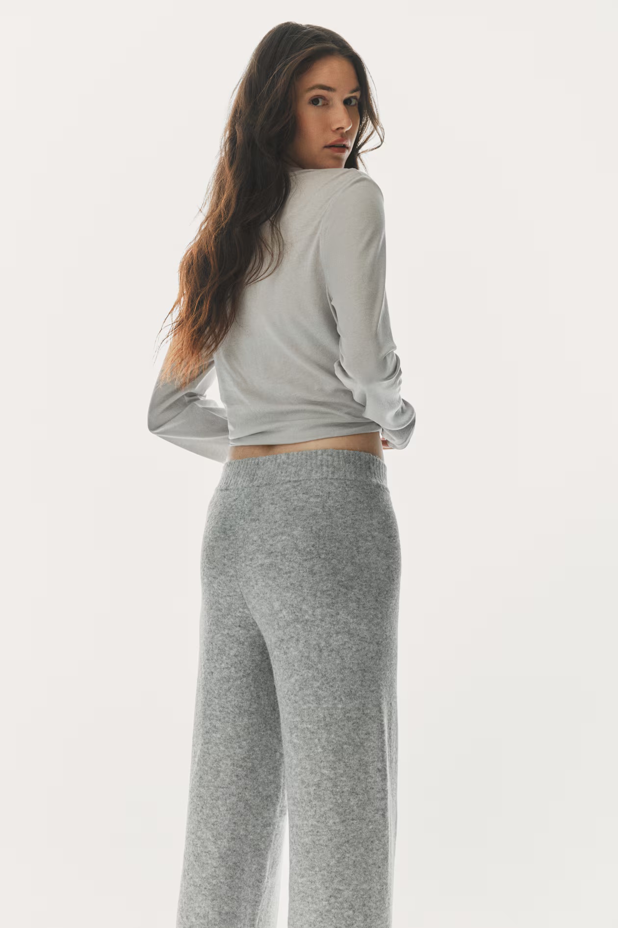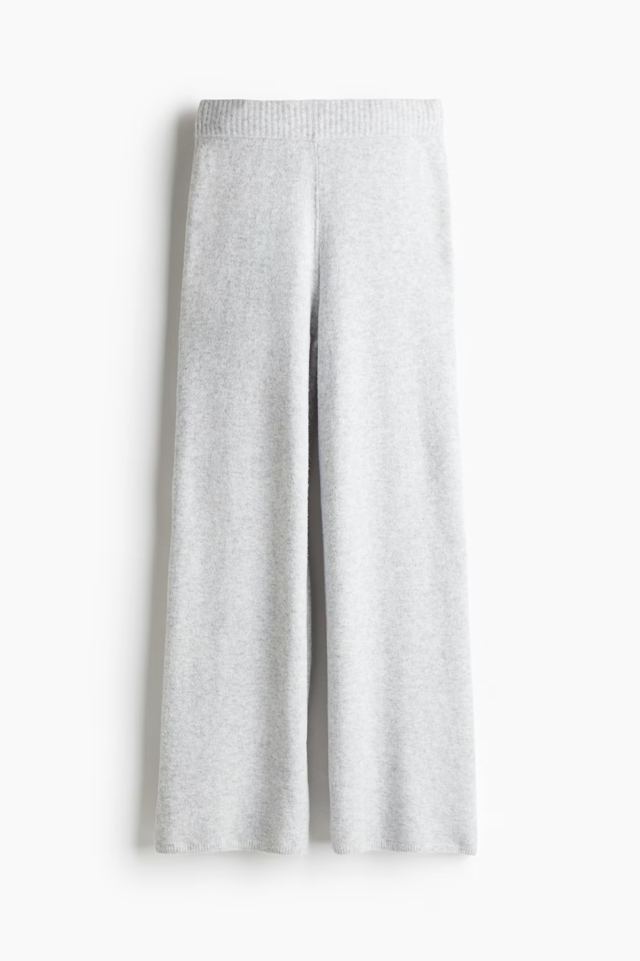 Fine-knit pants in soft, lightly brushed fabric with wool content. High waist, waistband with covered elastic, and straight legs.