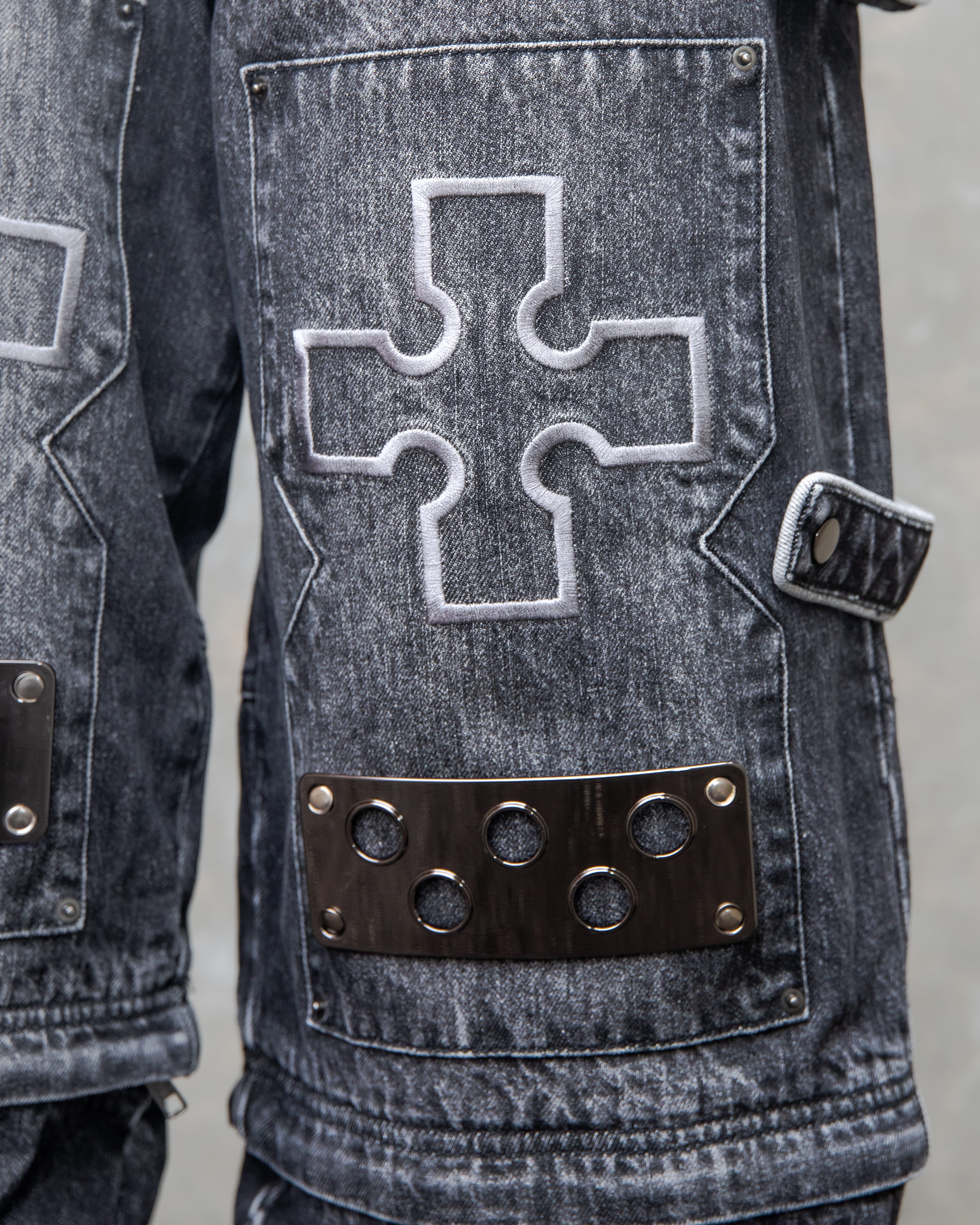 - Embroidered cross at knees