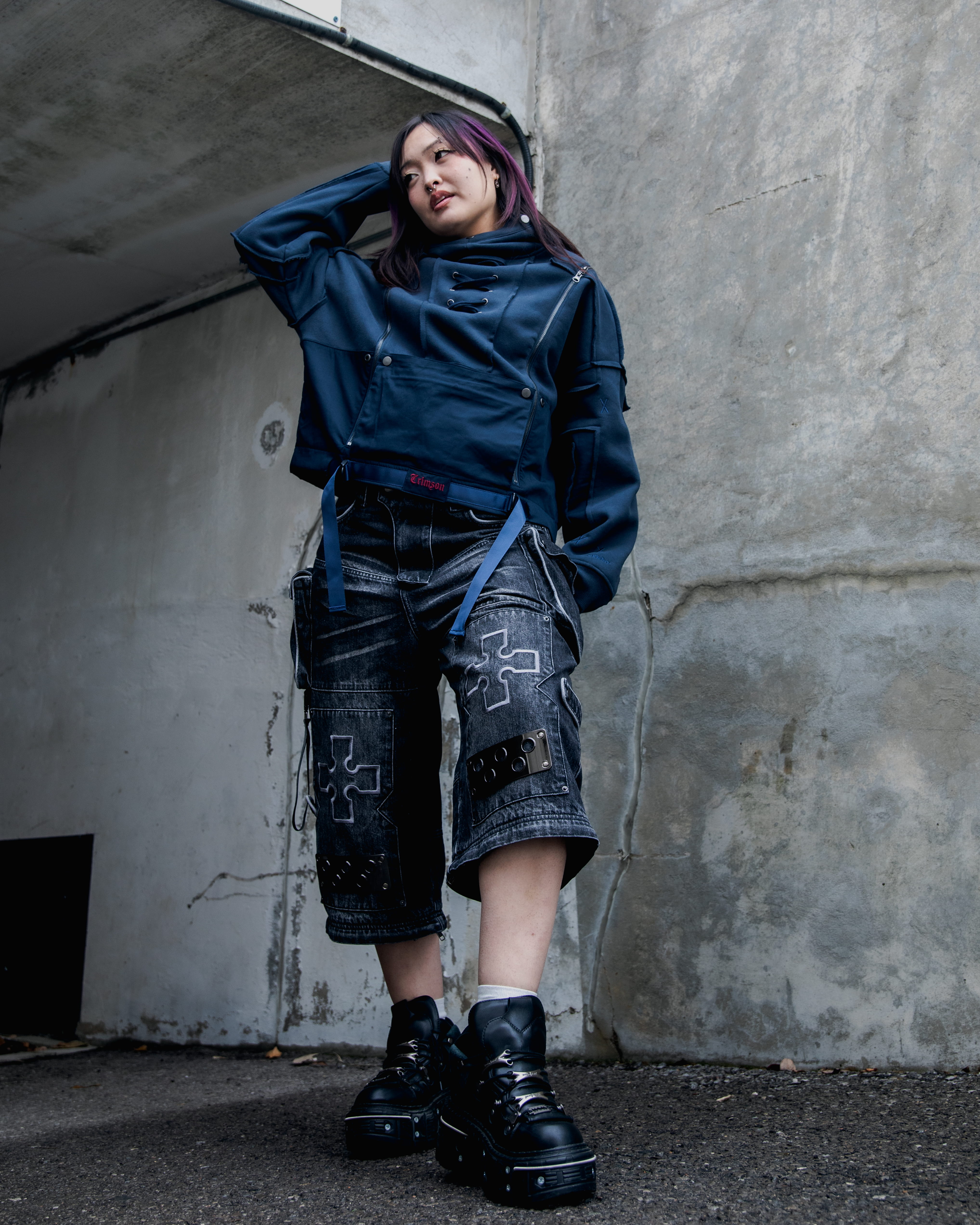 These pants are made from washed 100% cotton denim with contrast panels using the reversed side of the same fabric. Designed with convertible construction to be worn as full-length pants or shorts.