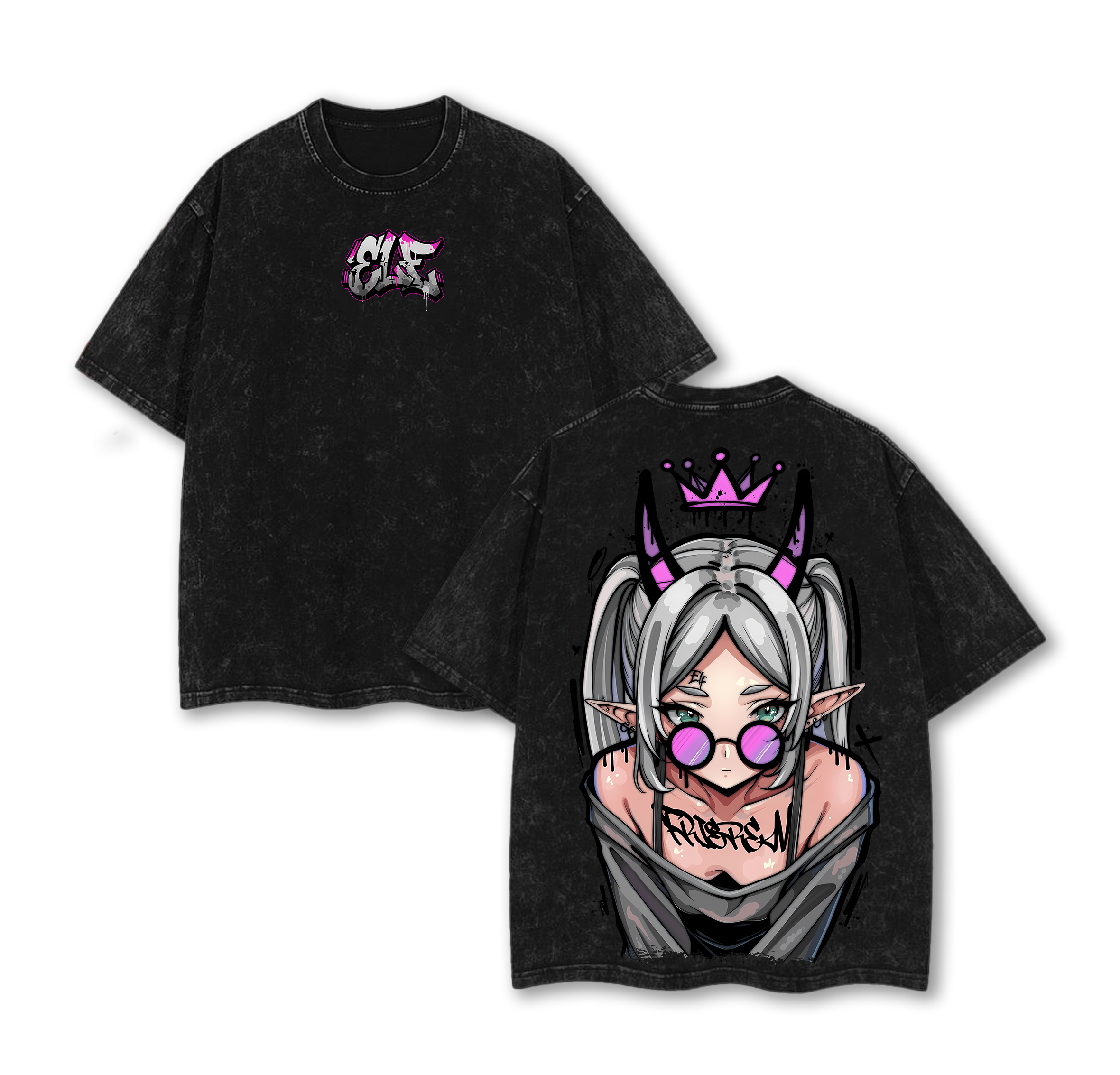 Frieren Streetwear Vintage Washed Anime T-Shirt | Demon Elf Girl Purple Crown Graphic Tee