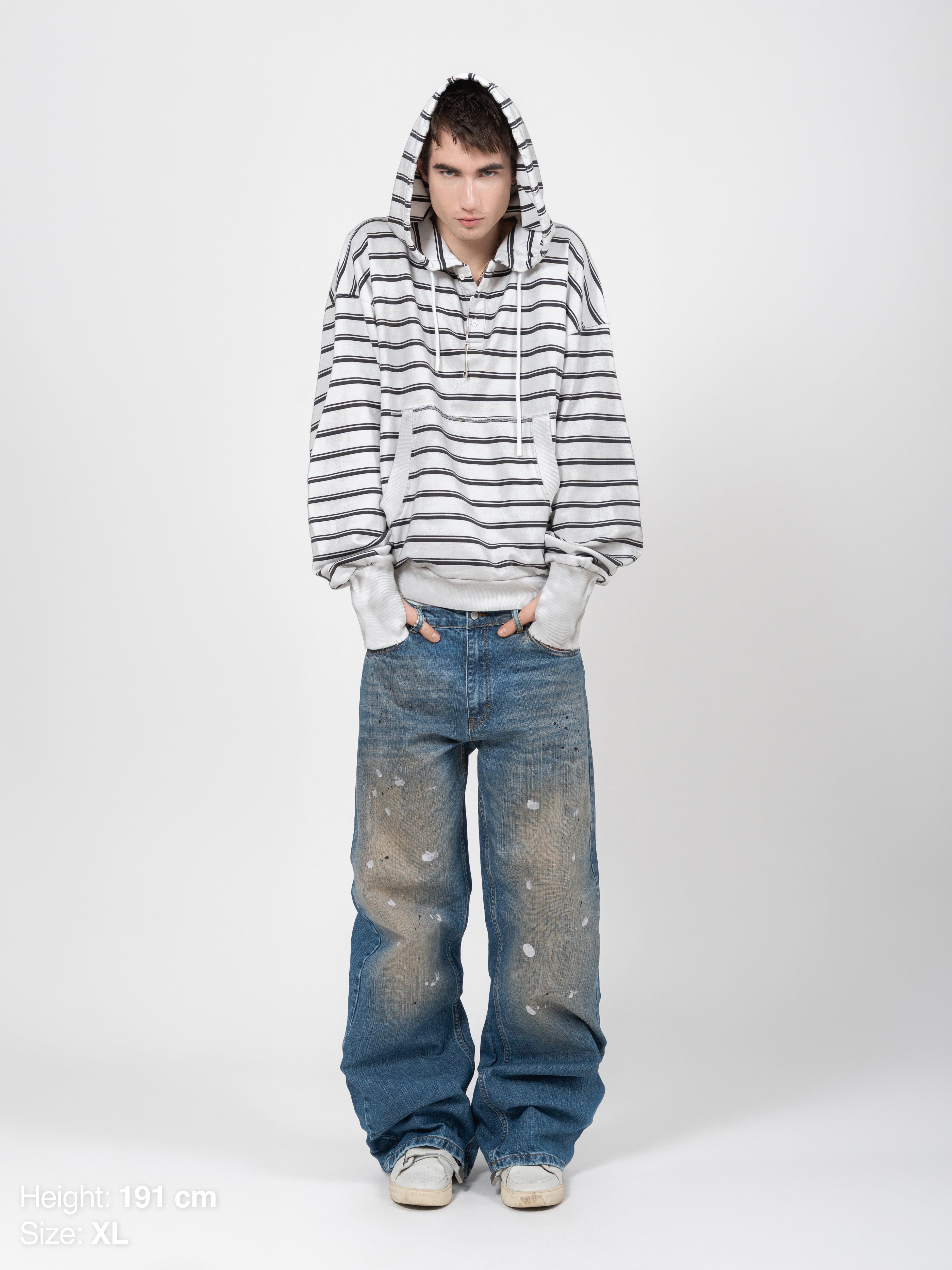 A part of the Spring 26 collection. A henley style hoodie featuring our custom all-over stripe pattern. Inspired by 2010s-era sweatshirts cuts, trims and effects. Finished with a large hood and chunky drawstrings. Washed and distressed for an authentic worn-in look and feel.