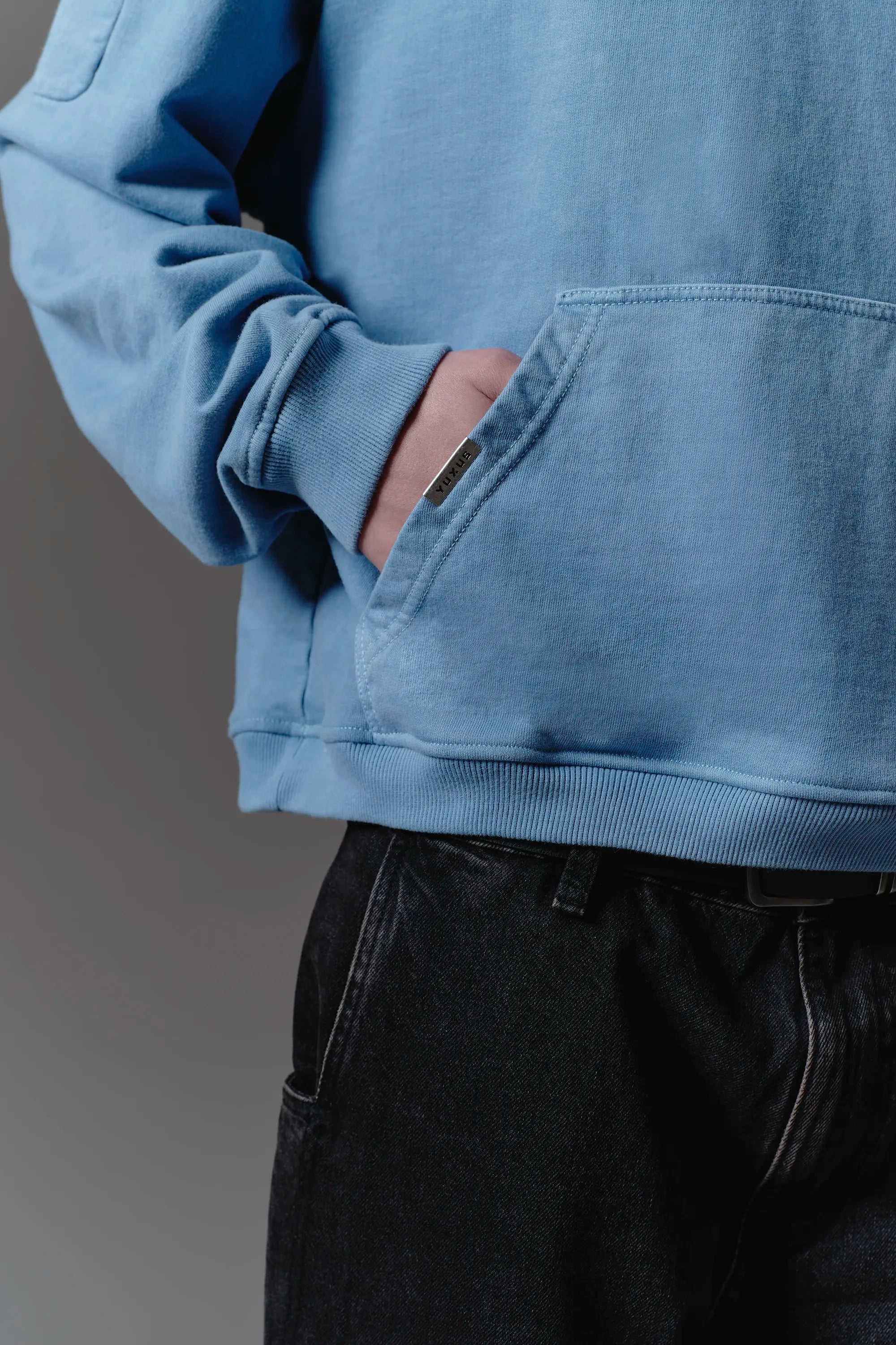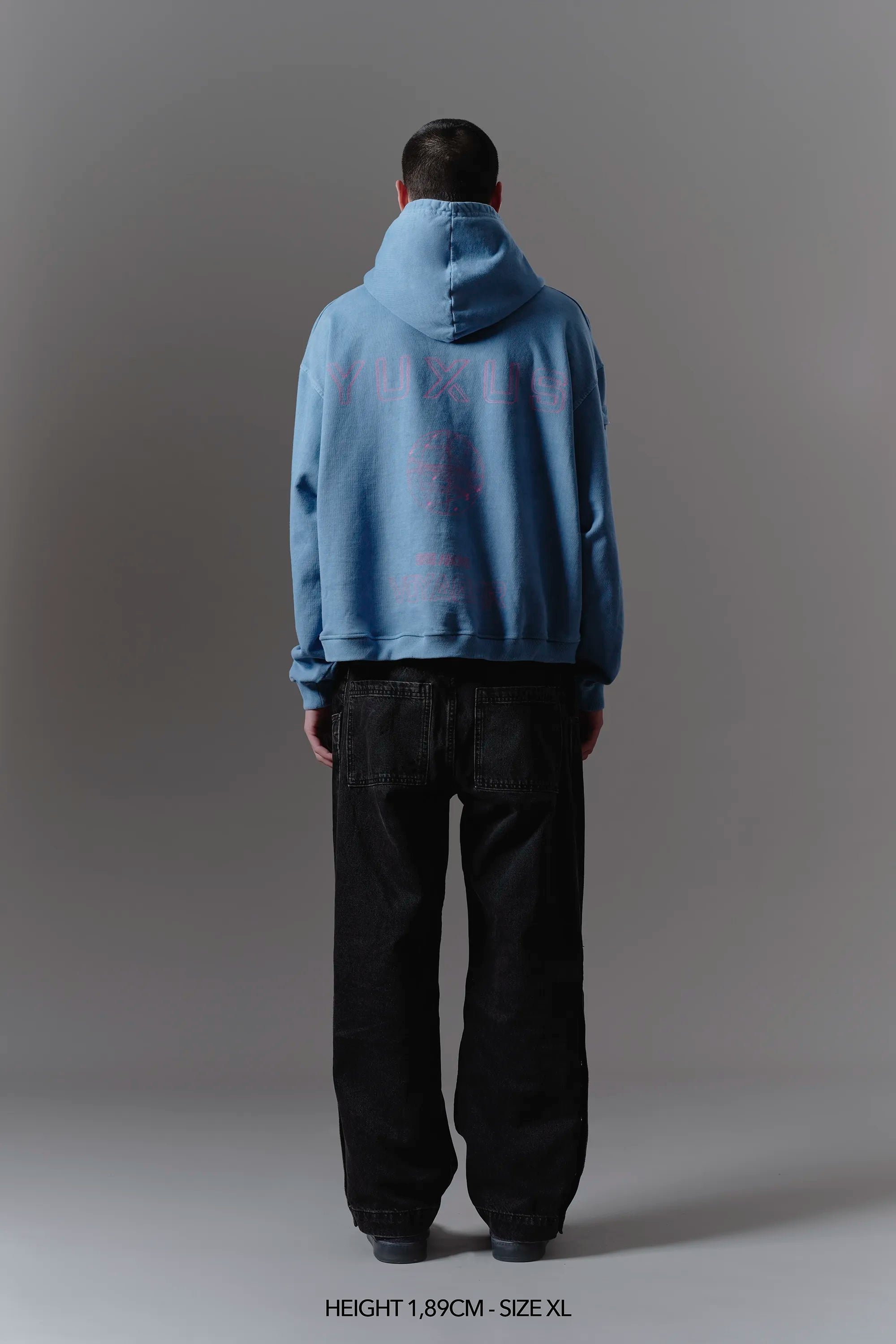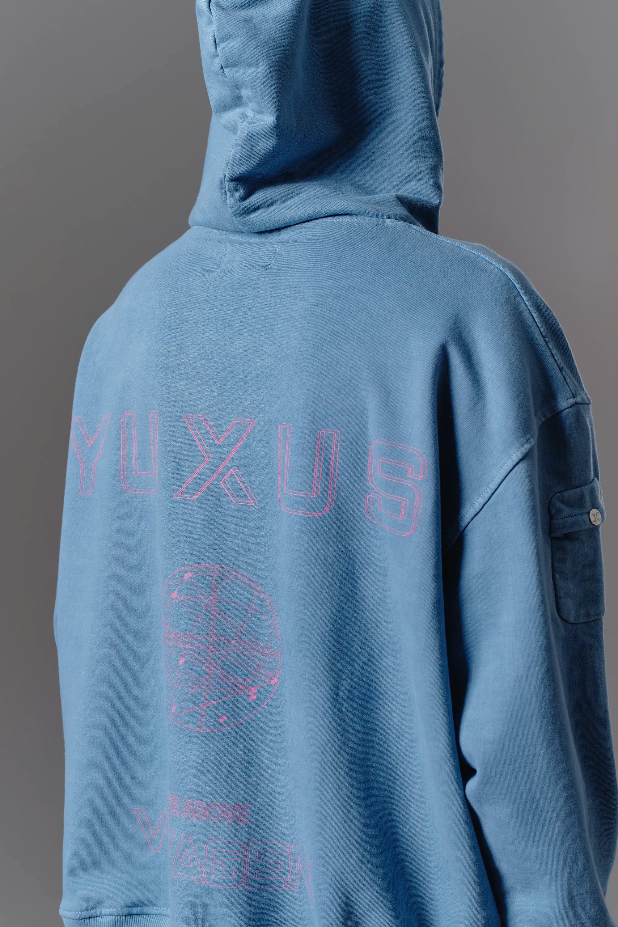 The journey begins here. Introducing the Voyager hoodie in kale blue, designed with a global vision to accompany you anywhere. Crafted from premium materials with oversized embroidered details and vibrant tones, this piece redefines functionality and style.