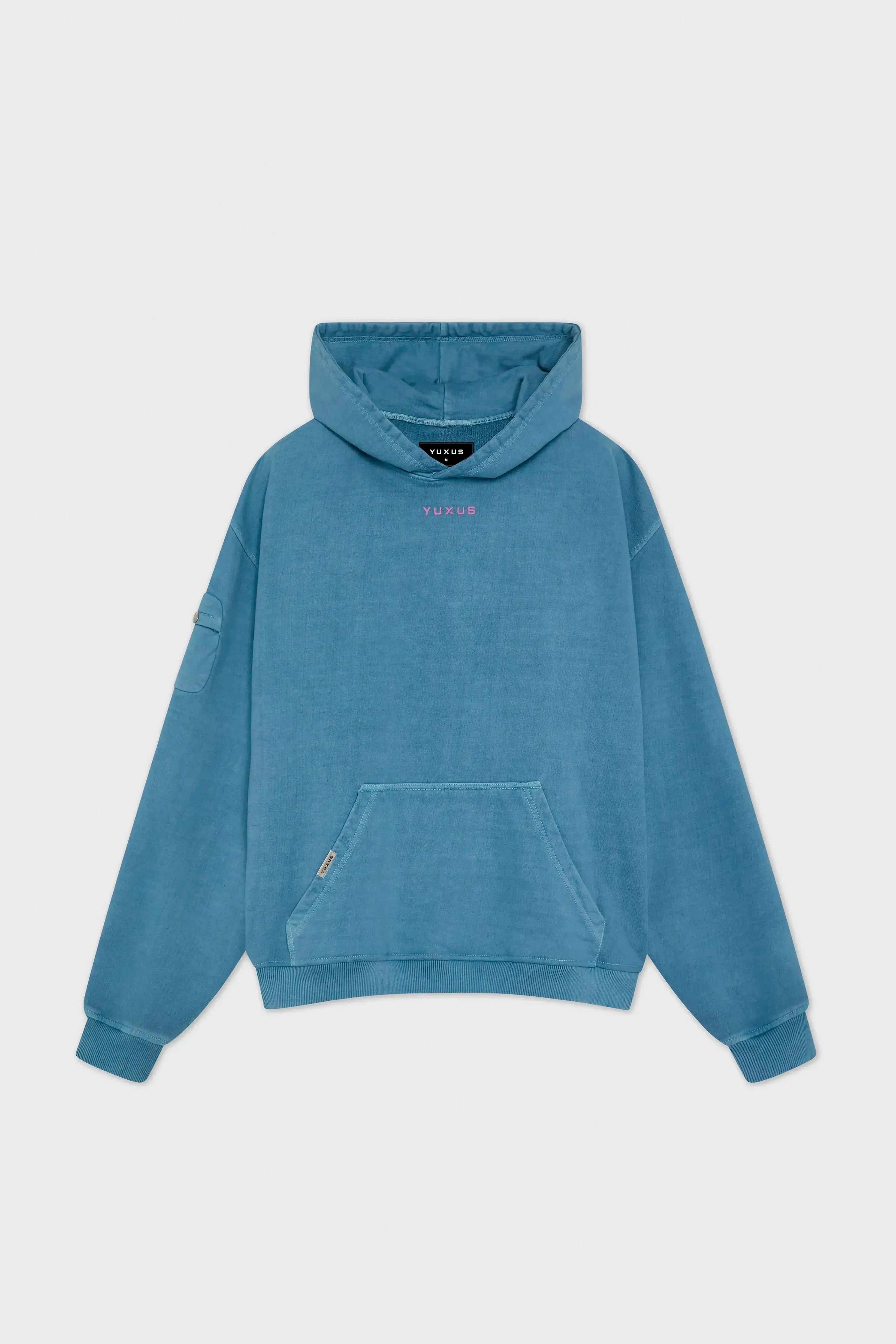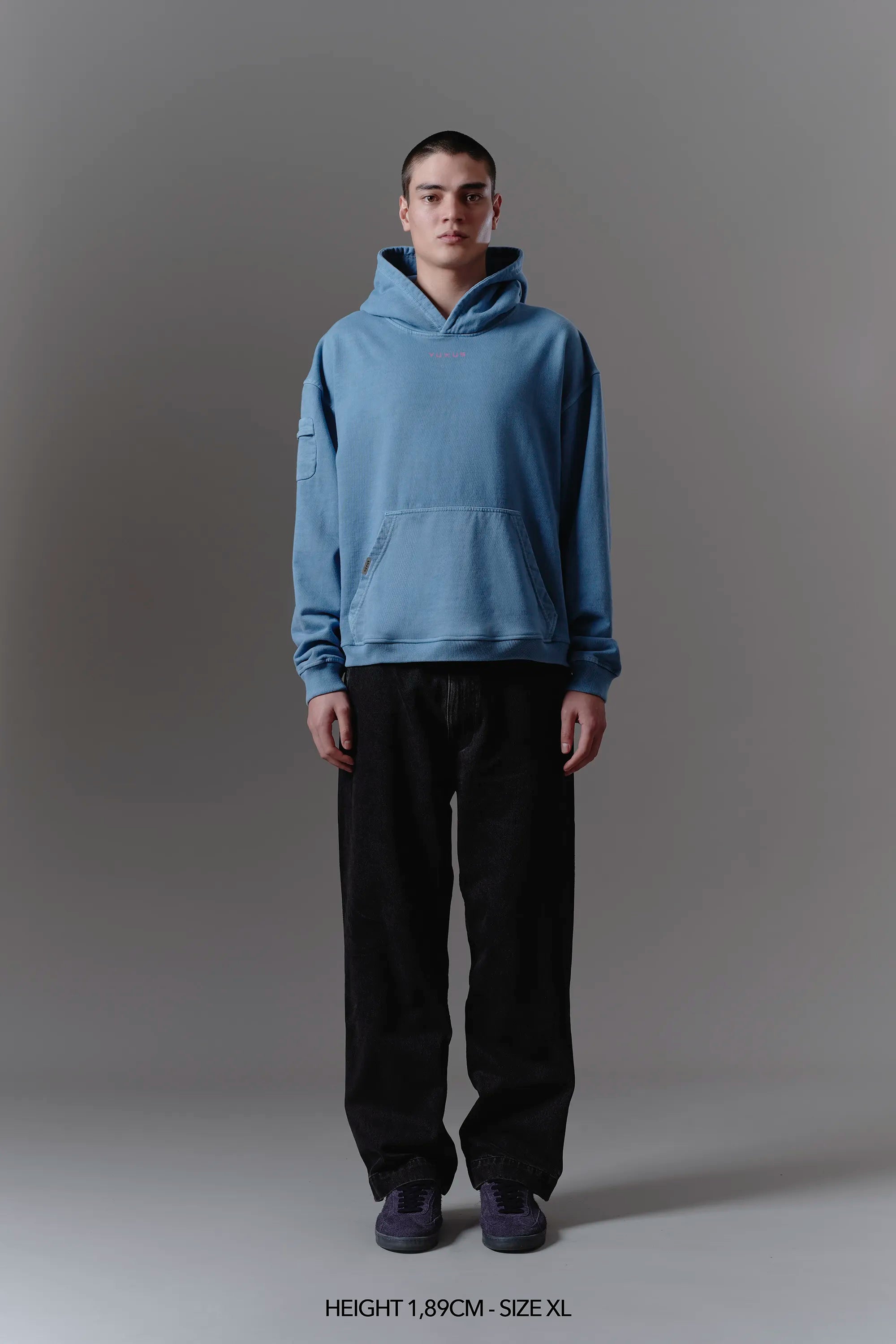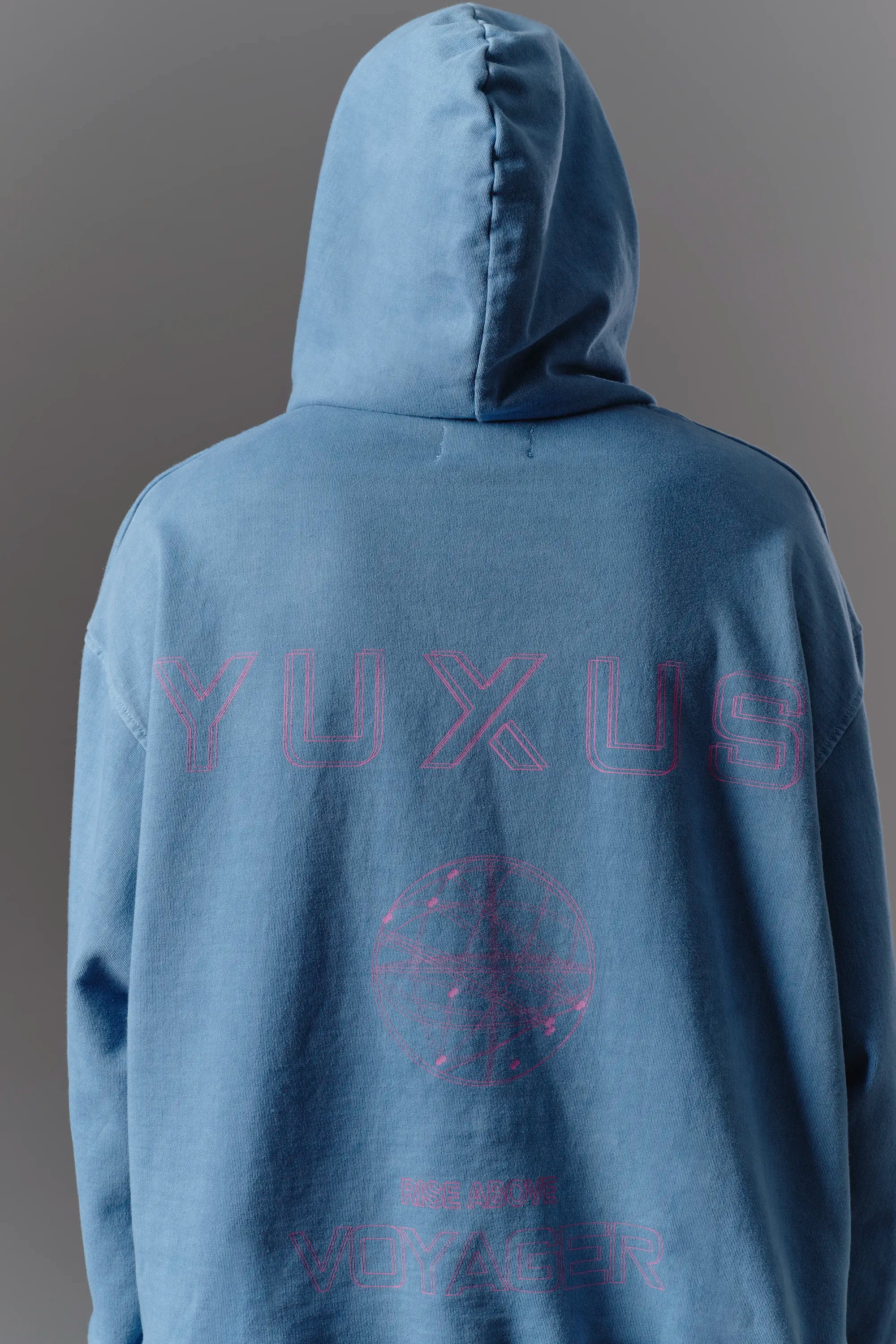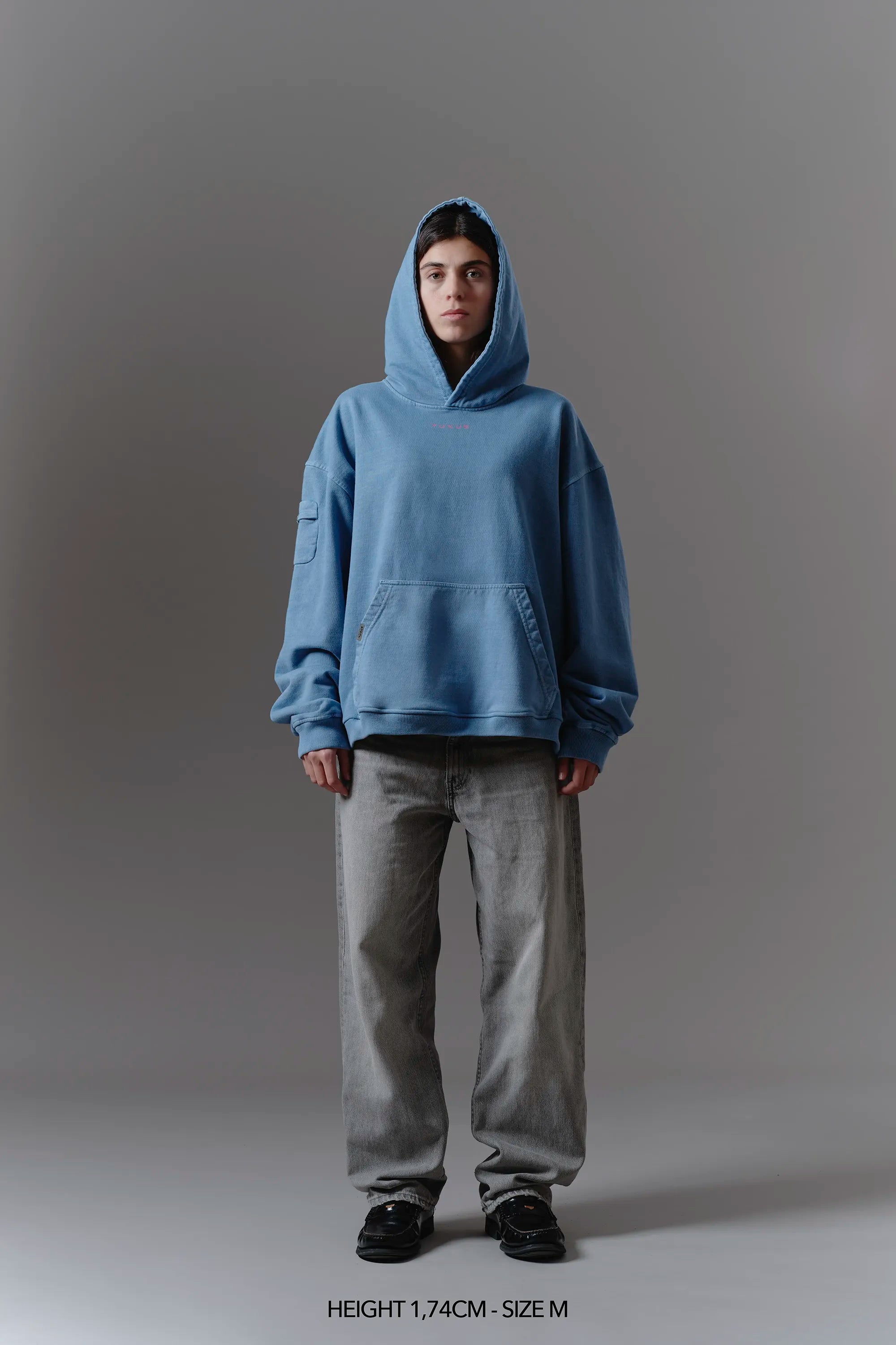 The journey begins here. Introducing the Voyager hoodie in kale blue, designed with a global vision to accompany you anywhere. Crafted from premium materials with oversized embroidered details and vibrant tones, this piece redefines functionality and style.