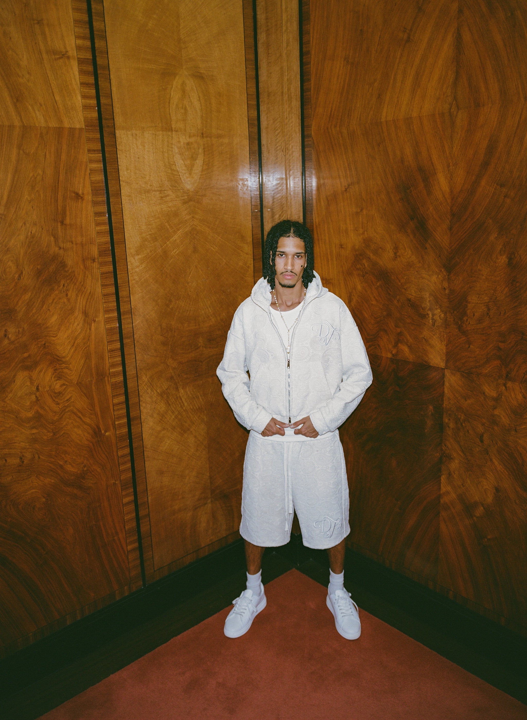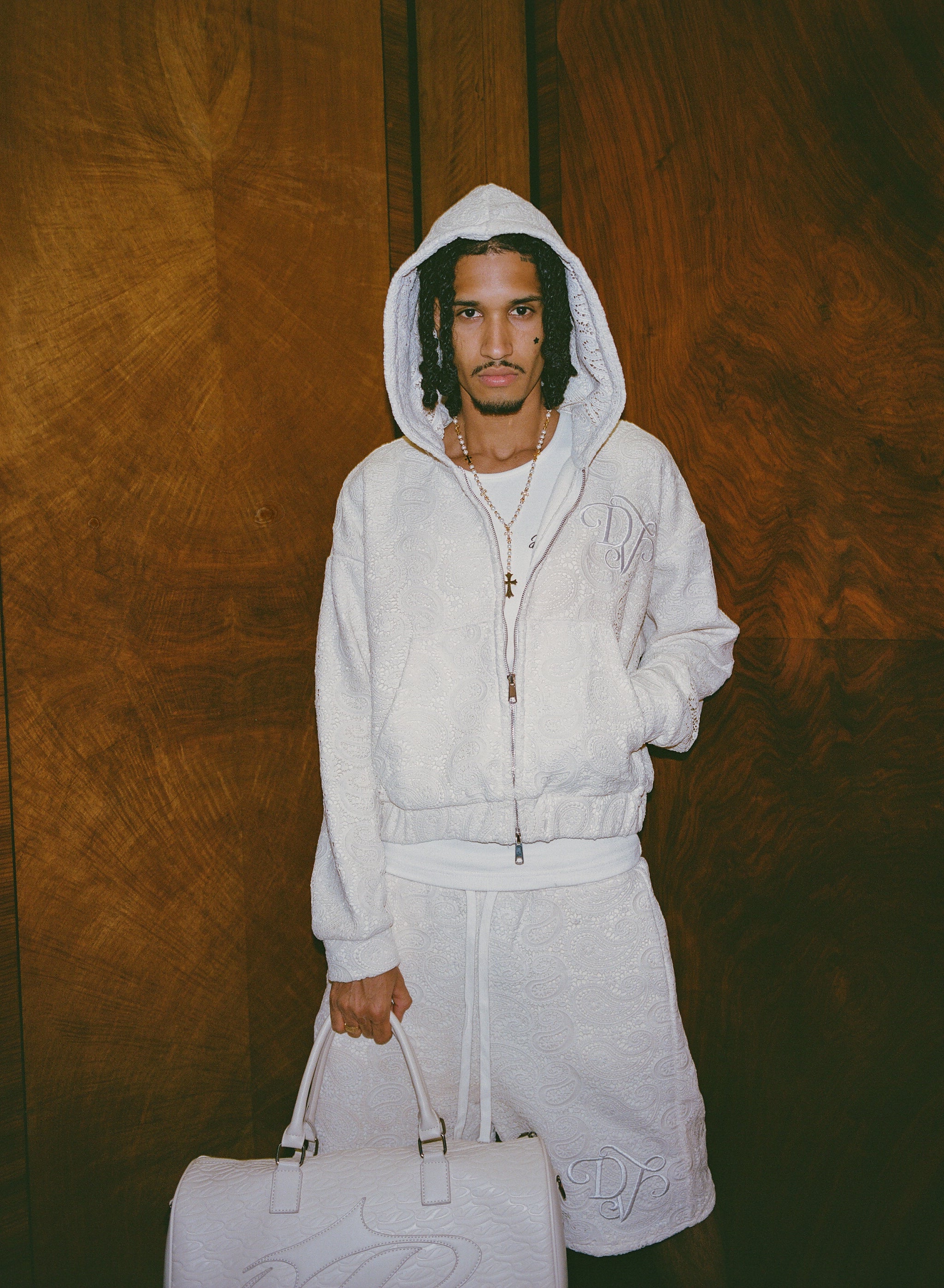 crafted with paisley crochet and French terry fabrics, featuring a double-layered build and an embroidered emblem.