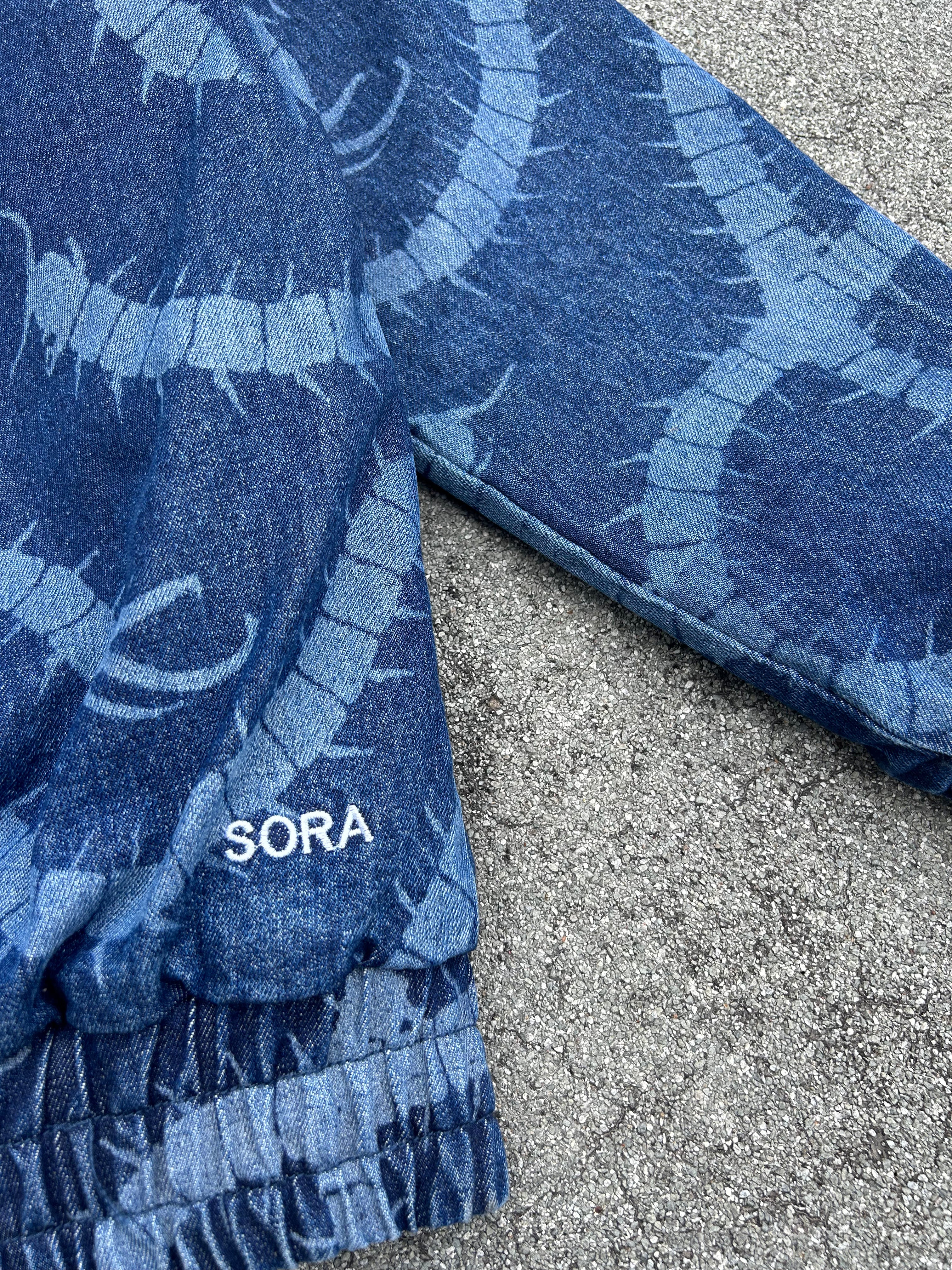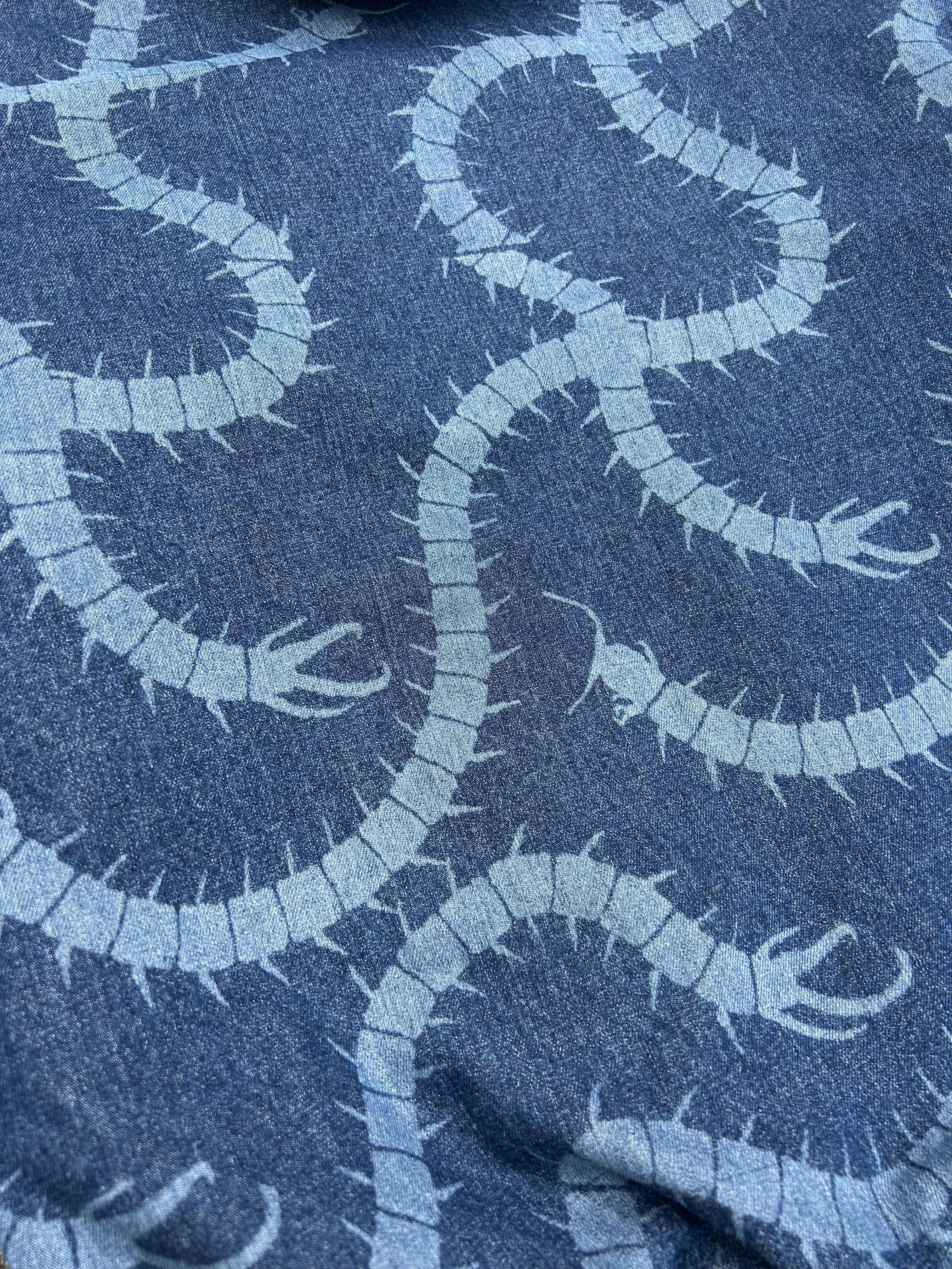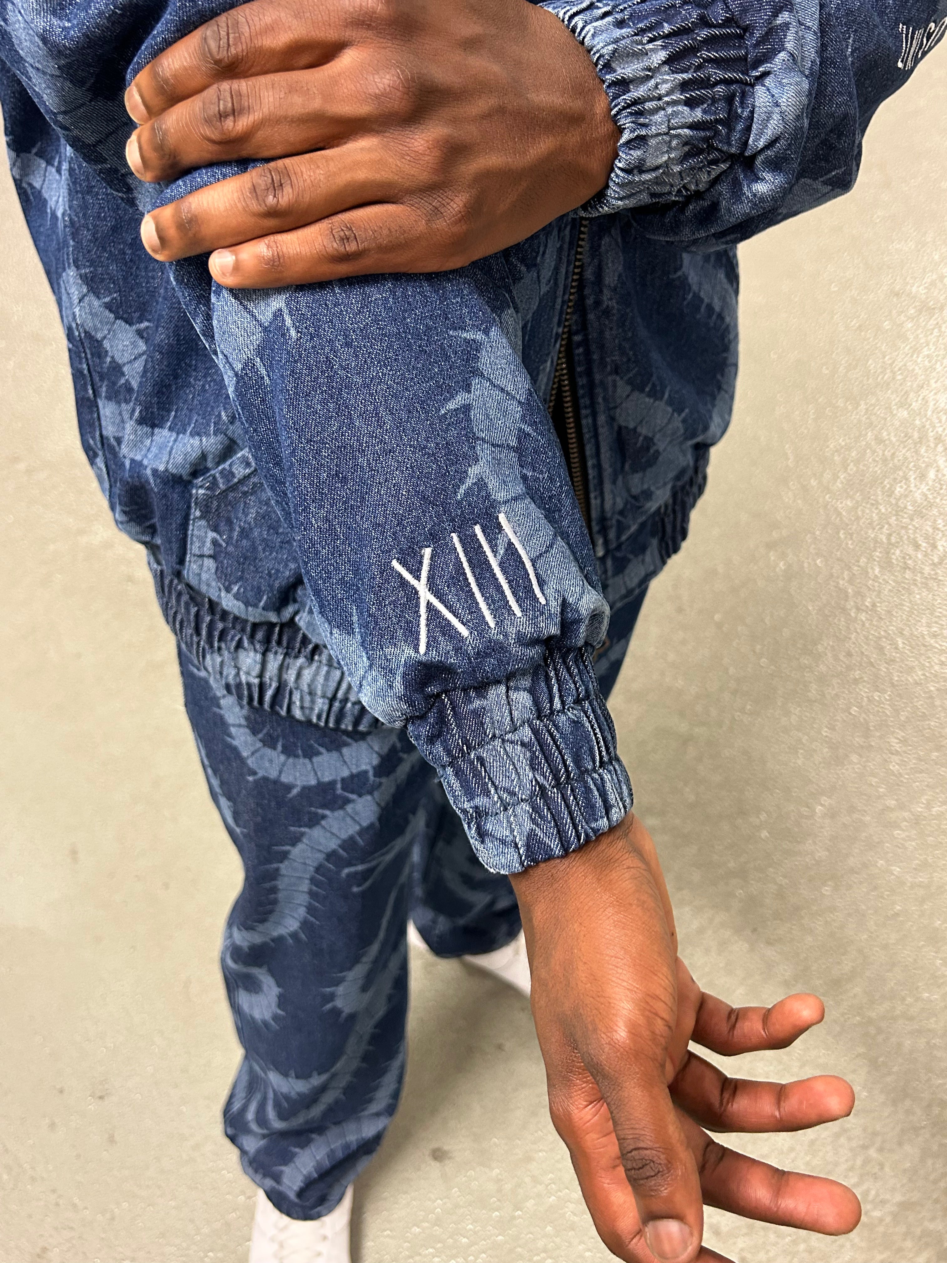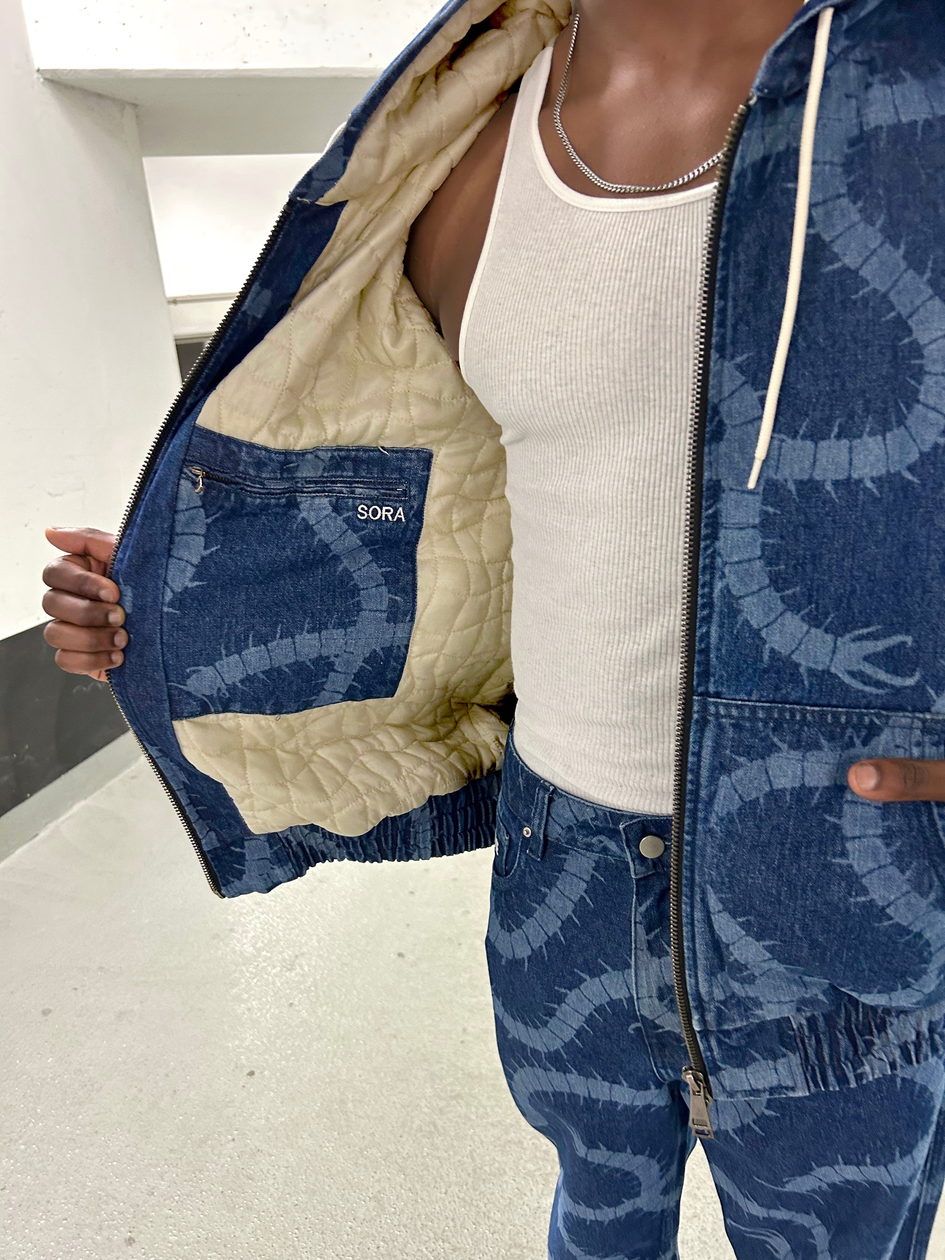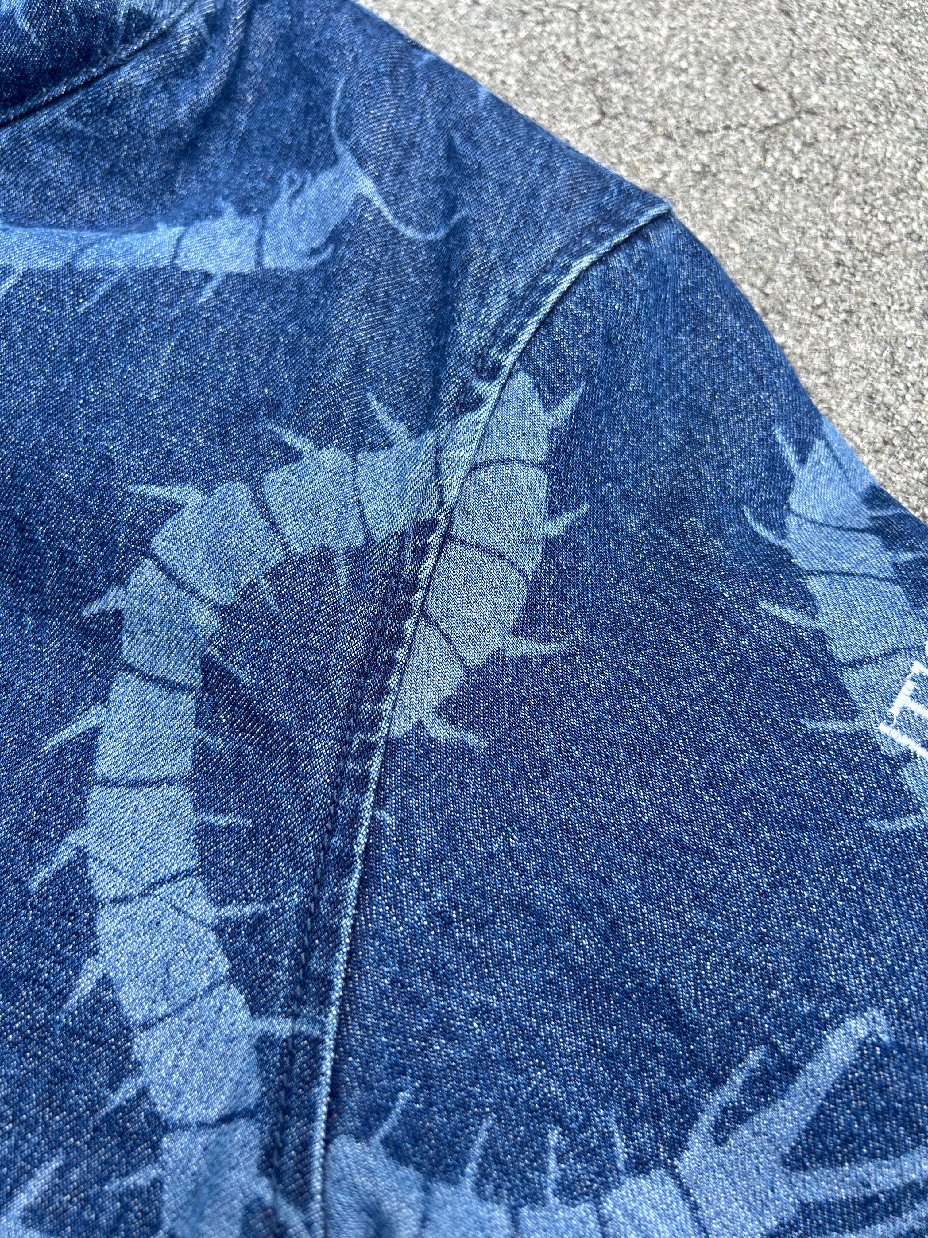Heavyweight Denim Jacket with laser-printed designs on the front and back and embroidery design on the sleeve. This Jacket is made of 100% denim. Soft and comfortable, warm and breathable.