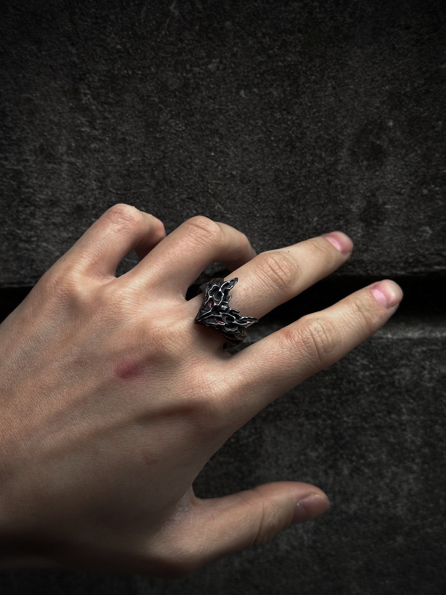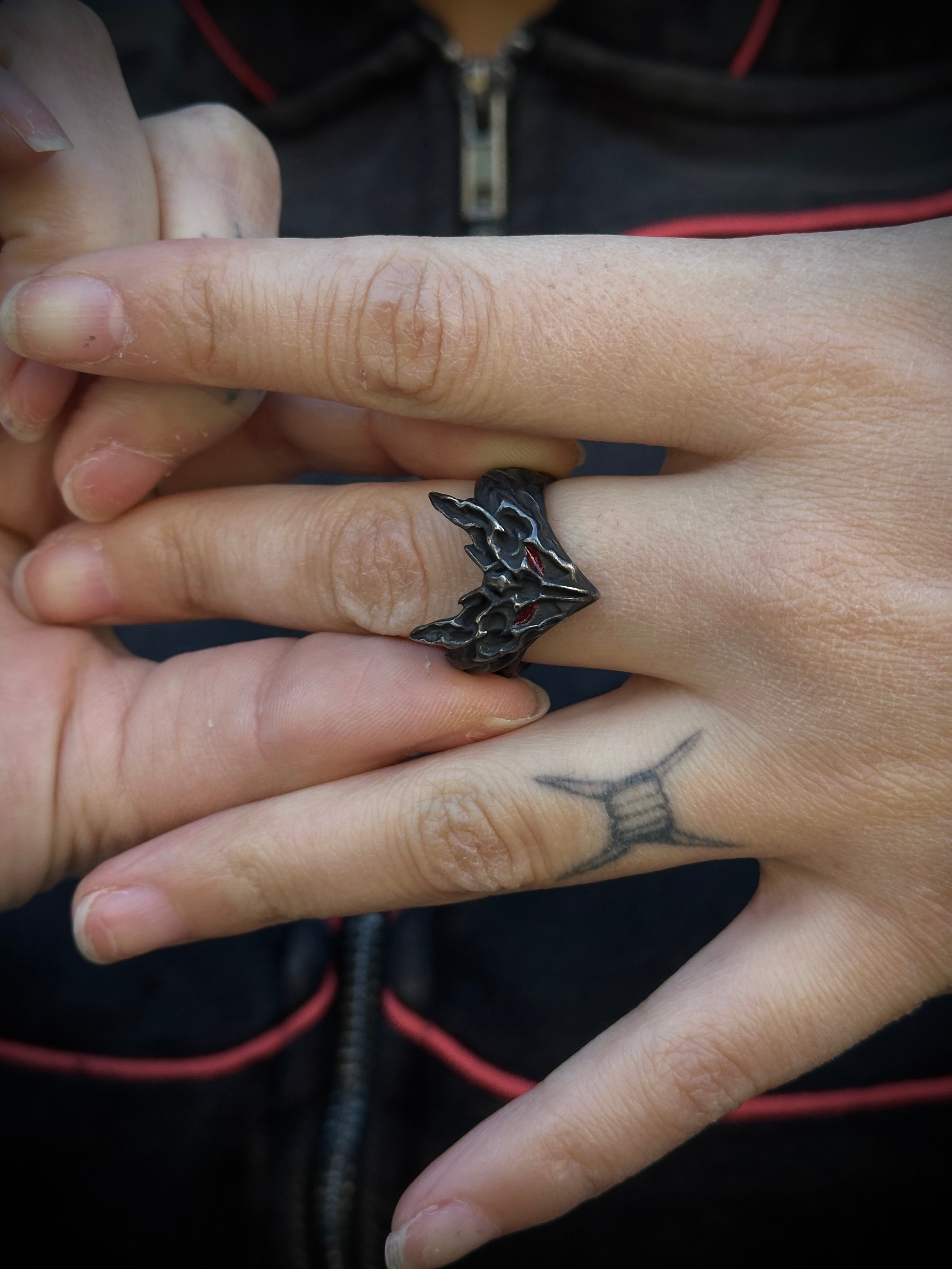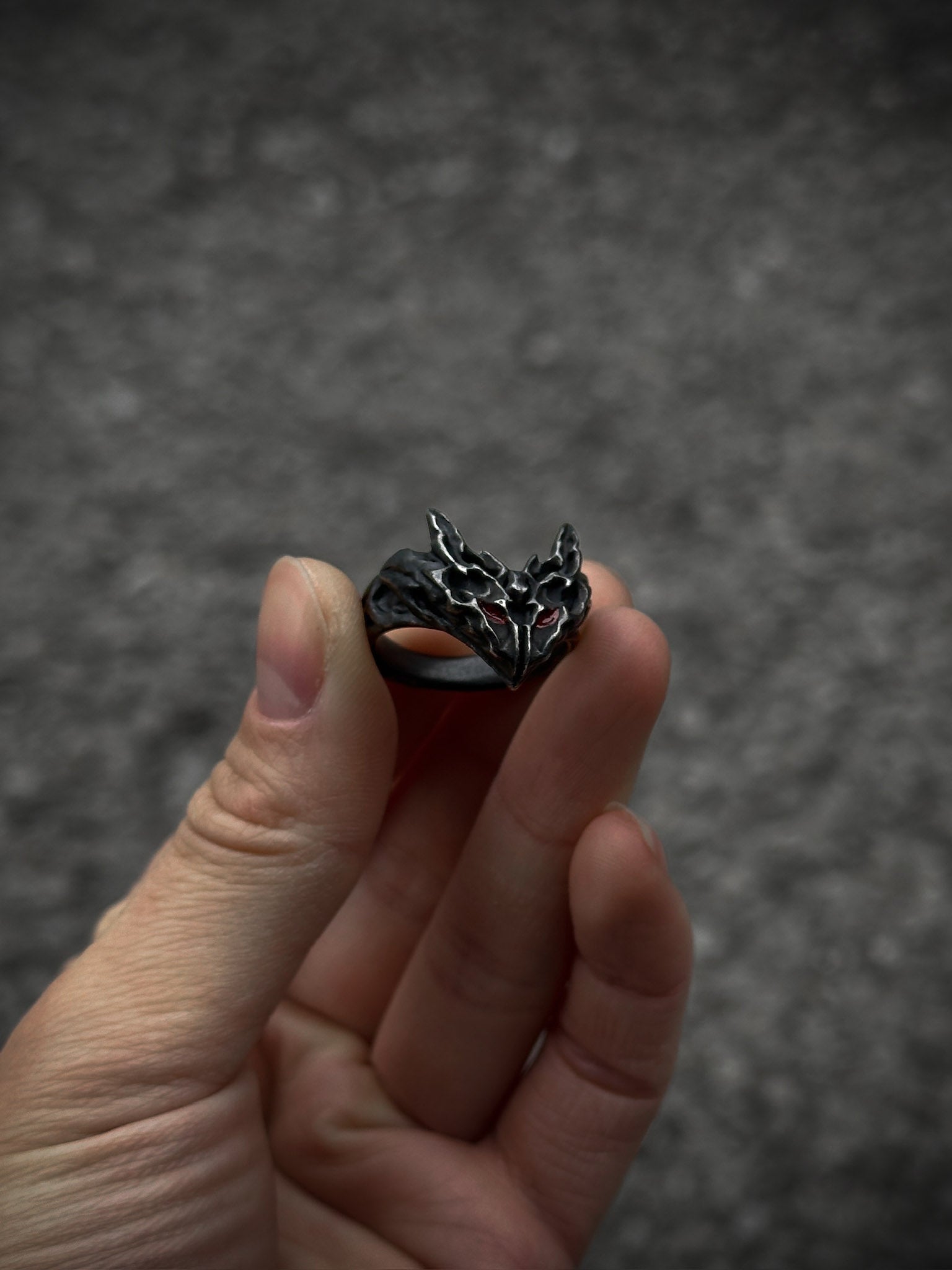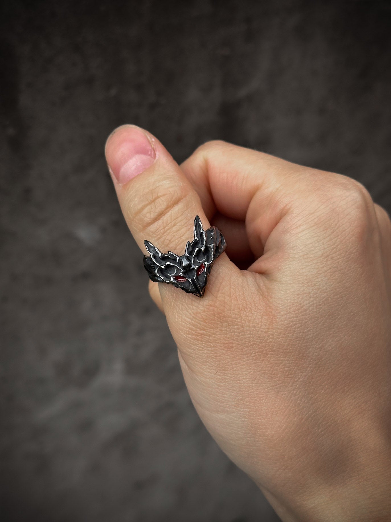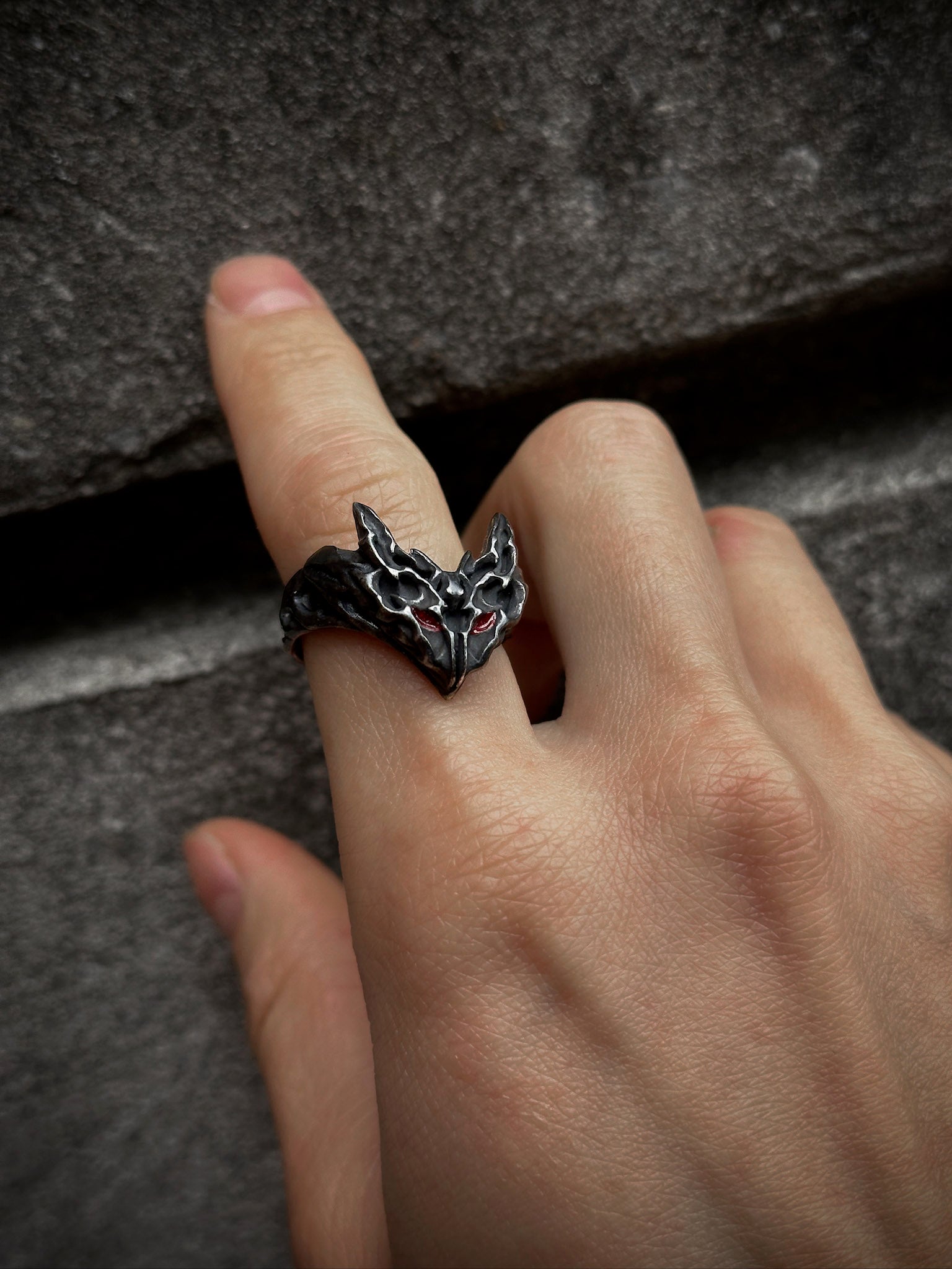This ring is cast from 100% 316L stainless steel with a blackened finish, giving it a dark look. The eyes are filled with inpainted red enamel, adding a small but striking detail that makes the piece stand out.