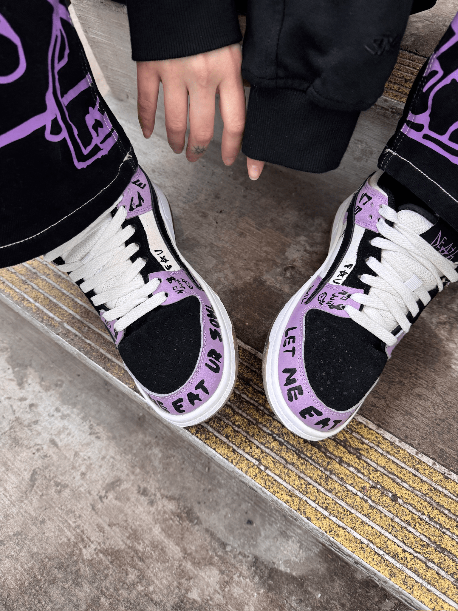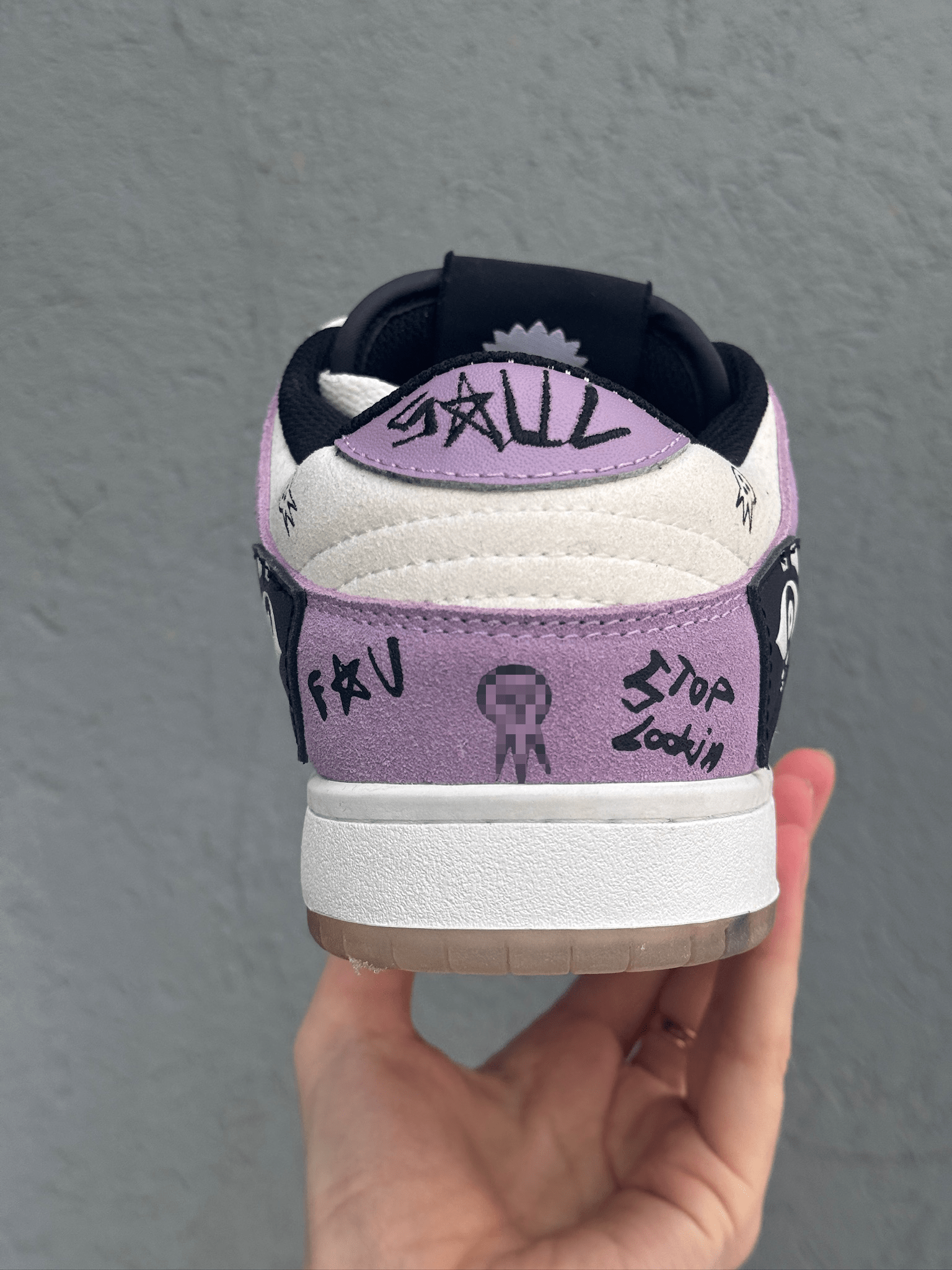 These sneakers are made of real leather and suede with stitched-up, printed and embroidery designs on the front, back, and sides. Comfortable and durable to skate.