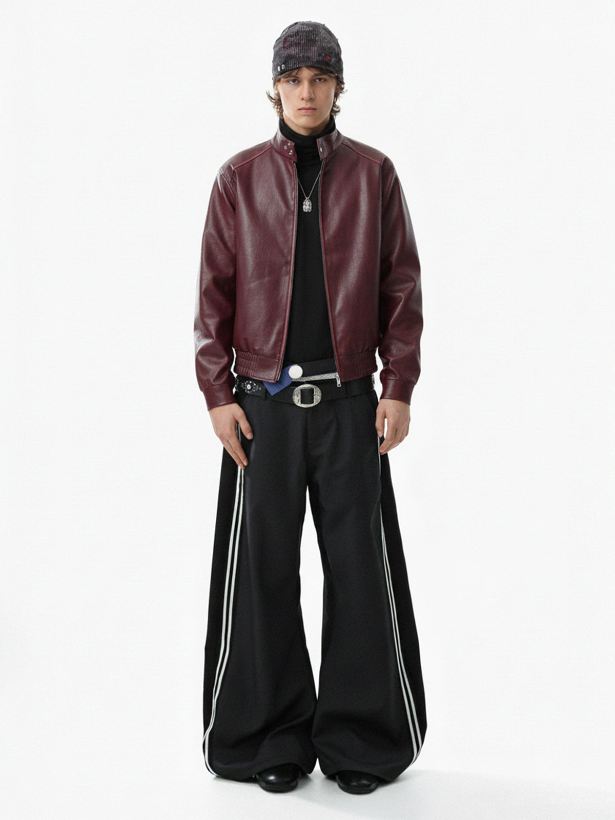 • Design Elements: Contrasting leather collar, silver zipper accents, sleek pocket design