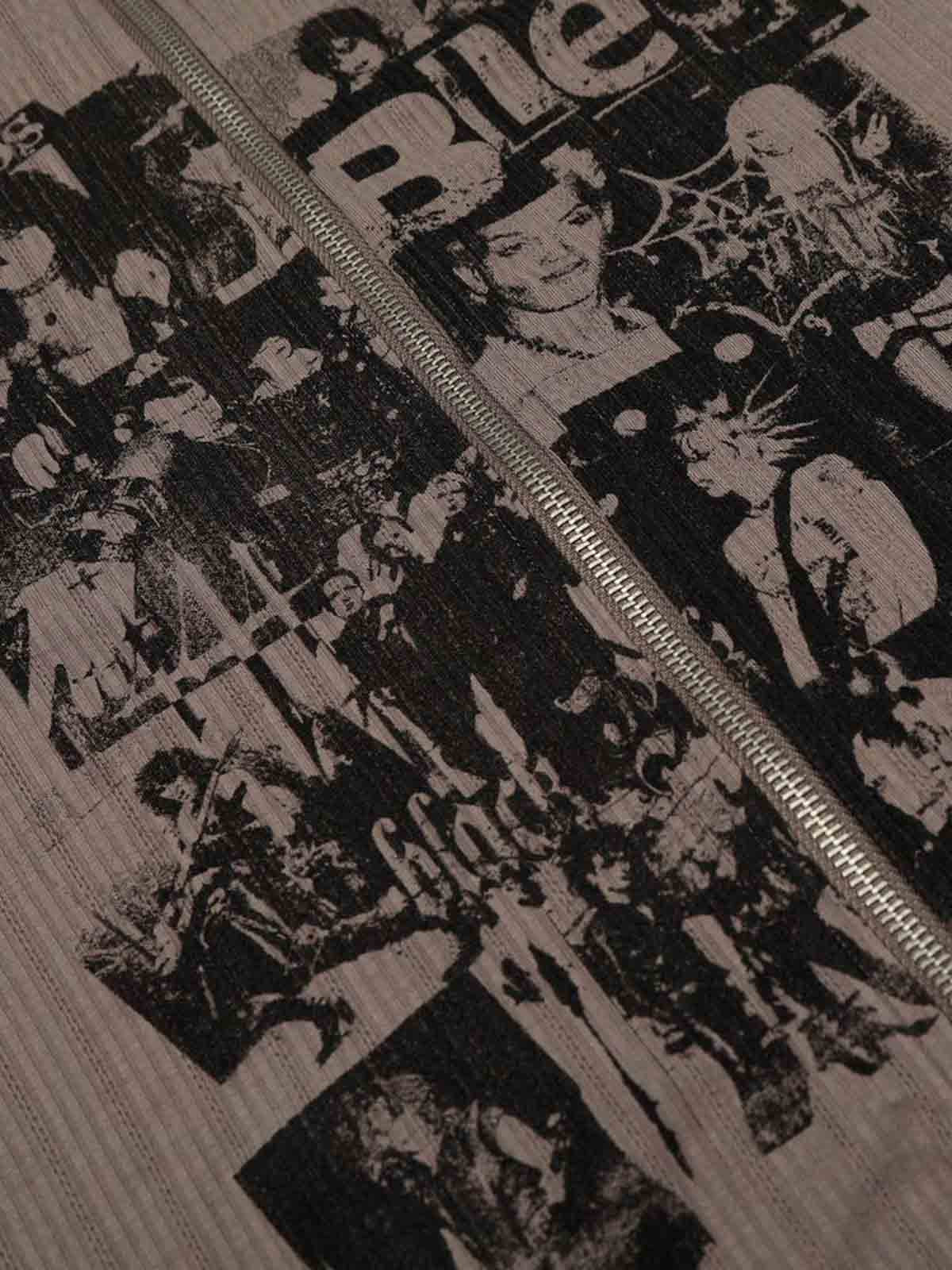 • Details: Front Zip Closure, High Neckline, Long Sleeves, Central Graphic Panel with Vintage-Style Imagery and Text