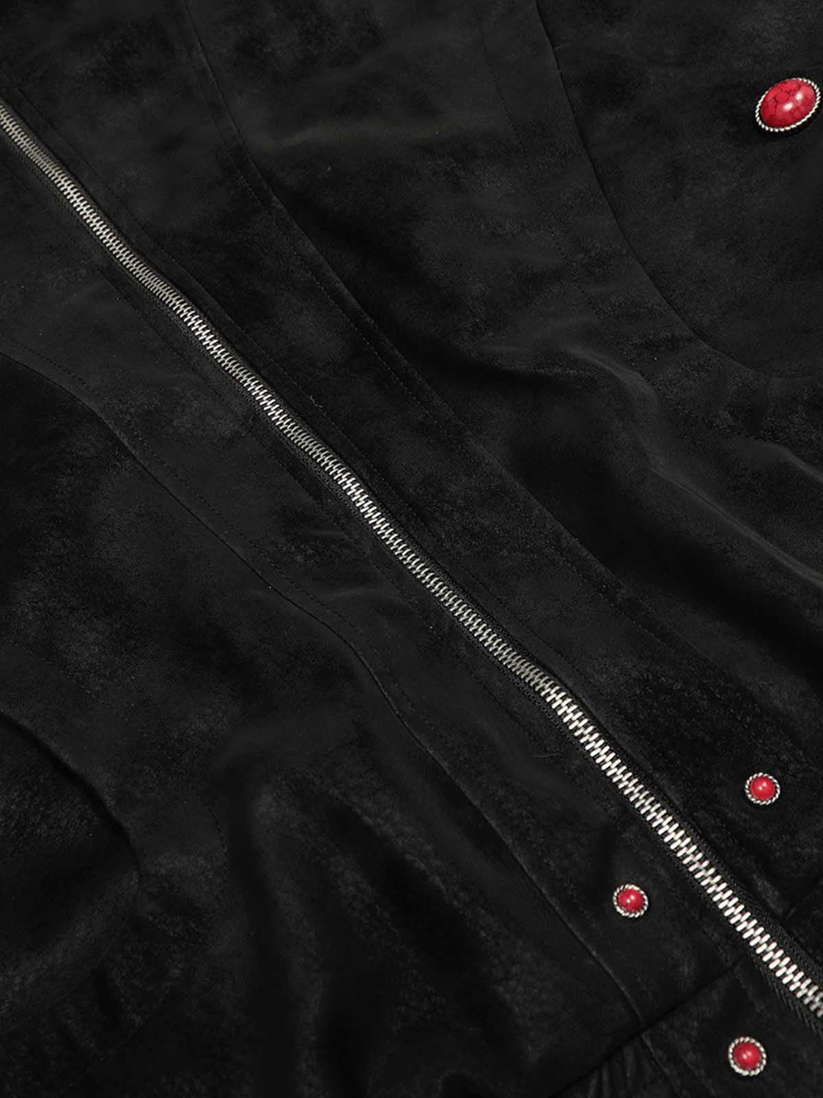 • Red button accents provide a stylish contrast against the black jacket.