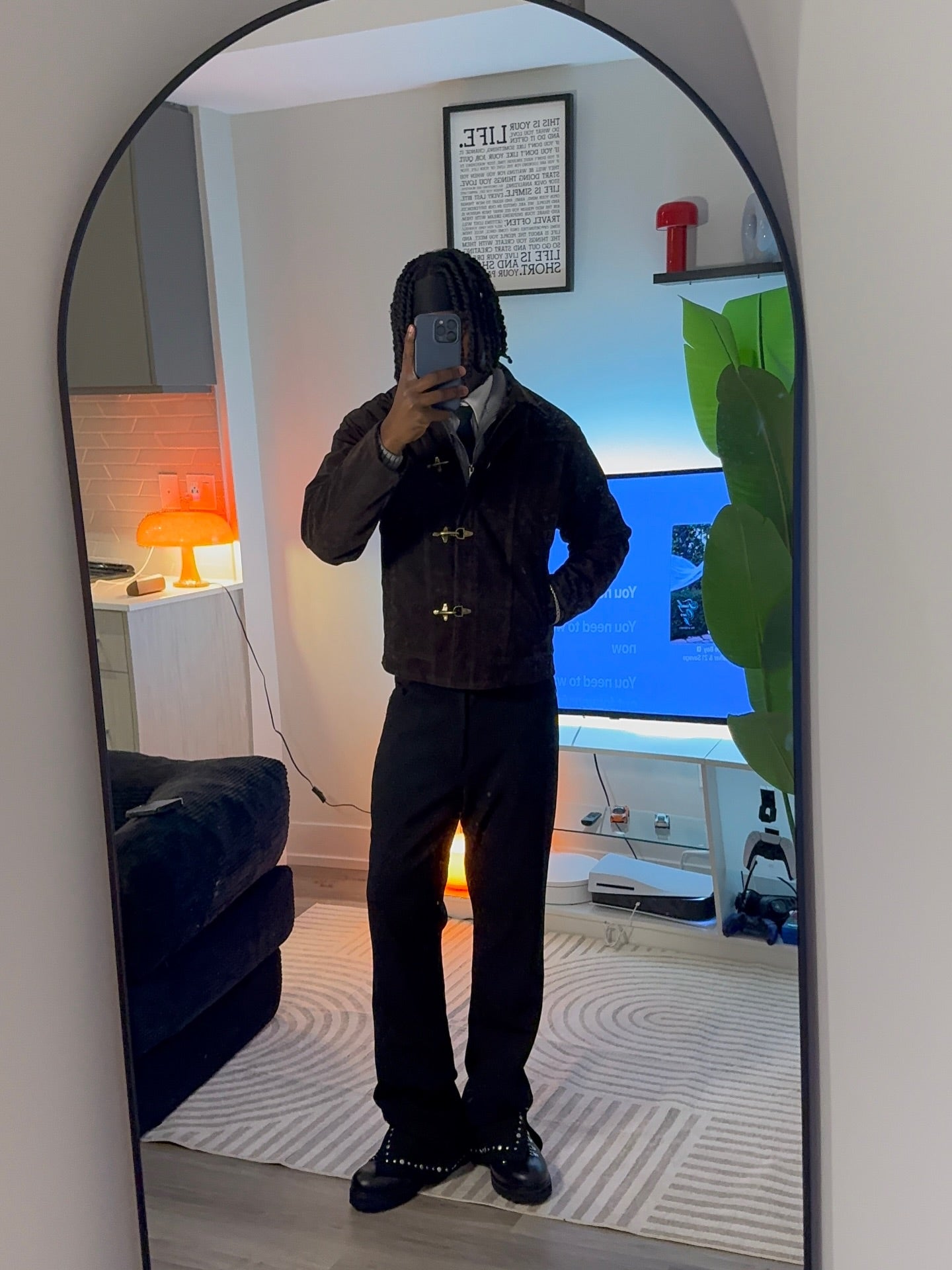 • Design Elements: Classic toggle button closure, two front pockets, sleek collar design