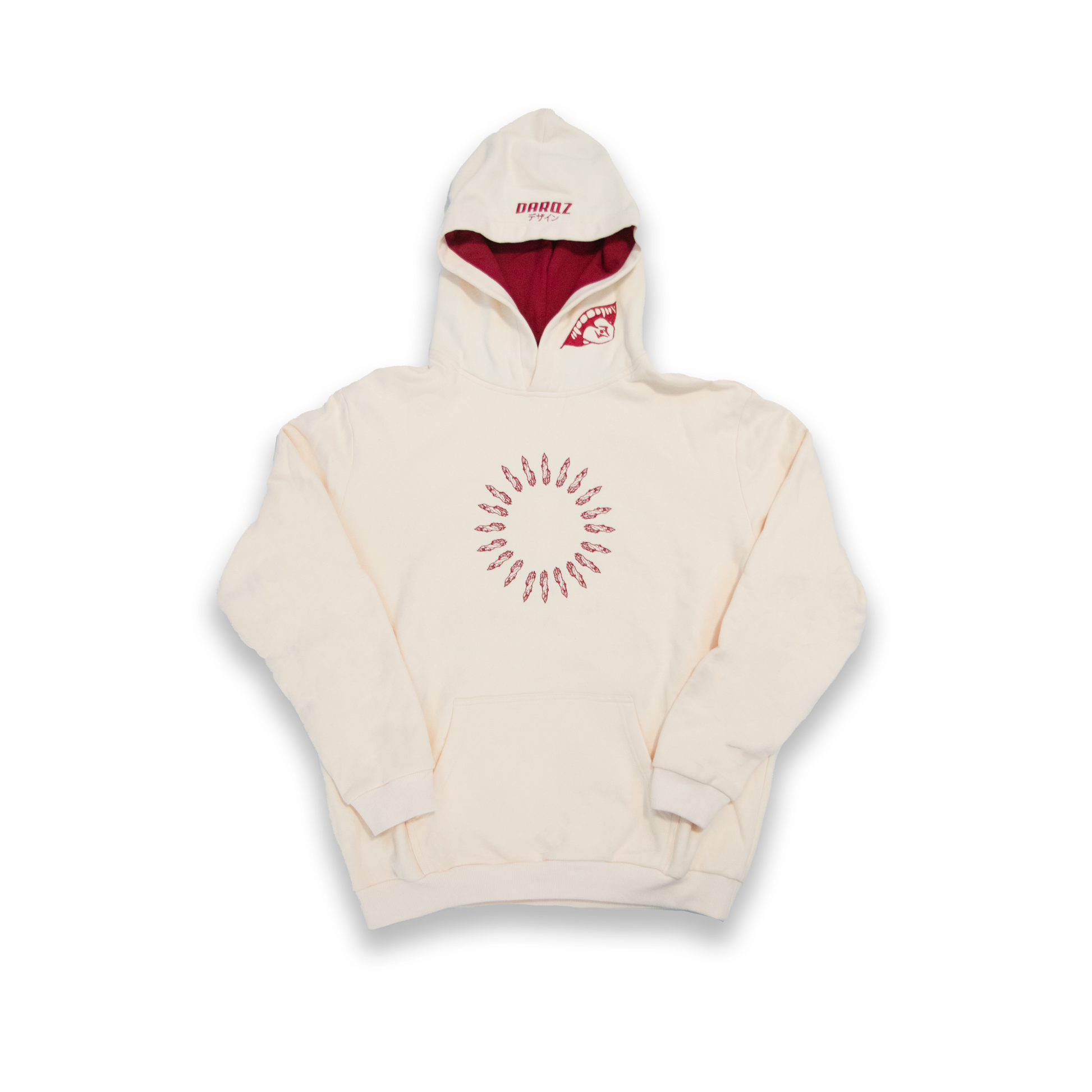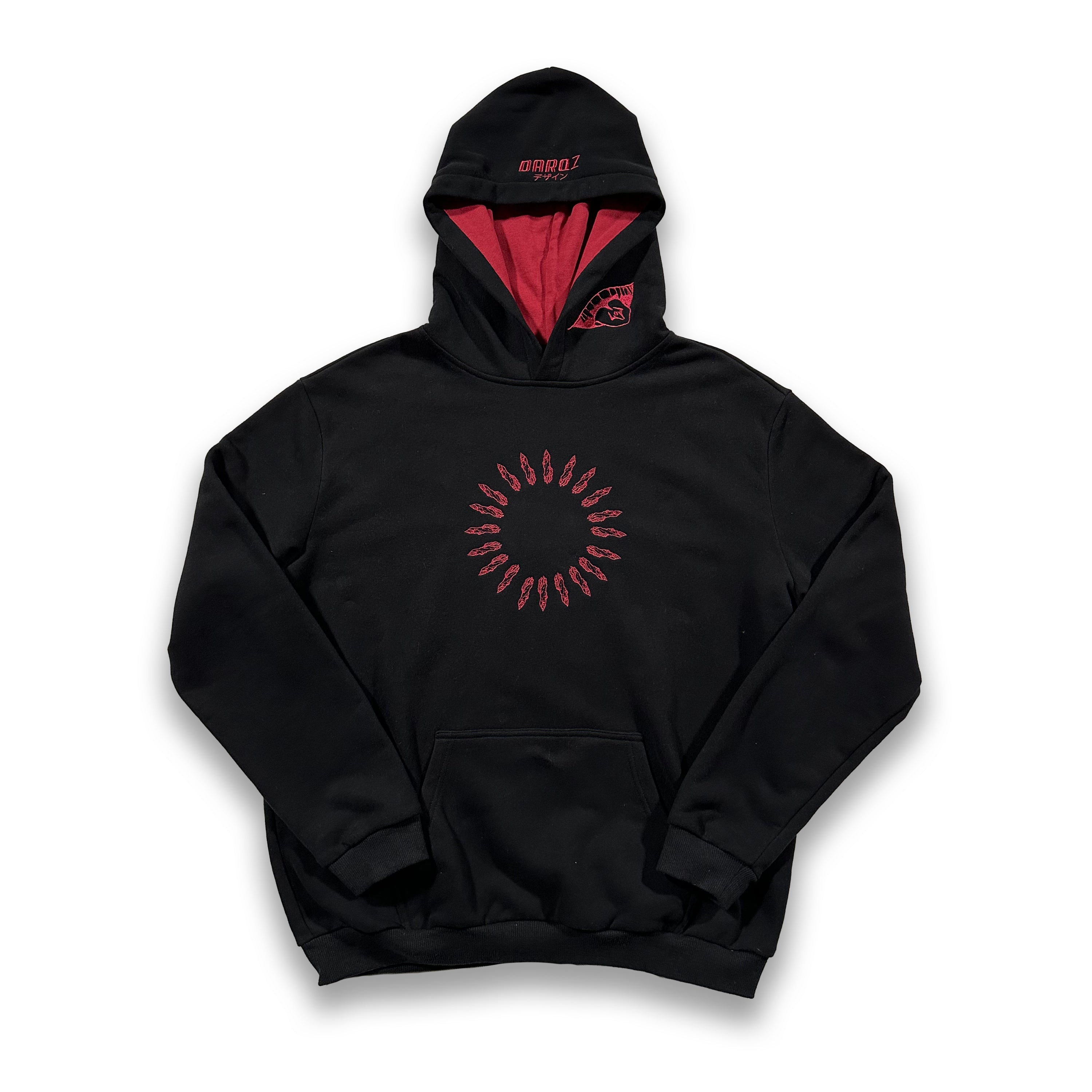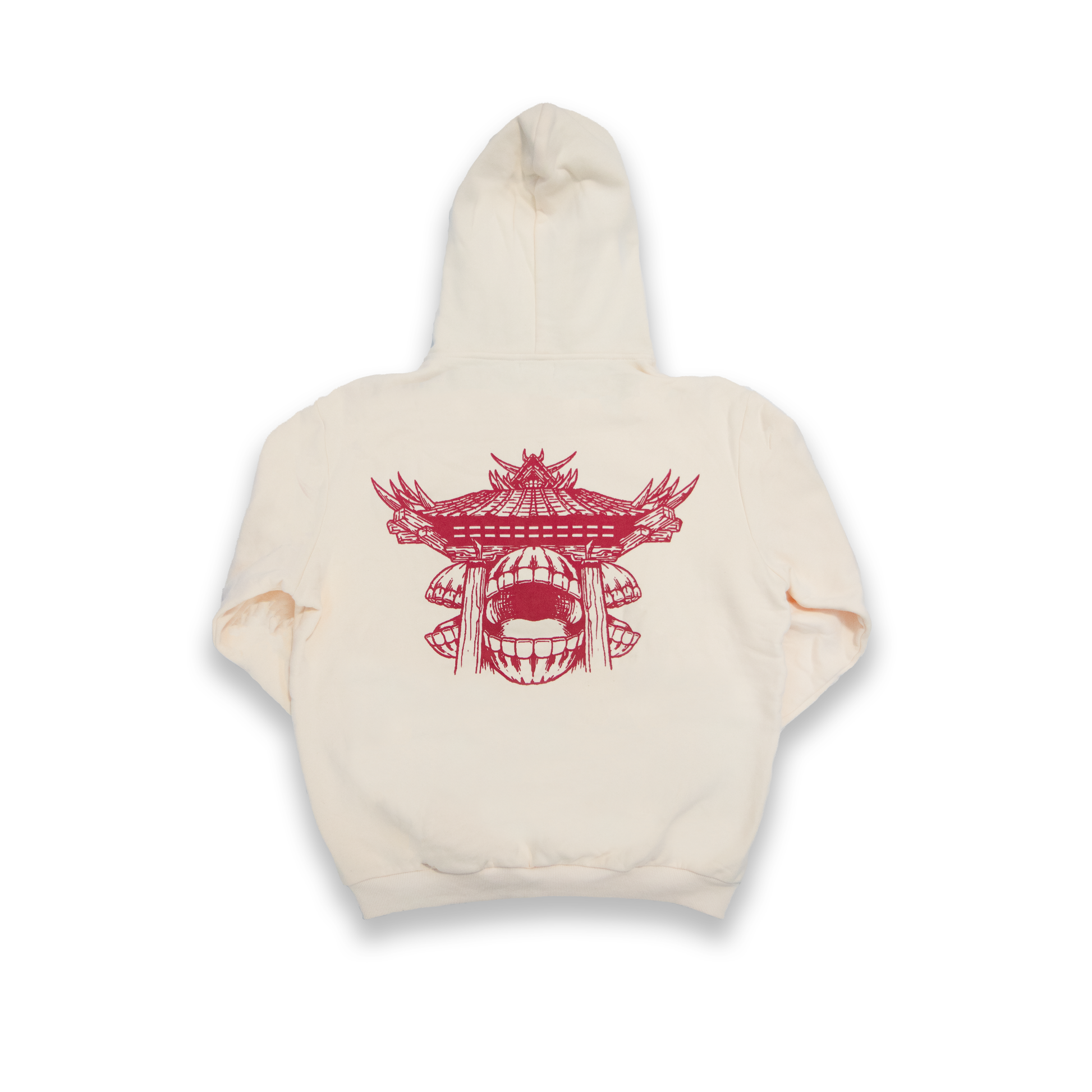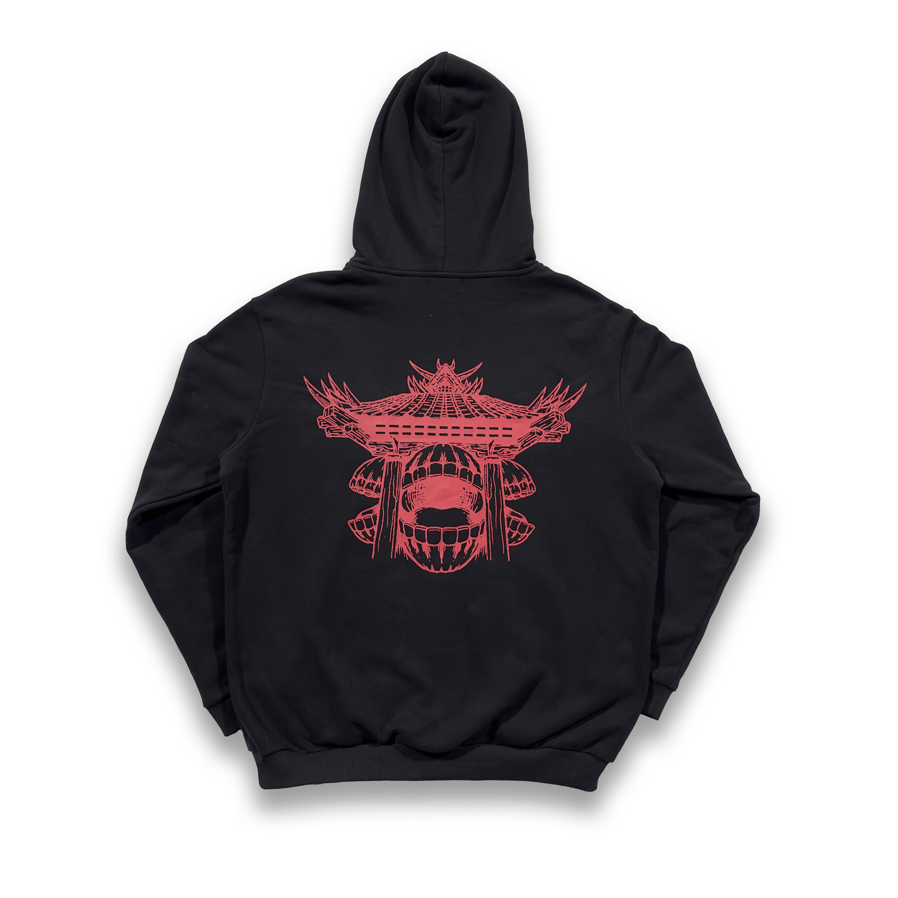 The Kenjaku's Curse Hoodie in Stone Red is crafted from luxury heavyweight cotton, with a relaxed fit. It features embroidery on the front and the hood, as well as a large graphic on the back. The hoodie has ribbed hems and cuffs and is finished with a Shihiko sleeve tag.