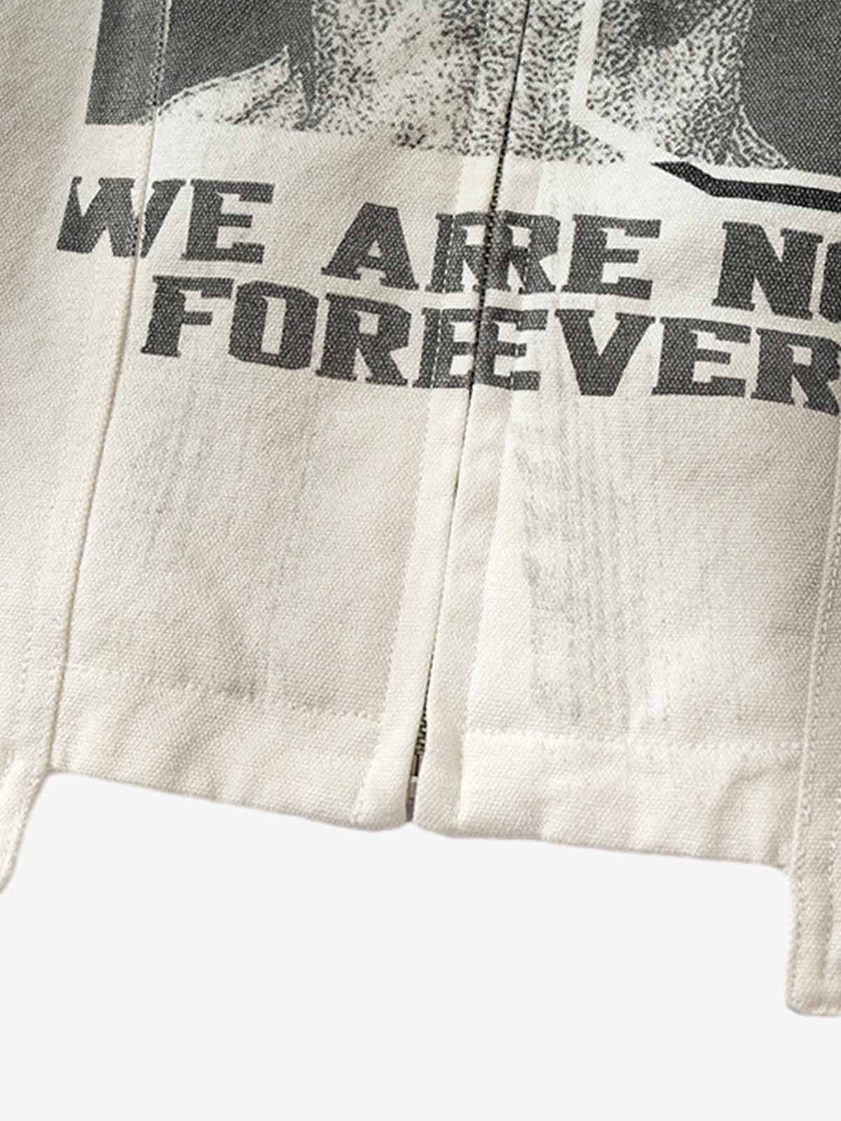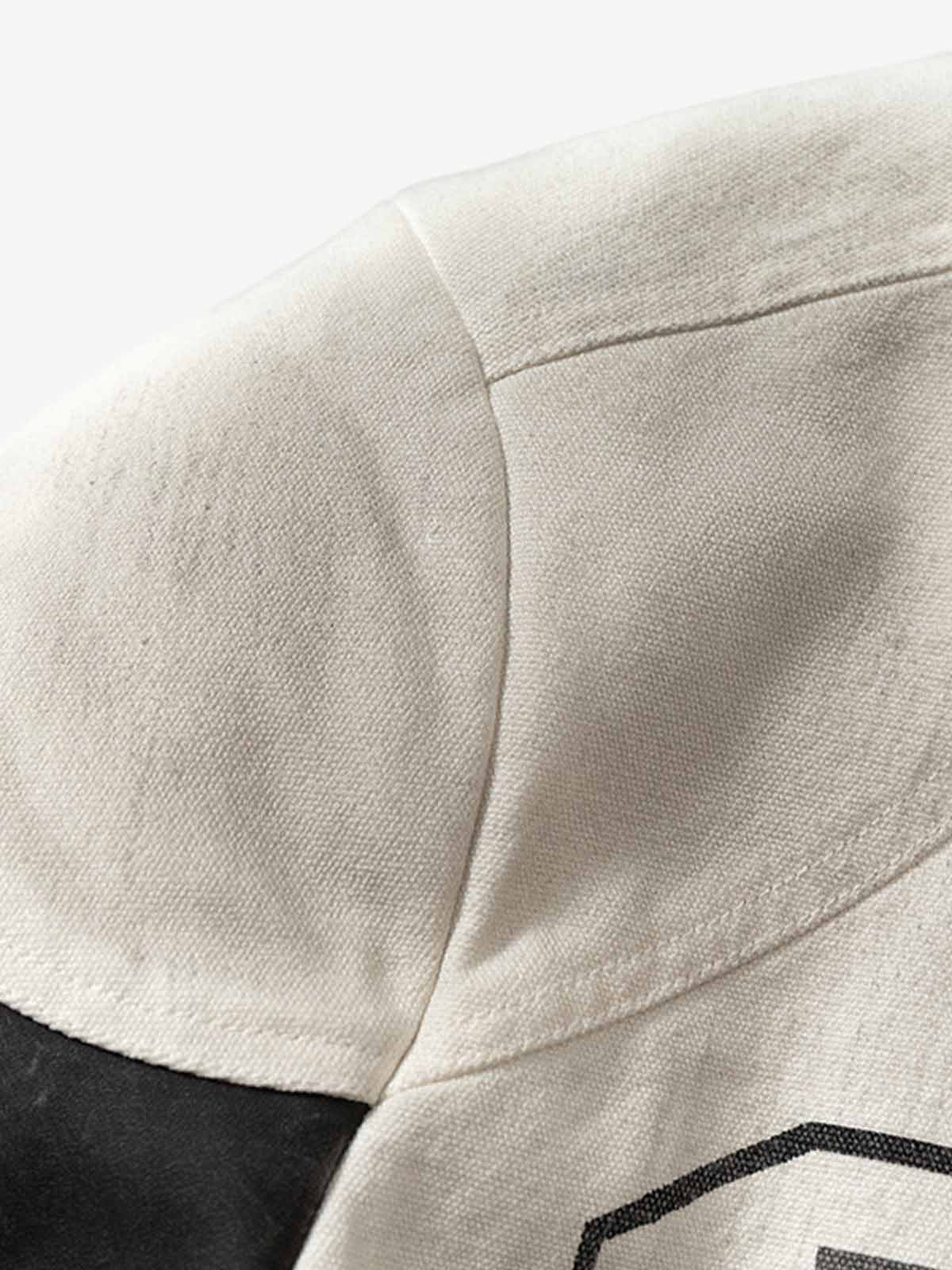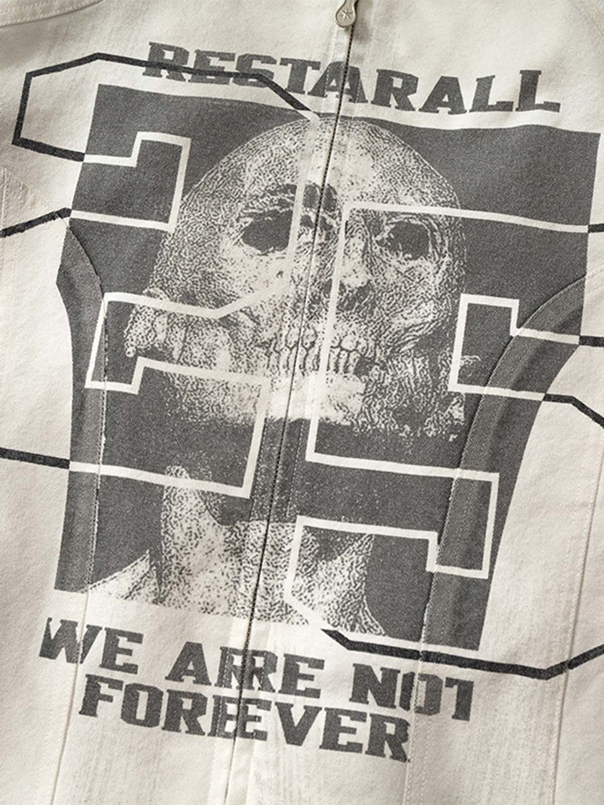 • Design Elements: Bold skull graphic with geometric patterns, text print on the front, high collar design
