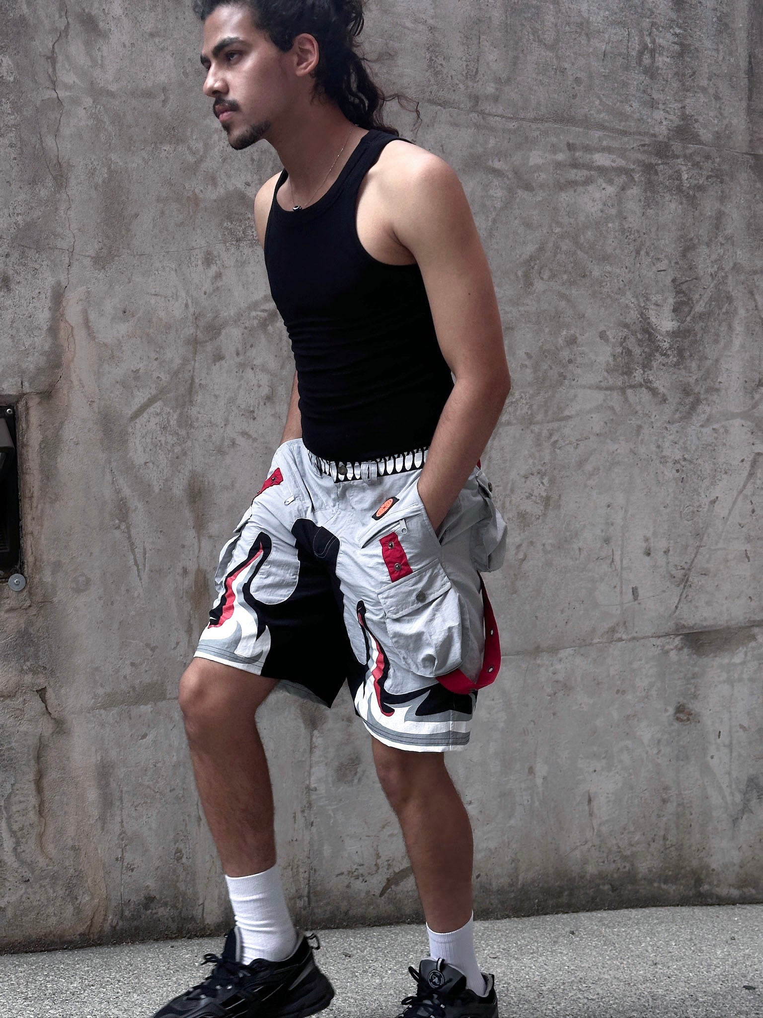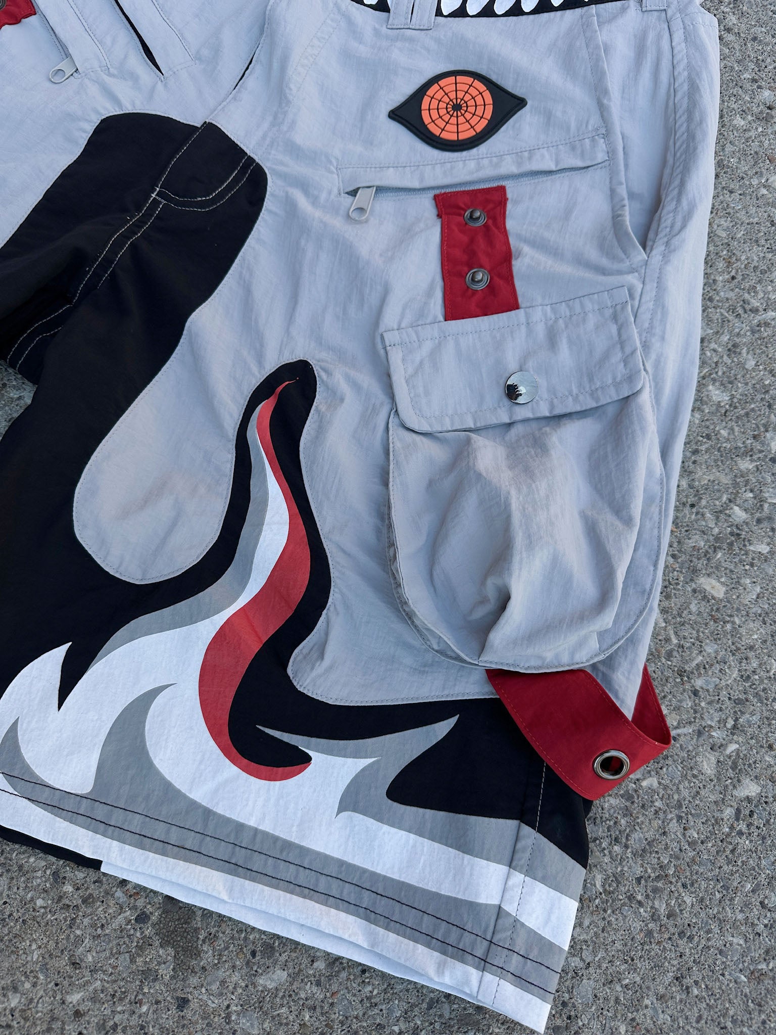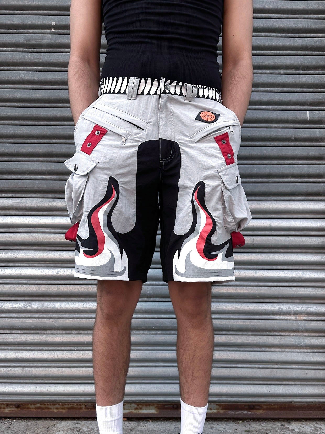 We made these shorts of high-quality nylon material with a bunch of pockets! It has 7 pockets in total, with 3 pockets on the front with zippers. The designs are made of a rubber patch and screen-printed elements. Above-the-knee length is perfect for warm weather.