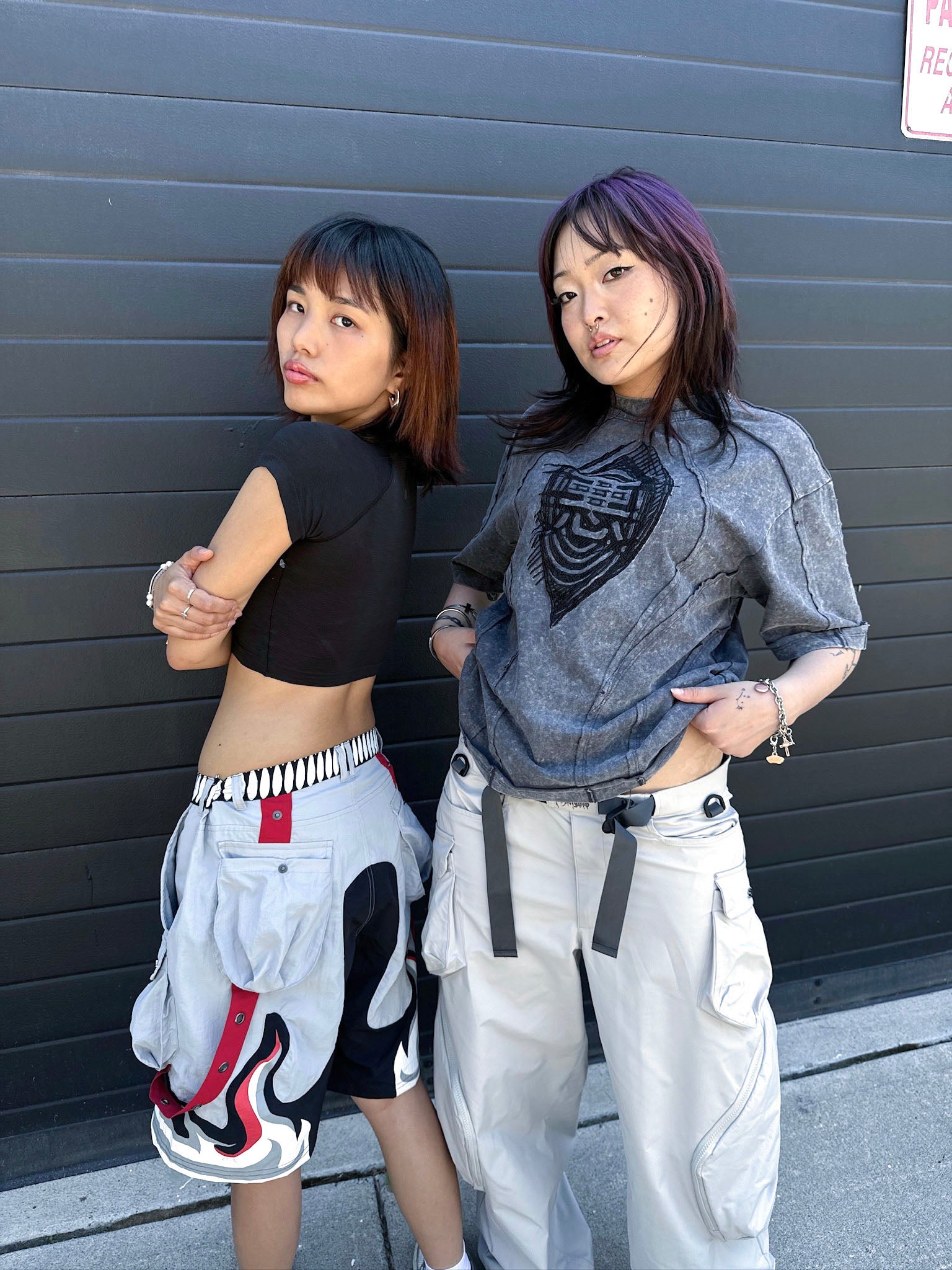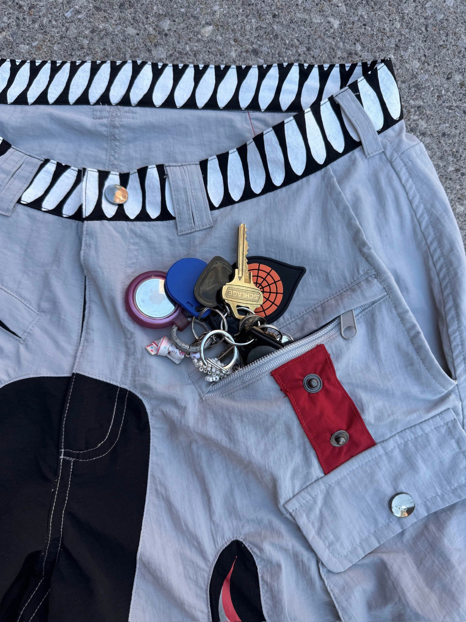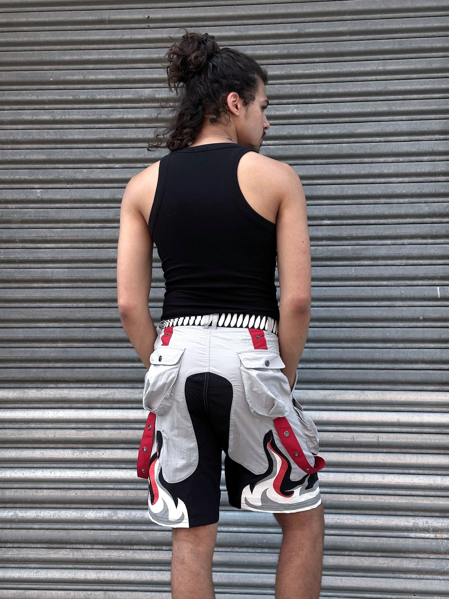 We made these shorts of high-quality nylon material with a bunch of pockets! It has 7 pockets in total, with 3 pockets on the front with zippers. The designs are made of a rubber patch and screen-printed elements. Above-the-knee length is perfect for warm weather.
