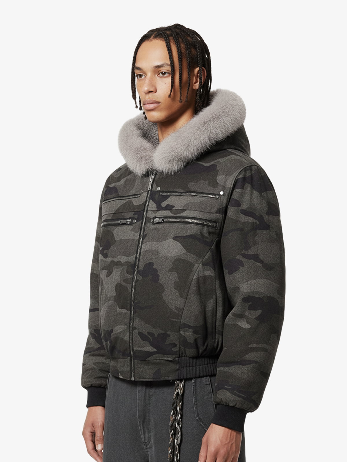 • Design Elements: Camouflage pattern, faux fur hood, multiple zippers
