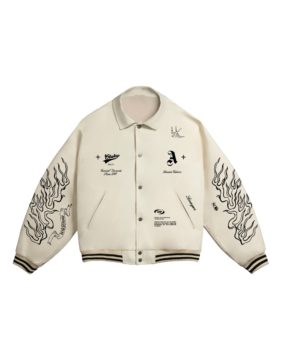 • A light bomber jacket made of denim fabric of a classic silhouette with a turn-down collar, elastic knitted garters at the cuffs and along the hem. The bomber jacket is equipped with welt pockets on both sides. Fastens with branded buttons. The print is made with a film with a gold metallic effect.