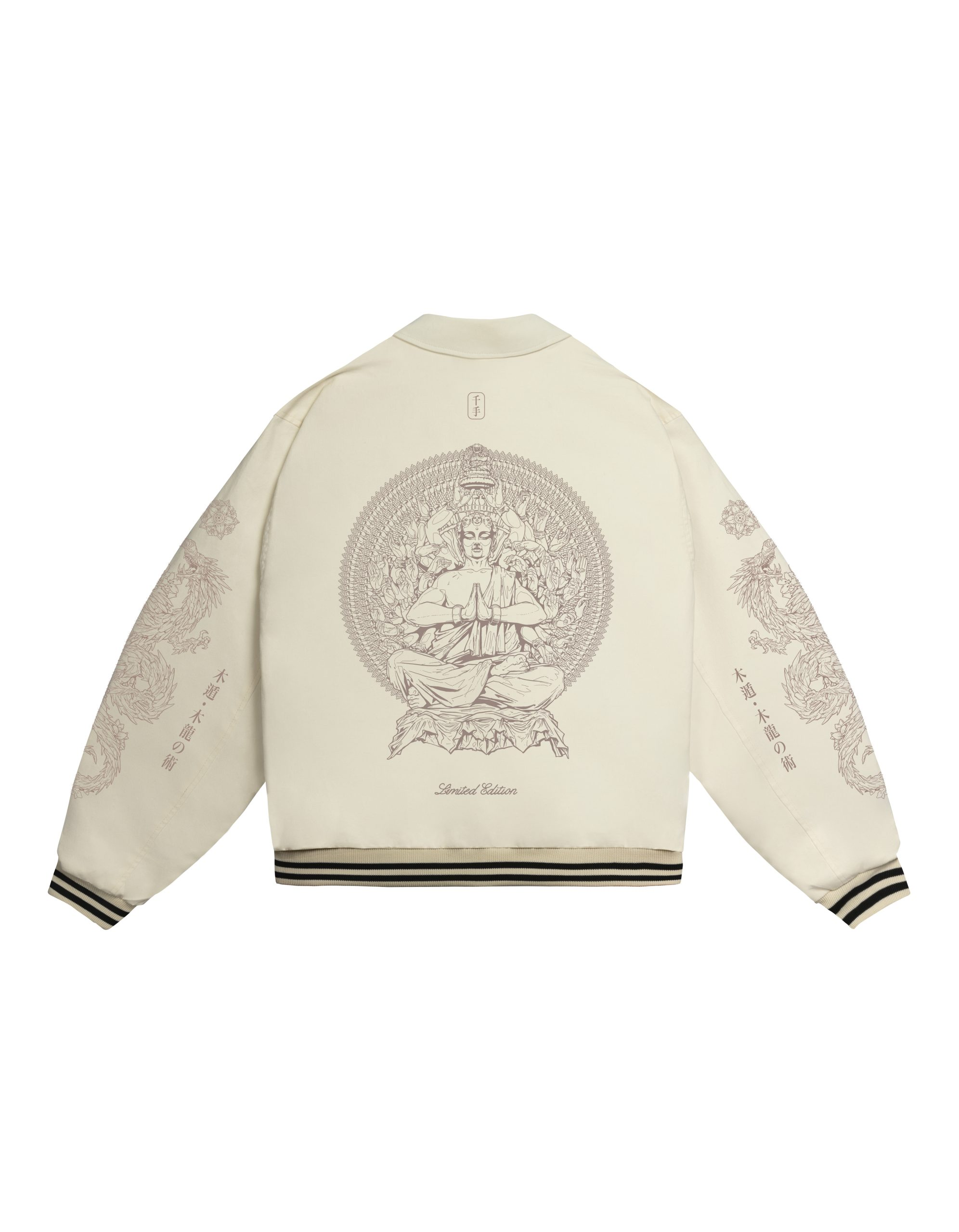 • A light bomber jacket made of denim fabric of a classic silhouette with a turn-down collar, elastic knitted garters at the cuffs and along the hem. The bomber jacket is equipped with welt pockets on both sides. Fastens with branded buttons. The print is made with a film with a gold metallic effect.