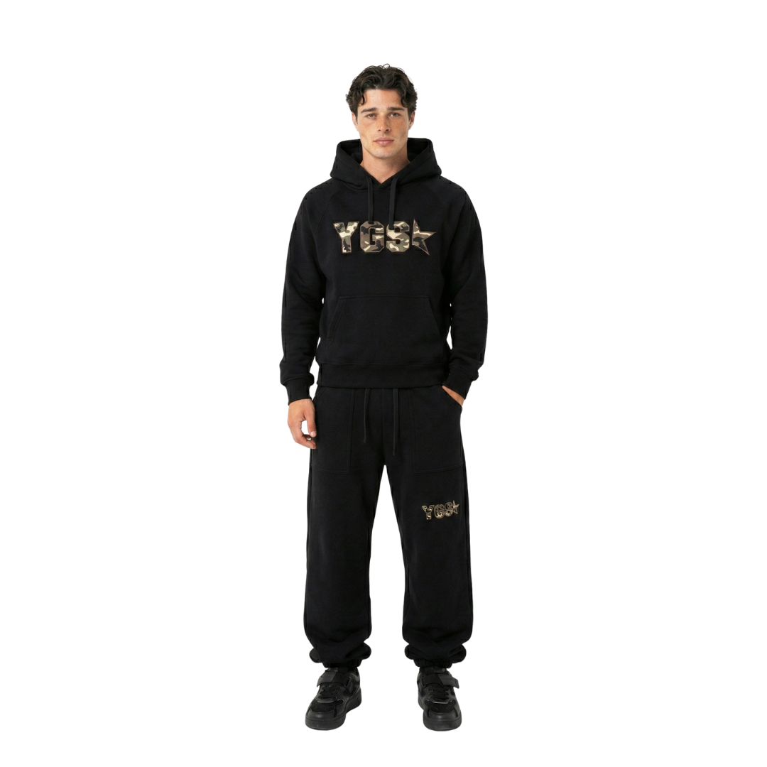 Clean, bold, and effortlessly comfortable, this black hoodie & jogger set is designed for everyday wear with a strong streetwear identity. The hoodie features a classic fit with a front kangaroo pocket and a standout YGS logo across the chest, adding a subtle statement to a timeless silhouette.
